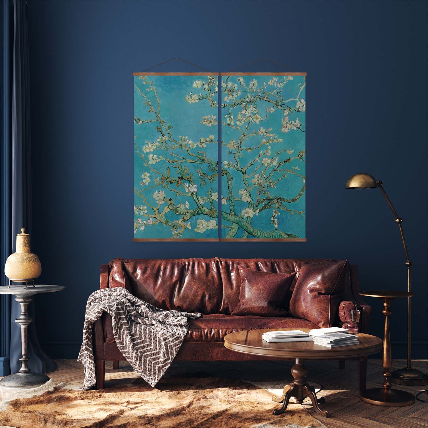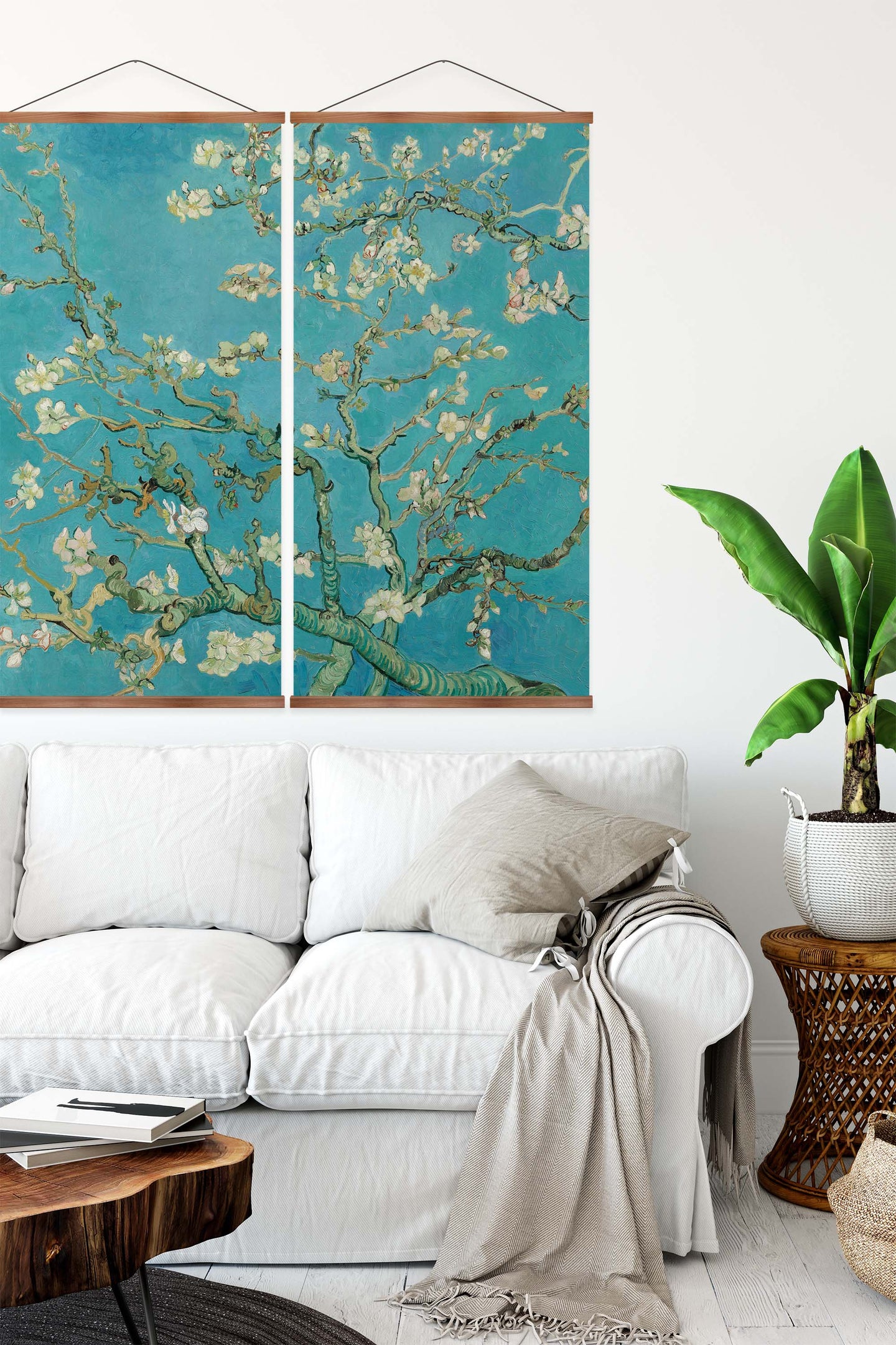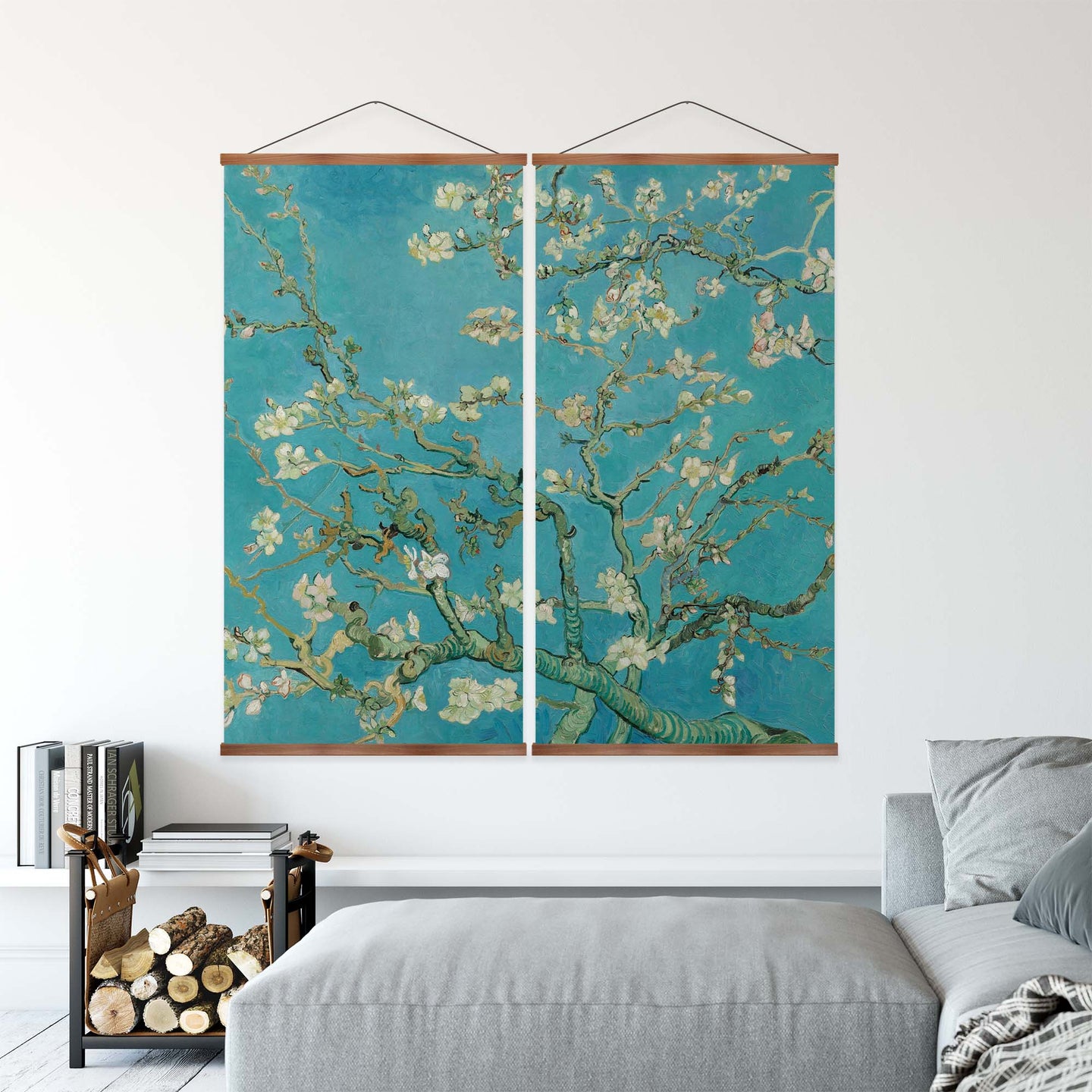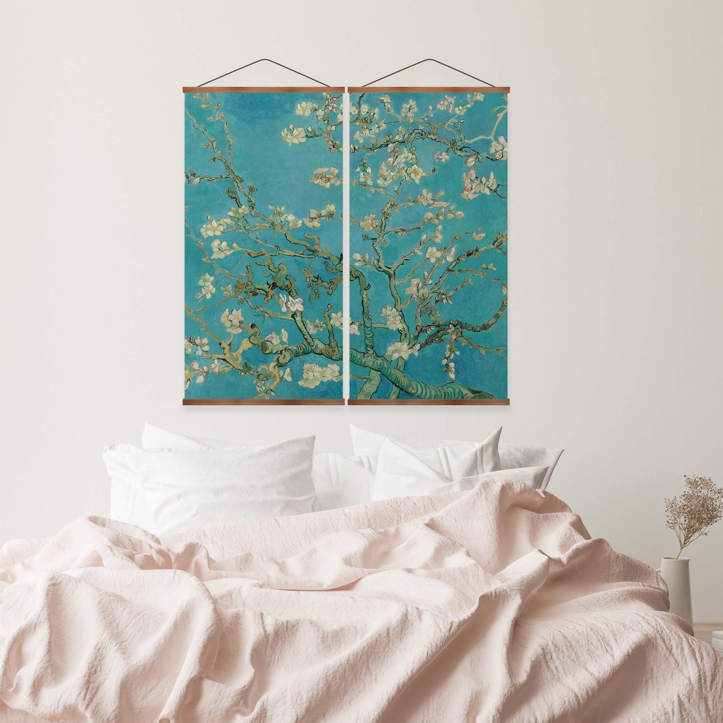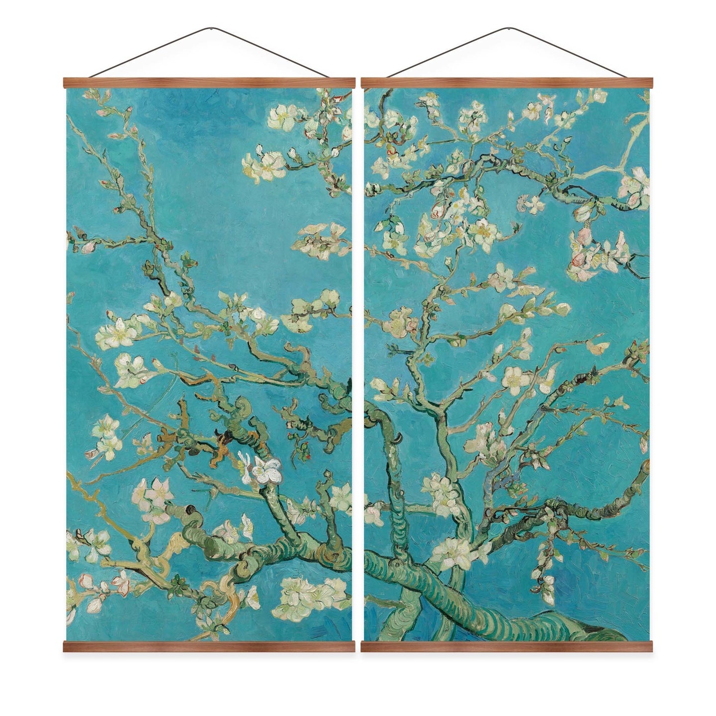 Create an instant room transformation, with the canvas tapestry print: 'Almond Blossoms'. Printed on luxury 260g canvas, Tapestro canvas tapestries hang from magnetic wooden holders, in either teak or black wood. Supplied with a teak hanger. This print measures: 120cm x 120cm (47in x 47in). Supplied in: 2 Panels. For each item sold, one tree is planted. This helps to offset carbon released during production and shipping, and to create a net positive contribution over the tree's lifetime. Transform your home, and our planet.