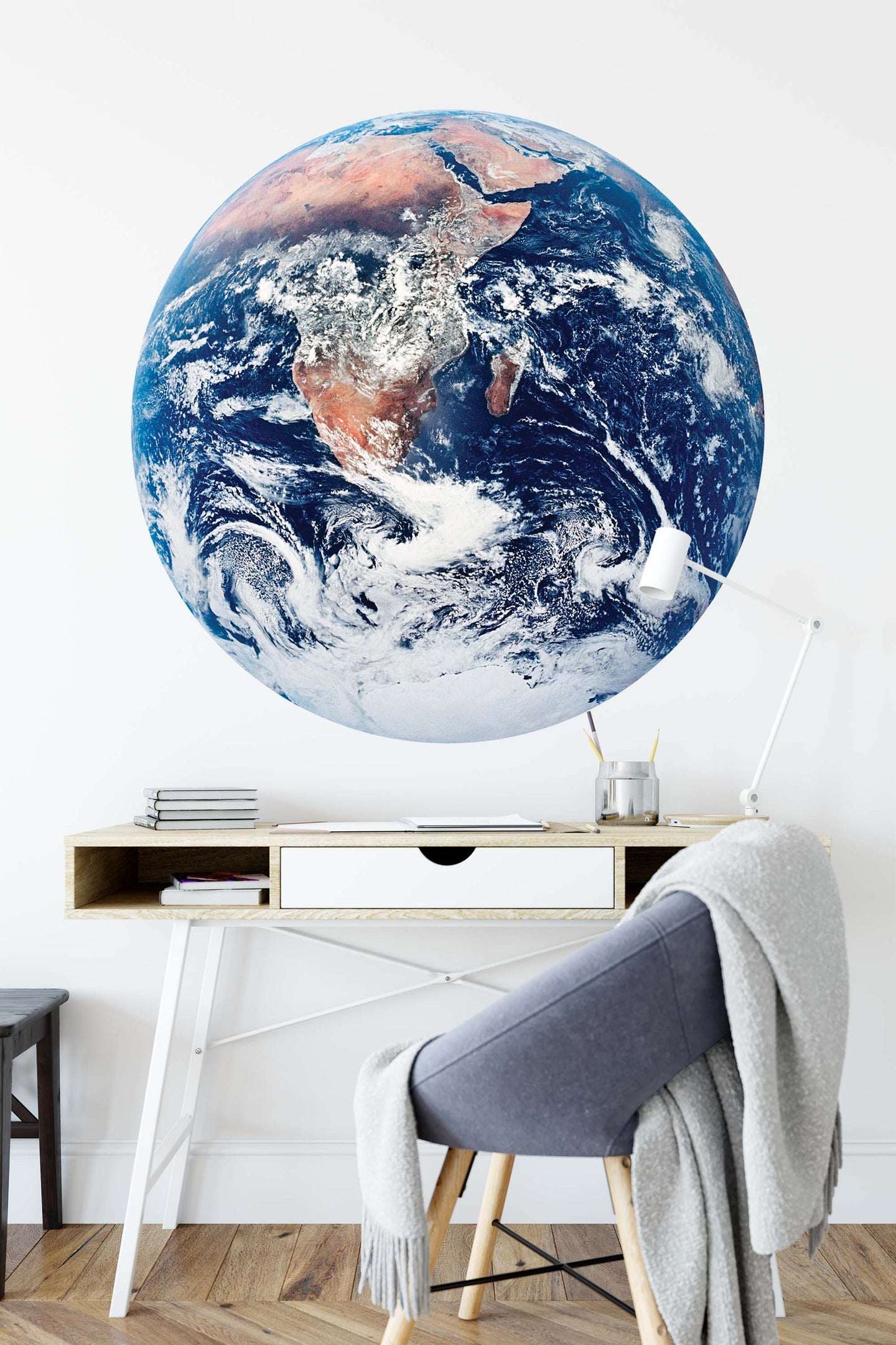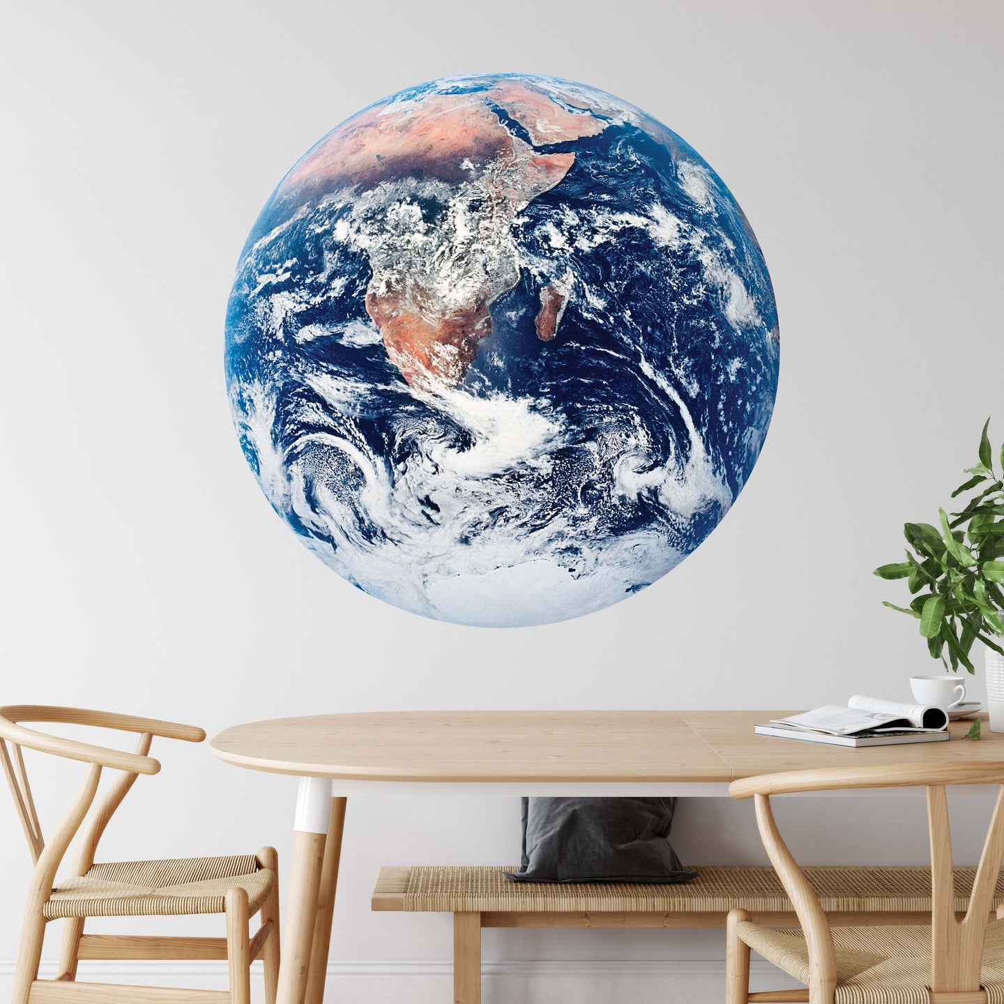 Create a beautiful focal point in your room, with the self-adhesive art circle: 'Blue Marble'. Each circle measures an extra-large 100cm in diameter, and is supplied in a single self-adhesive piece. Install on your wall in less than 5 minutes. For each item sold, one tree is planted. This helps to offset carbon released during production and shipping, and to create a net positive contribution over the tree's lifetime. Transform your home, and our planet.