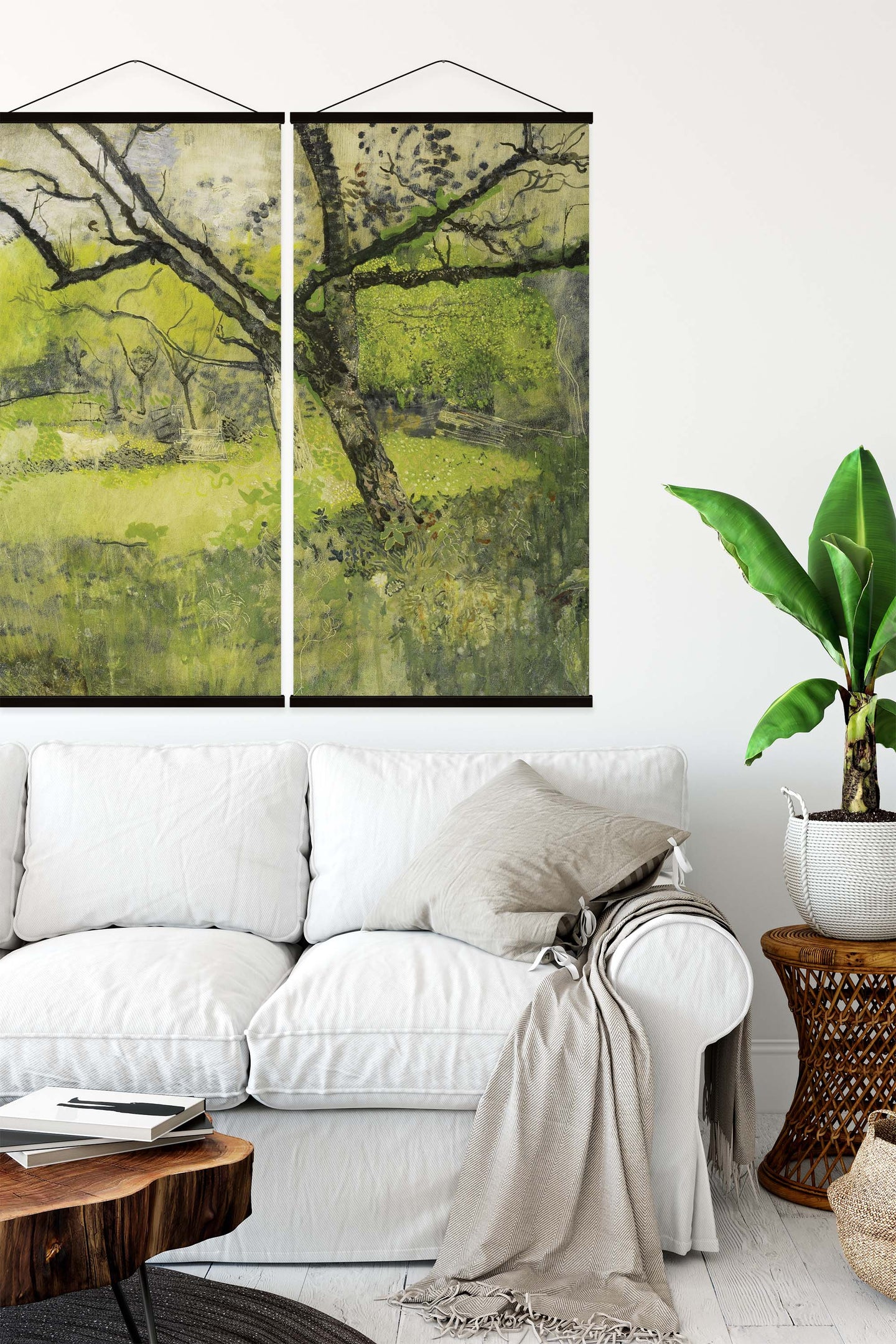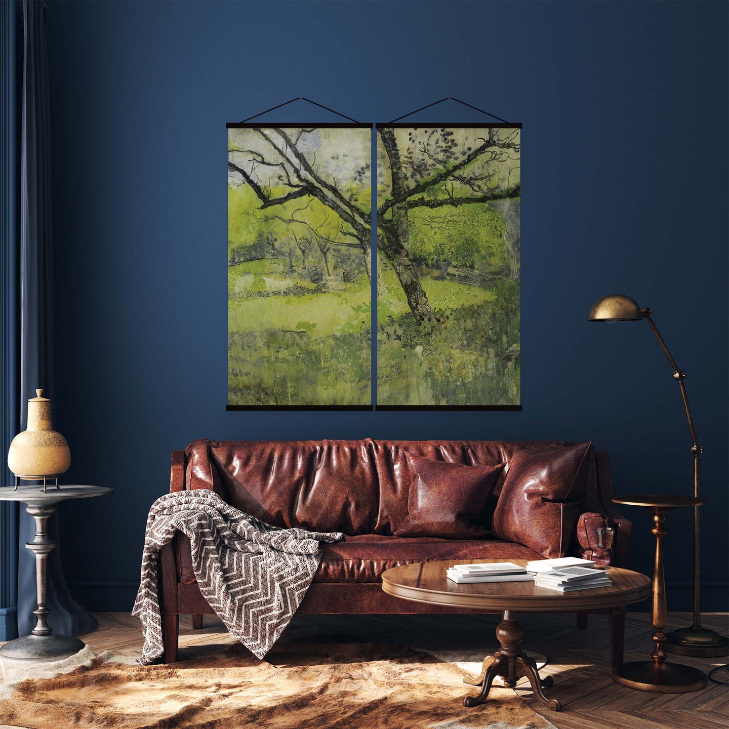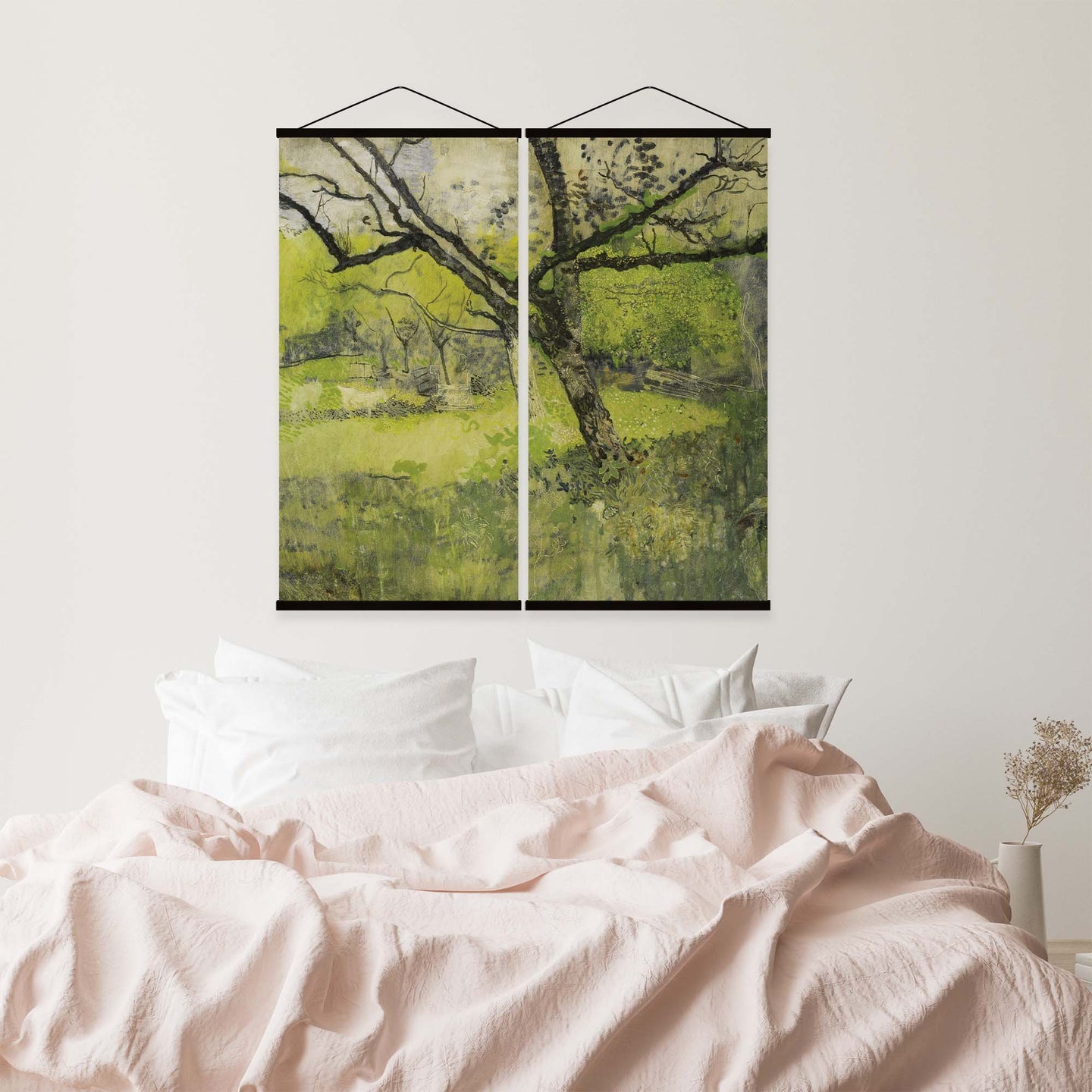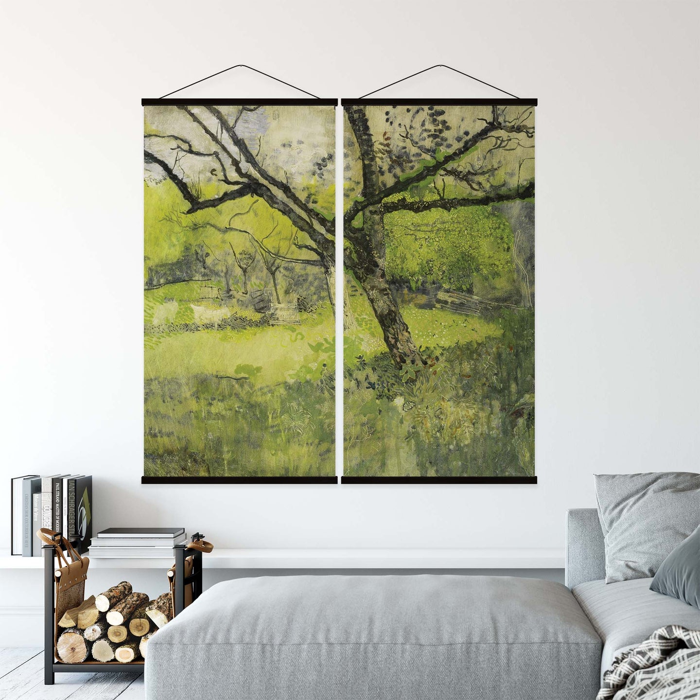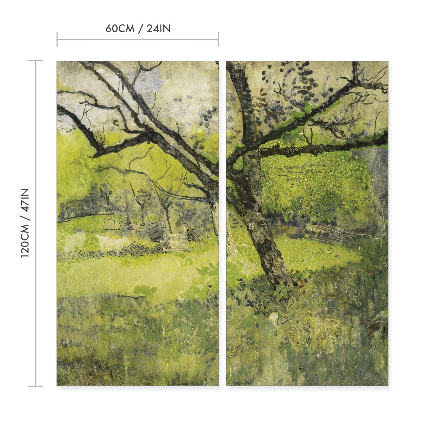 Create an instant room transformation, with the canvas tapestry print: 'The Orchard'. Printed on luxury 260g canvas, Tapestro canvas tapestries hang from magnetic wooden holders, in either teak or black wood. Supplied with a black hanger. This print measures: 120cm x 120cm (47in x 47in). Supplied in: 2 Panels. For each item sold, one tree is planted. This helps to offset carbon released during production and shipping, and to create a net positive contribution over the tree's lifetime. Transform your home, and our planet.