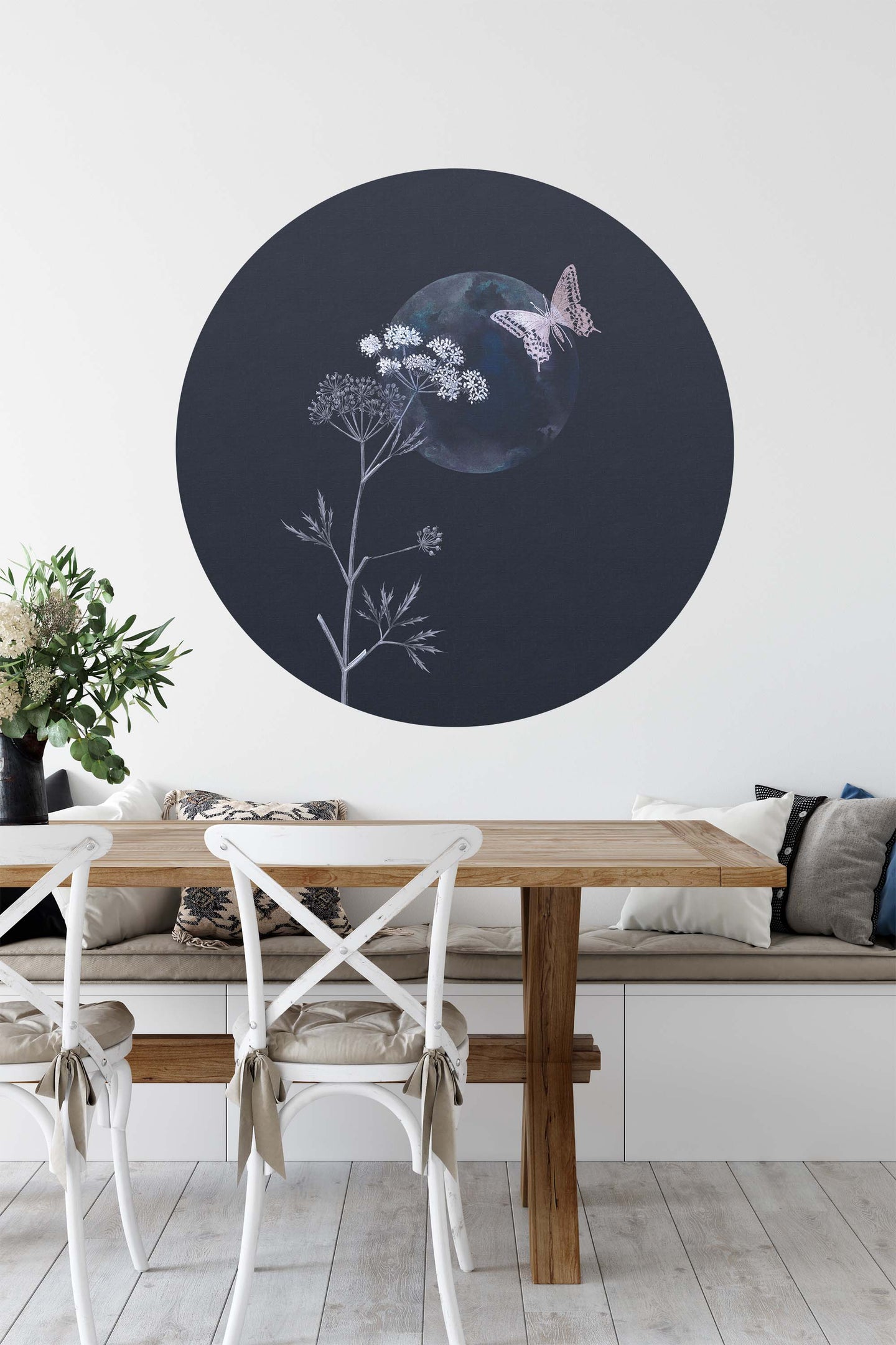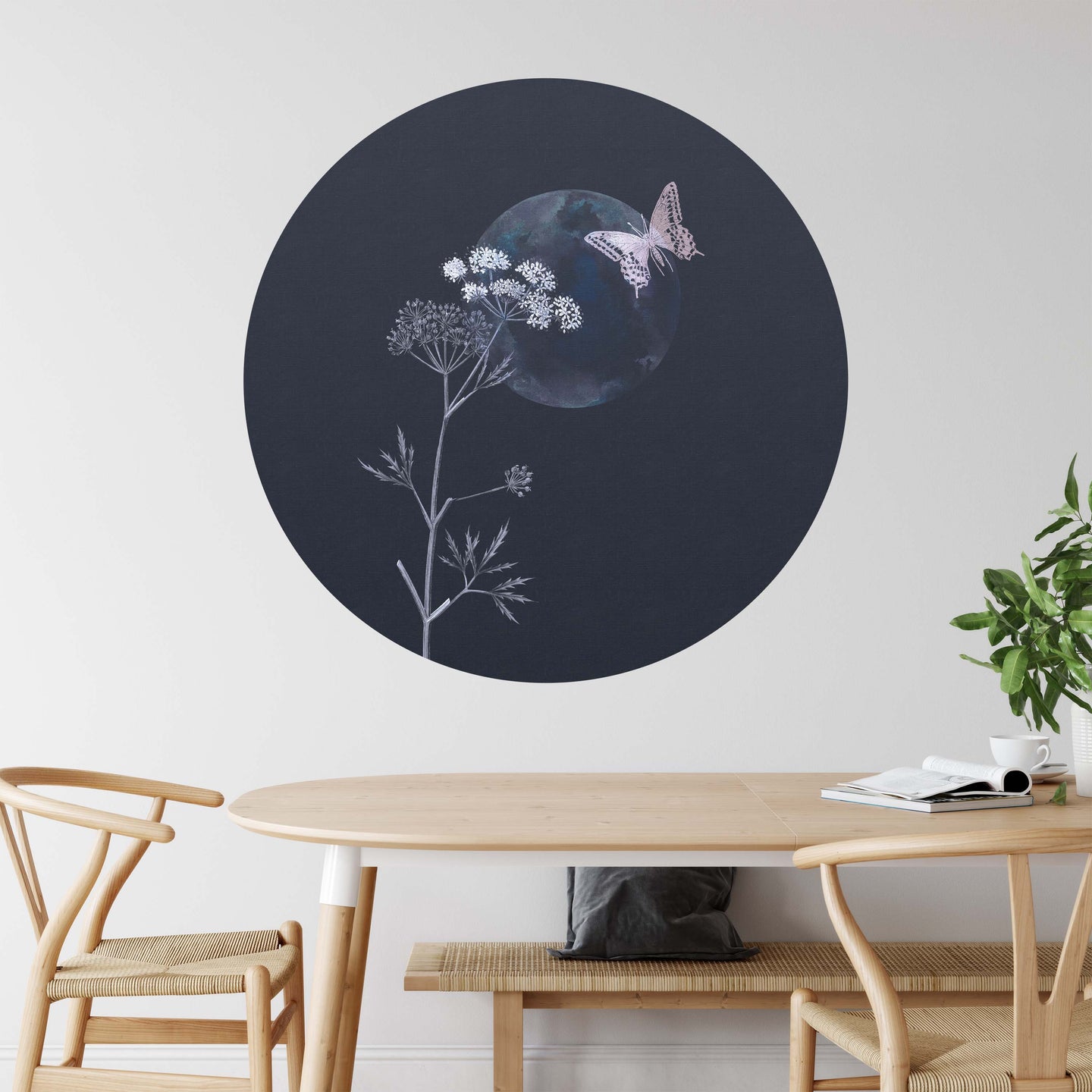 Create a beautiful focal point in your room, with the self-adhesive art circle: 'Evening Flutter'. Each circle measures an extra-large 100cm in diameter, and is supplied in a single self-adhesive piece. Install on your wall in less than 5 minutes. For each item sold, one tree is planted. This helps to offset carbon released during production and shipping, and to create a net positive contribution over the tree's lifetime. Transform your home, and our planet.