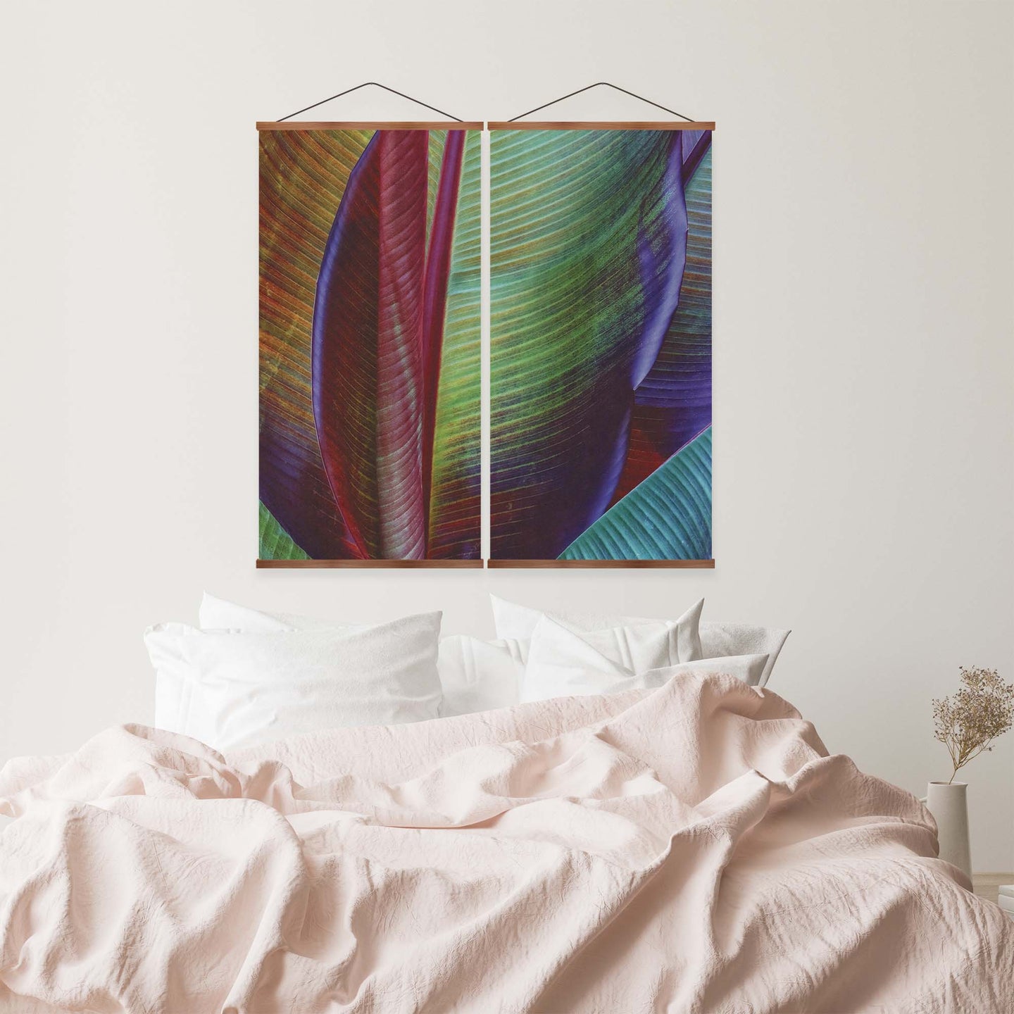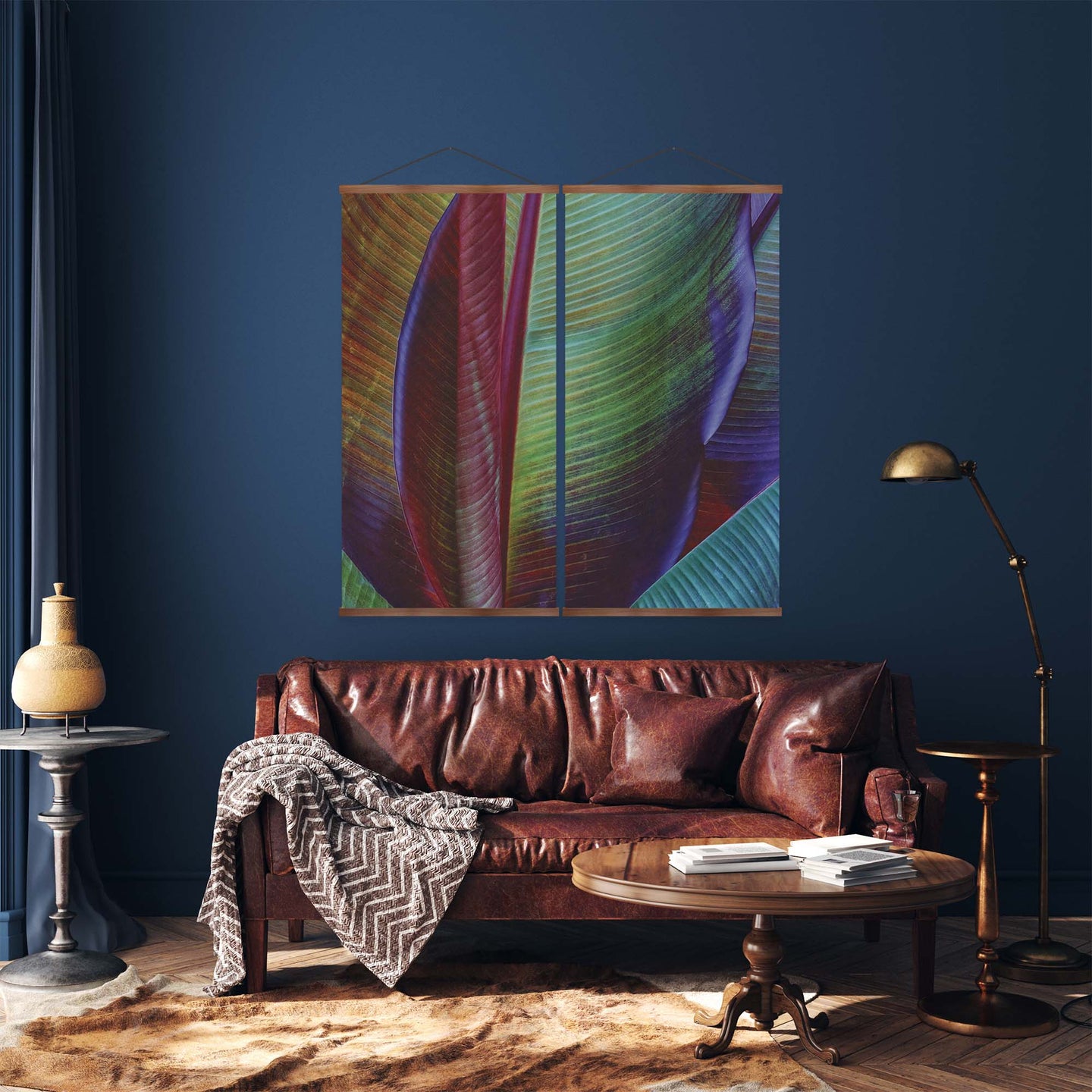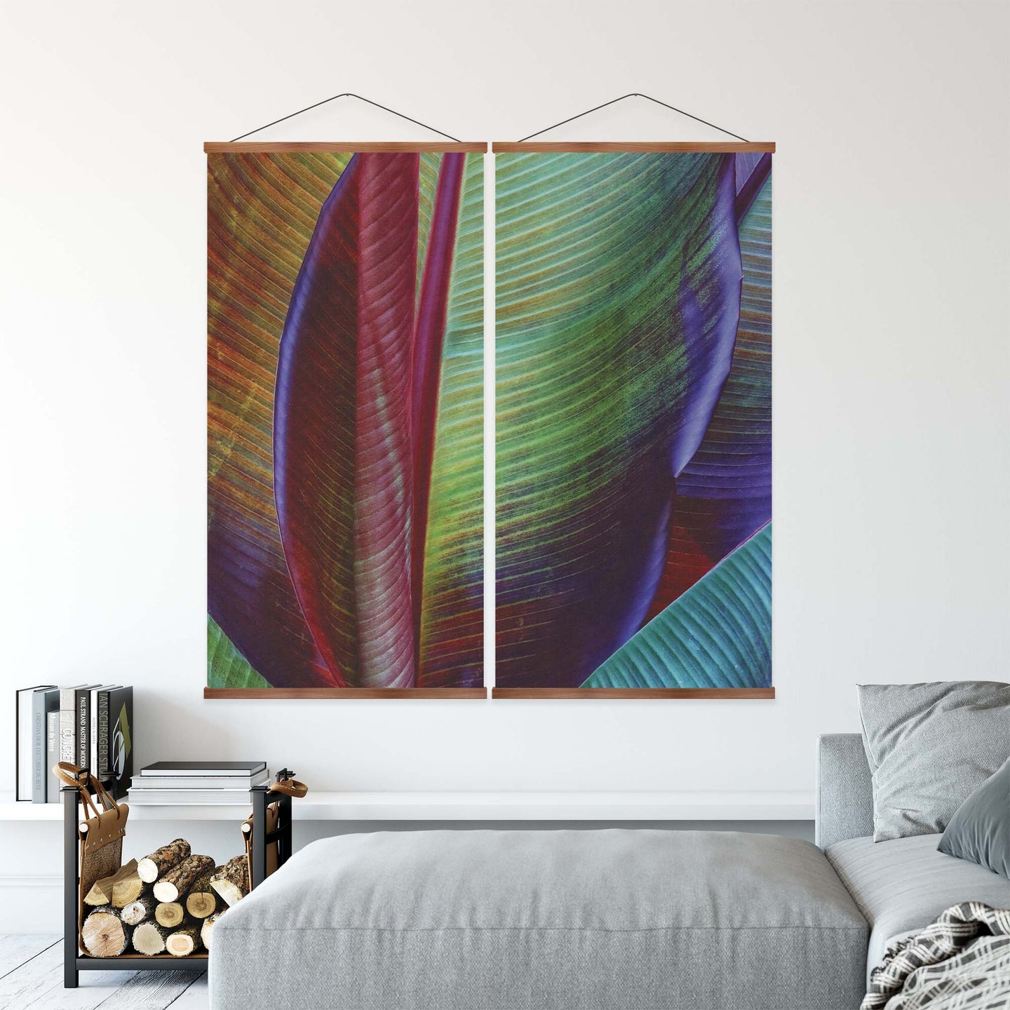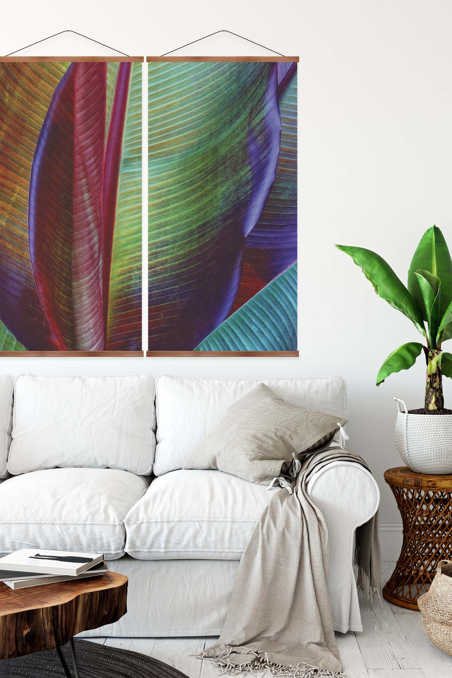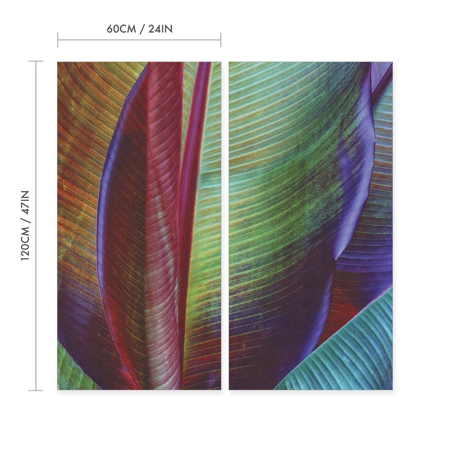 Create an instant room transformation, with the canvas tapestry print: 'Banana Leaf by François Casanova'. Printed on luxury 260g canvas, Tapestro canvas tapestries hang from magnetic wooden holders, in either teak or black wood. Supplied with a teak hanger. This print measures: 120cm x 120cm (47in x 47in). Supplied in: 2 Panels. For each item sold, one tree is planted. This helps to offset carbon released during production and shipping, and to create a net positive contribution over the tree's lifetime. Transform your home, and our planet.