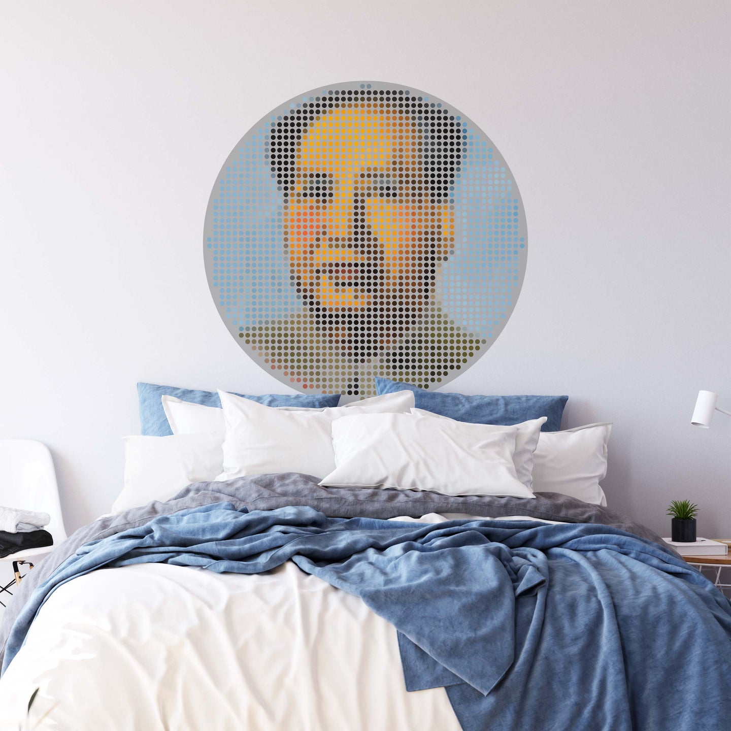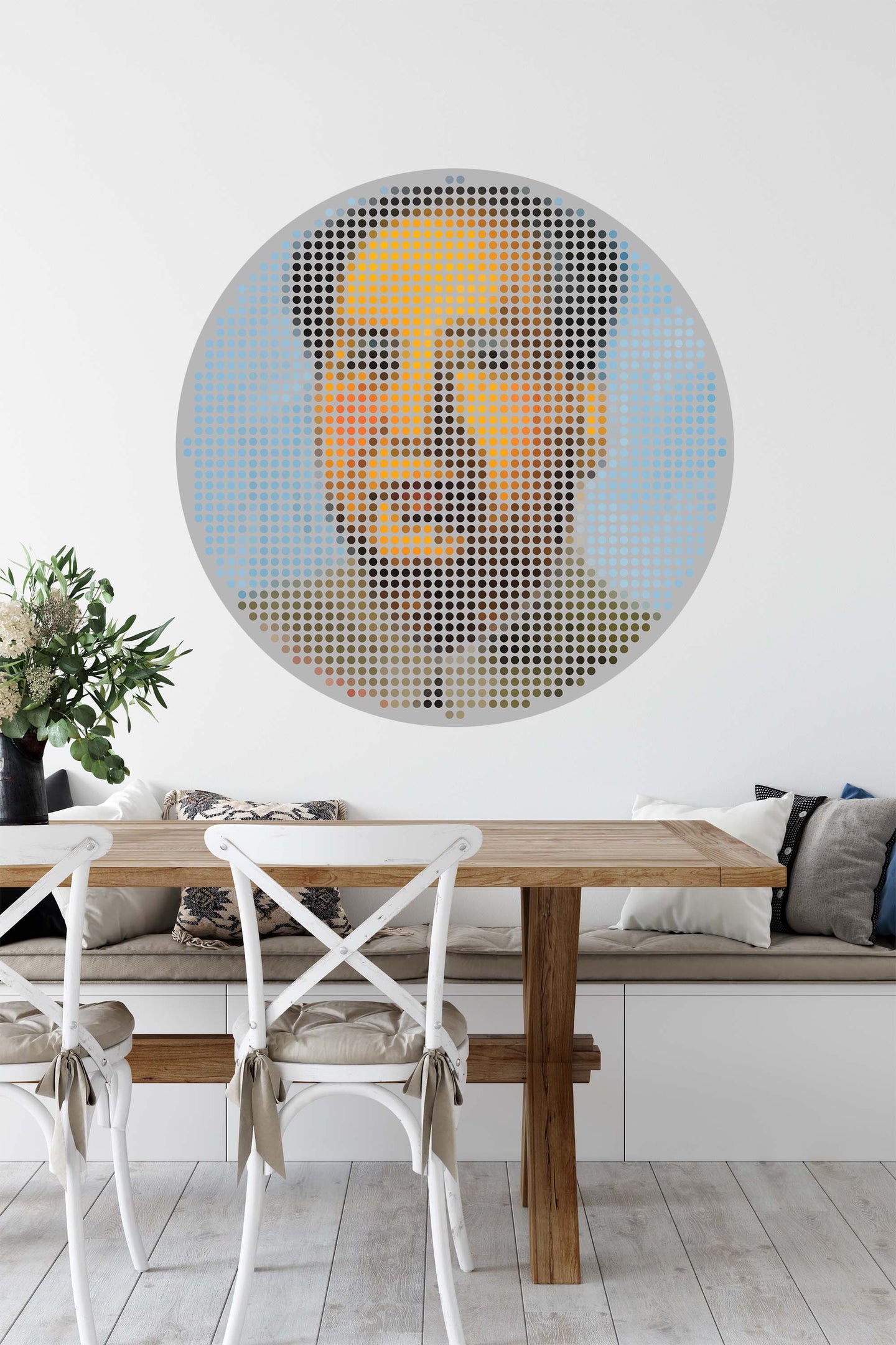 Create a beautiful focal point in your room, with the self-adhesive art circle: 'Iconiq Mao'. Each circle measures an extra-large 100cm in diameter, and is supplied in a single self-adhesive piece. Install on your wall in less than 5 minutes. For each item sold, one tree is planted. This helps to offset carbon released during production and shipping, and to create a net positive contribution over the tree's lifetime. Transform your home, and our planet.