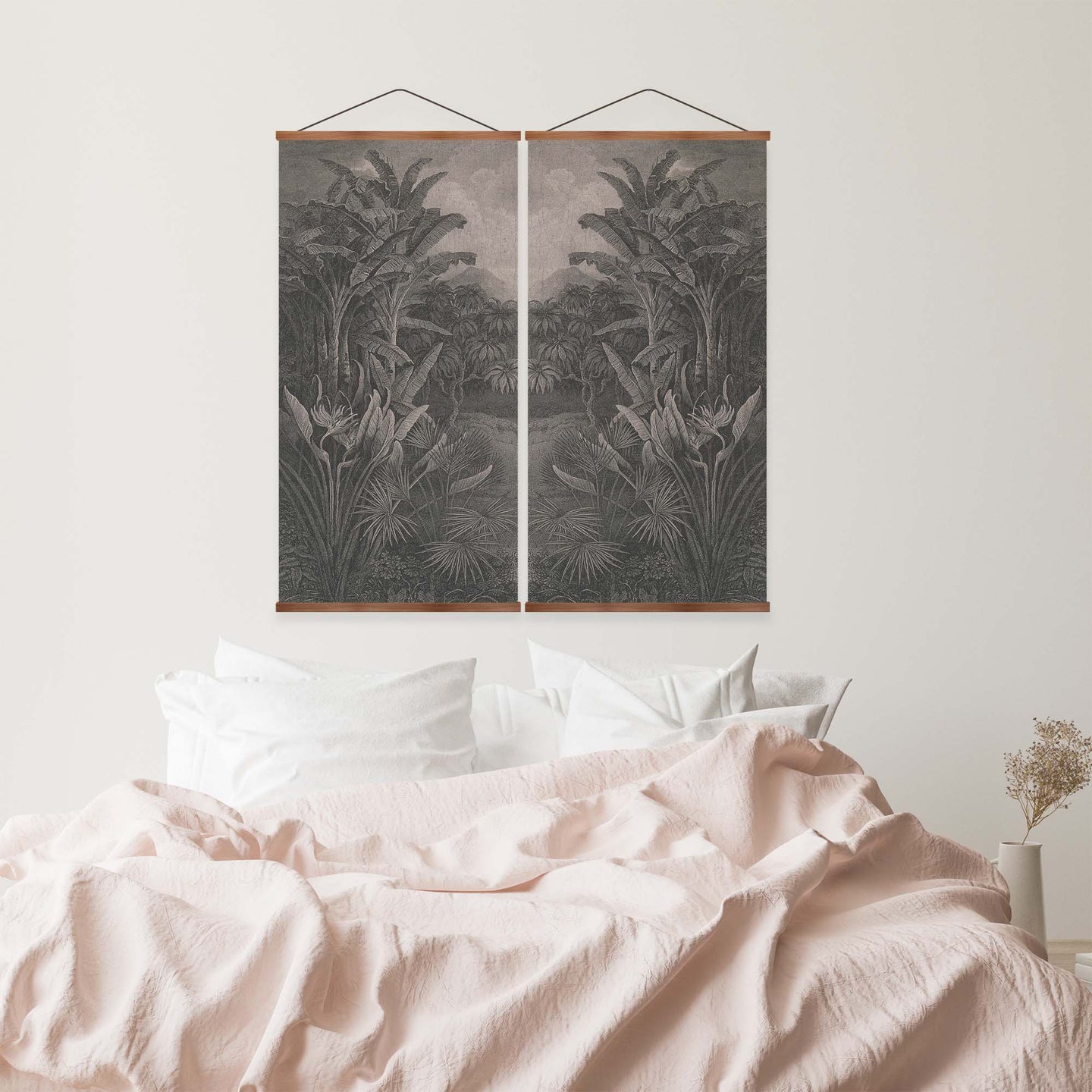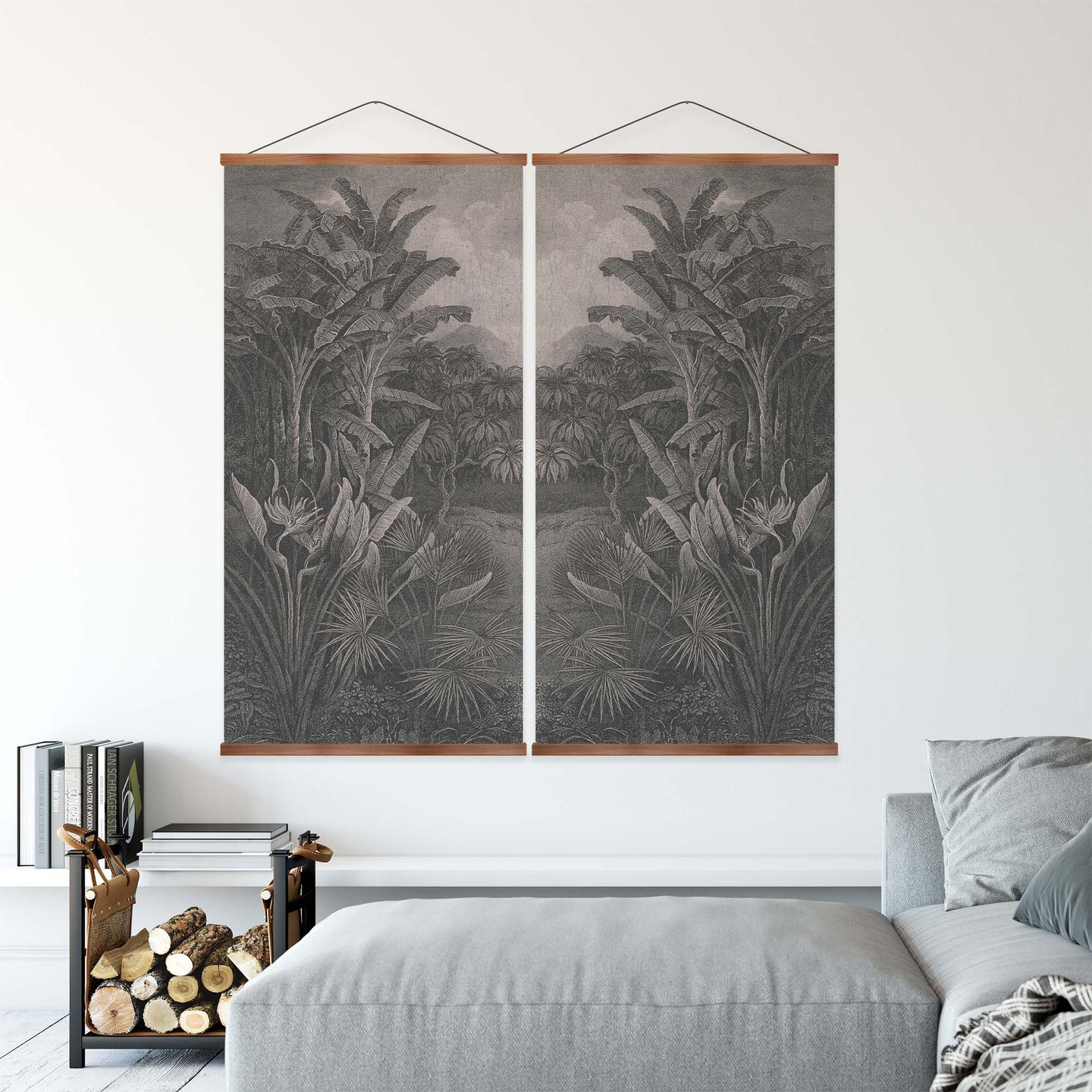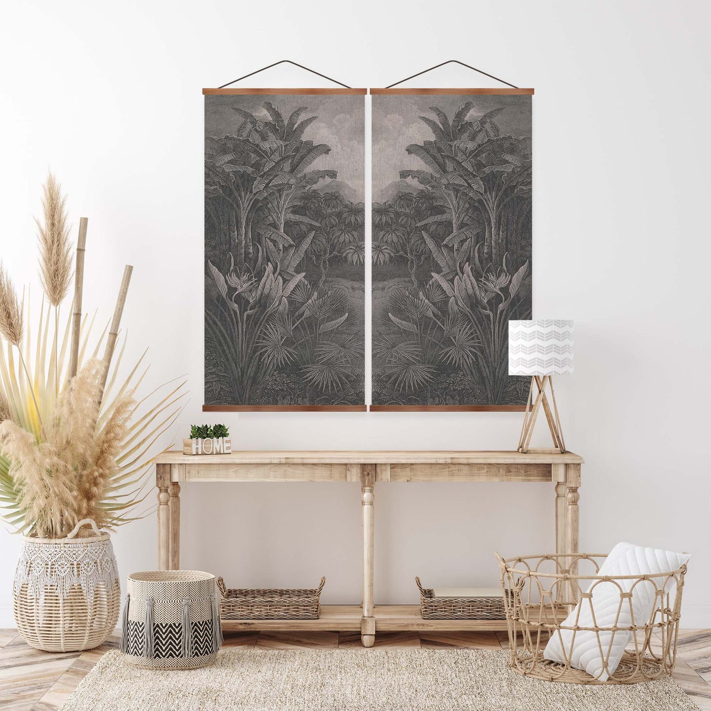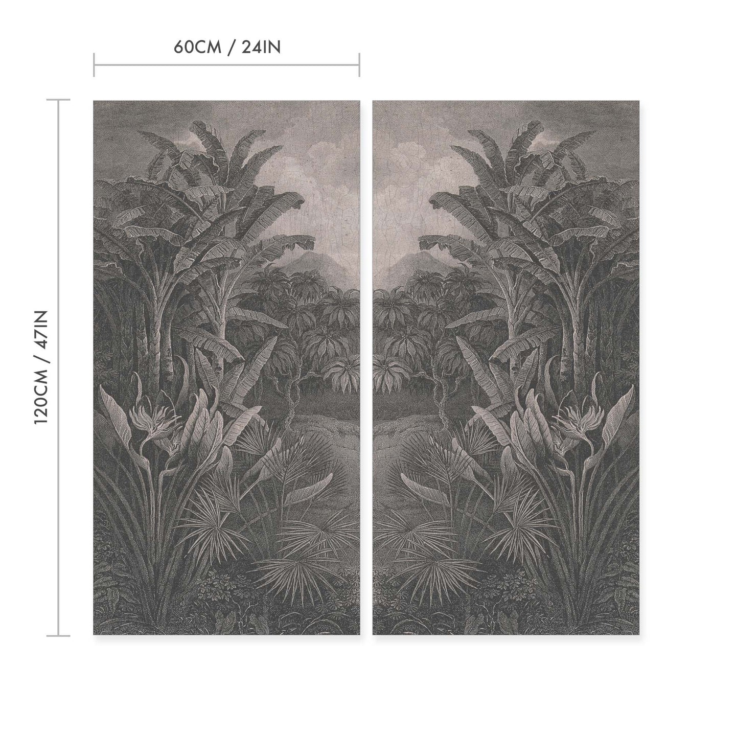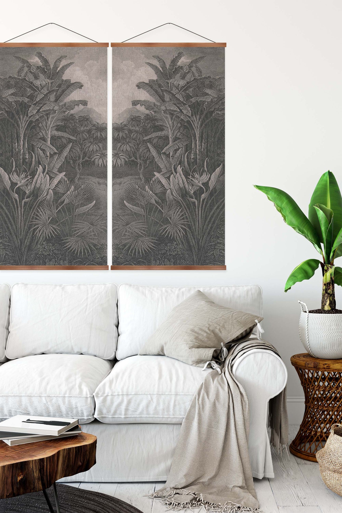 Create an instant room transformation, with the canvas tapestry print: 'Jungle Noir'. Printed on luxury 260g canvas, Tapestro canvas tapestries hang from magnetic wooden holders, in either teak or black wood. Supplied with a teak hanger. This print measures: 120cm x 120cm (47in x 47in). Supplied in: 2 Panels. For each item sold, one tree is planted. This helps to offset carbon released during production and shipping, and to create a net positive contribution over the tree's lifetime. Transform your home, and our planet.