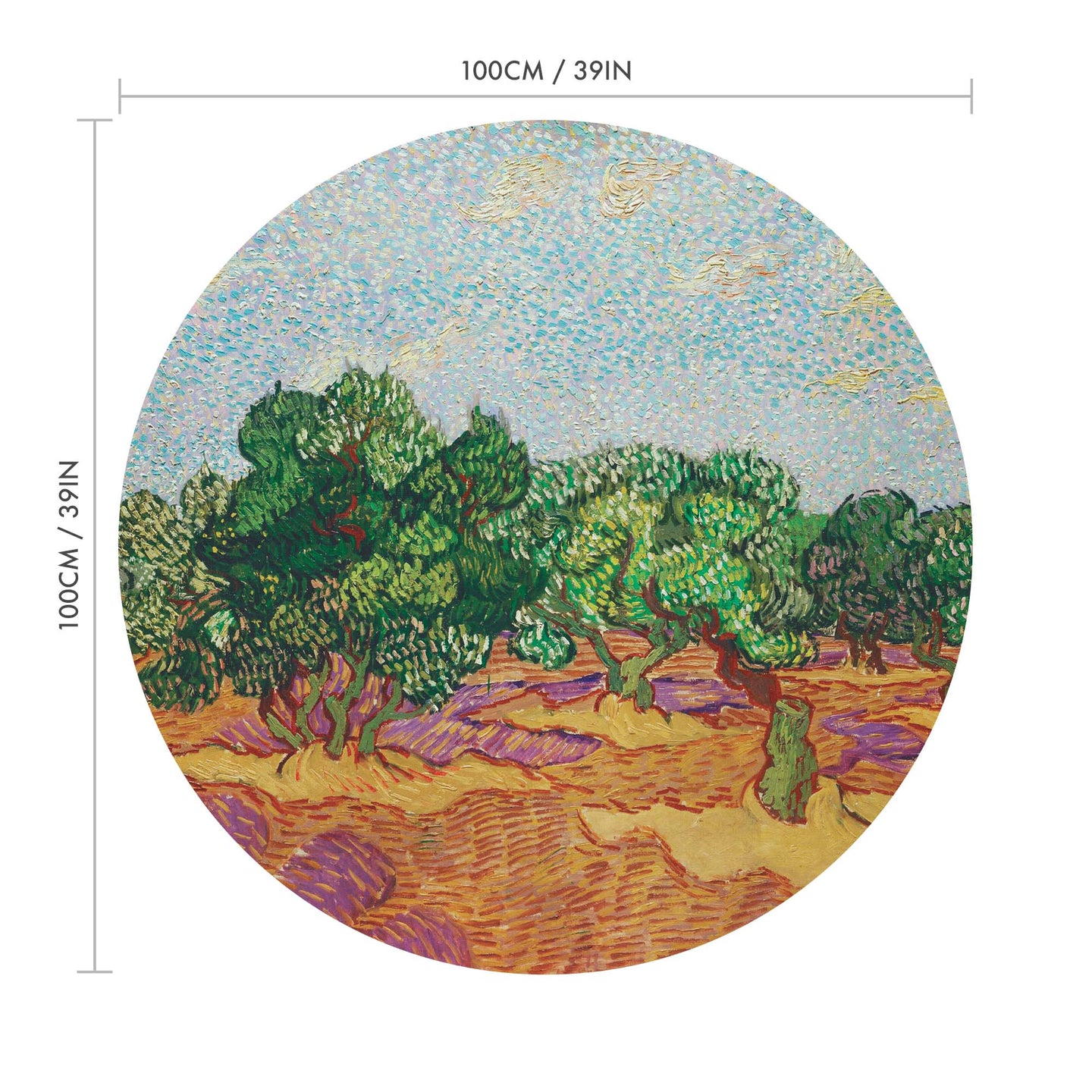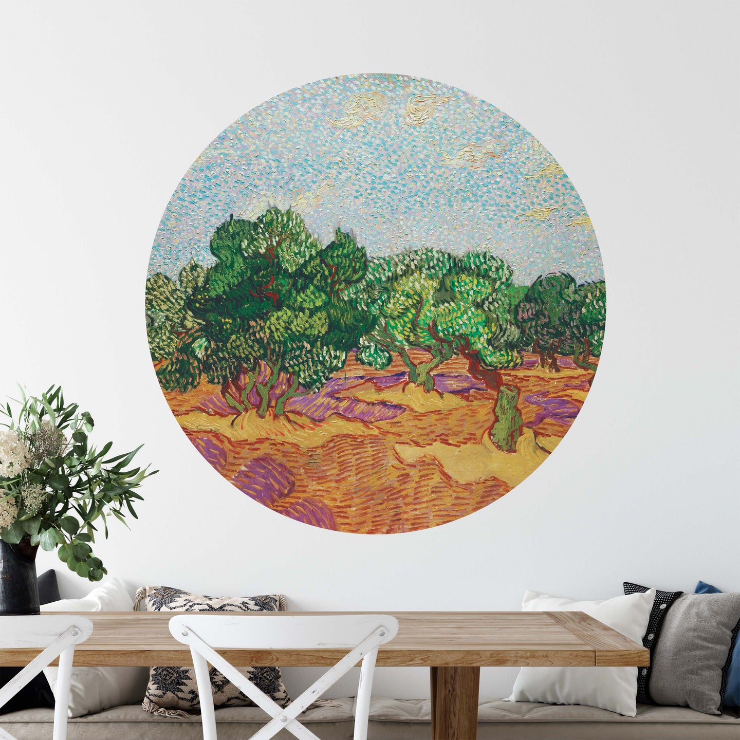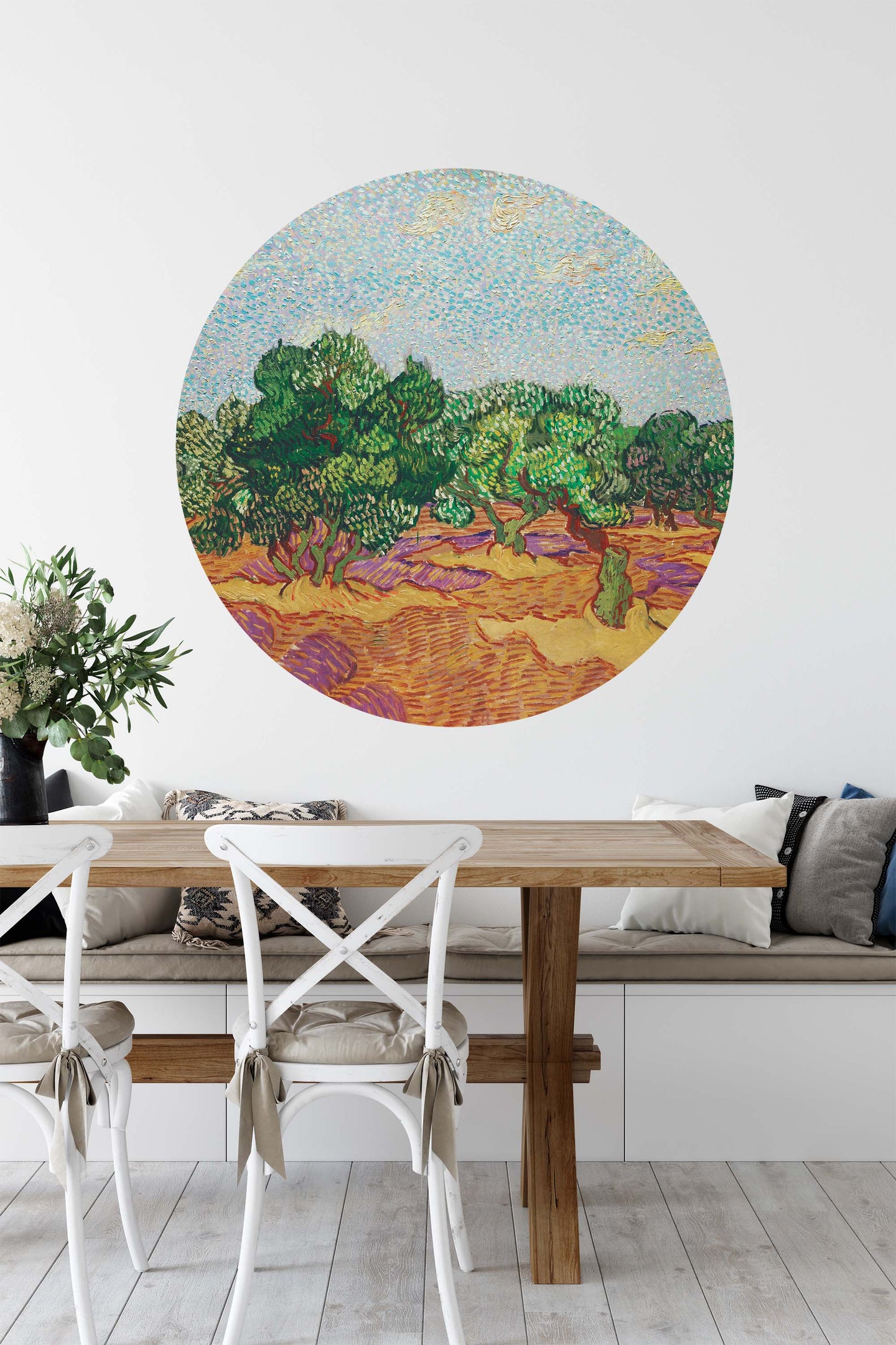 Create a beautiful focal point in your room, with the self-adhesive art circle: 'The Olive Trees'. Each circle measures an extra-large 100cm in diameter, and is supplied in a single self-adhesive piece. Install on your wall in less than 5 minutes. For each item sold, one tree is planted. This helps to offset carbon released during production and shipping, and to create a net positive contribution over the tree's lifetime. Transform your home, and our planet.