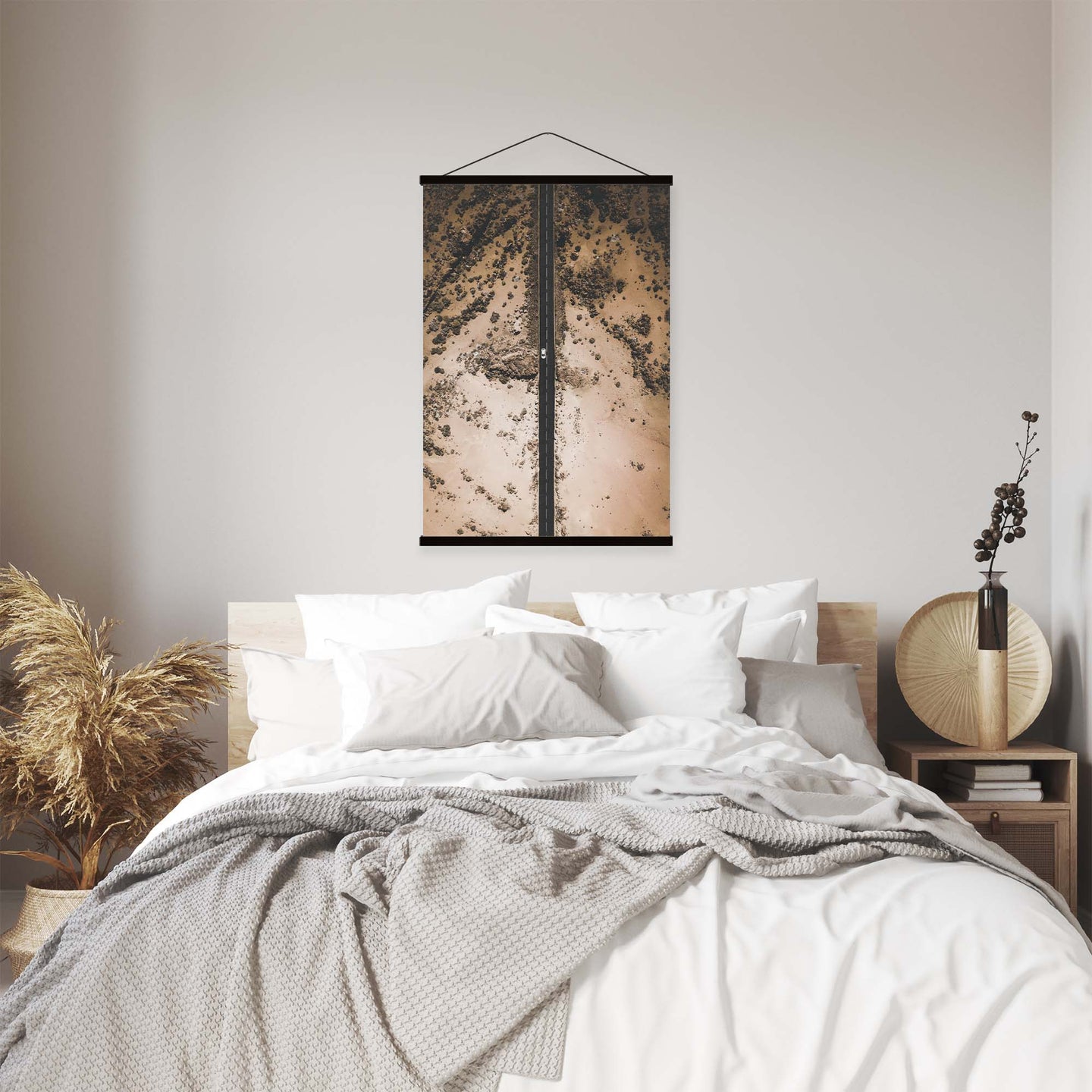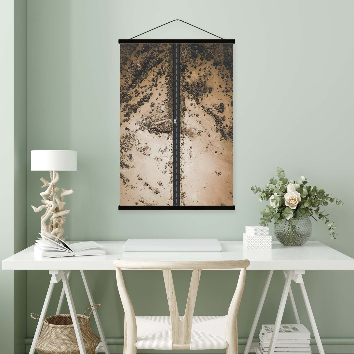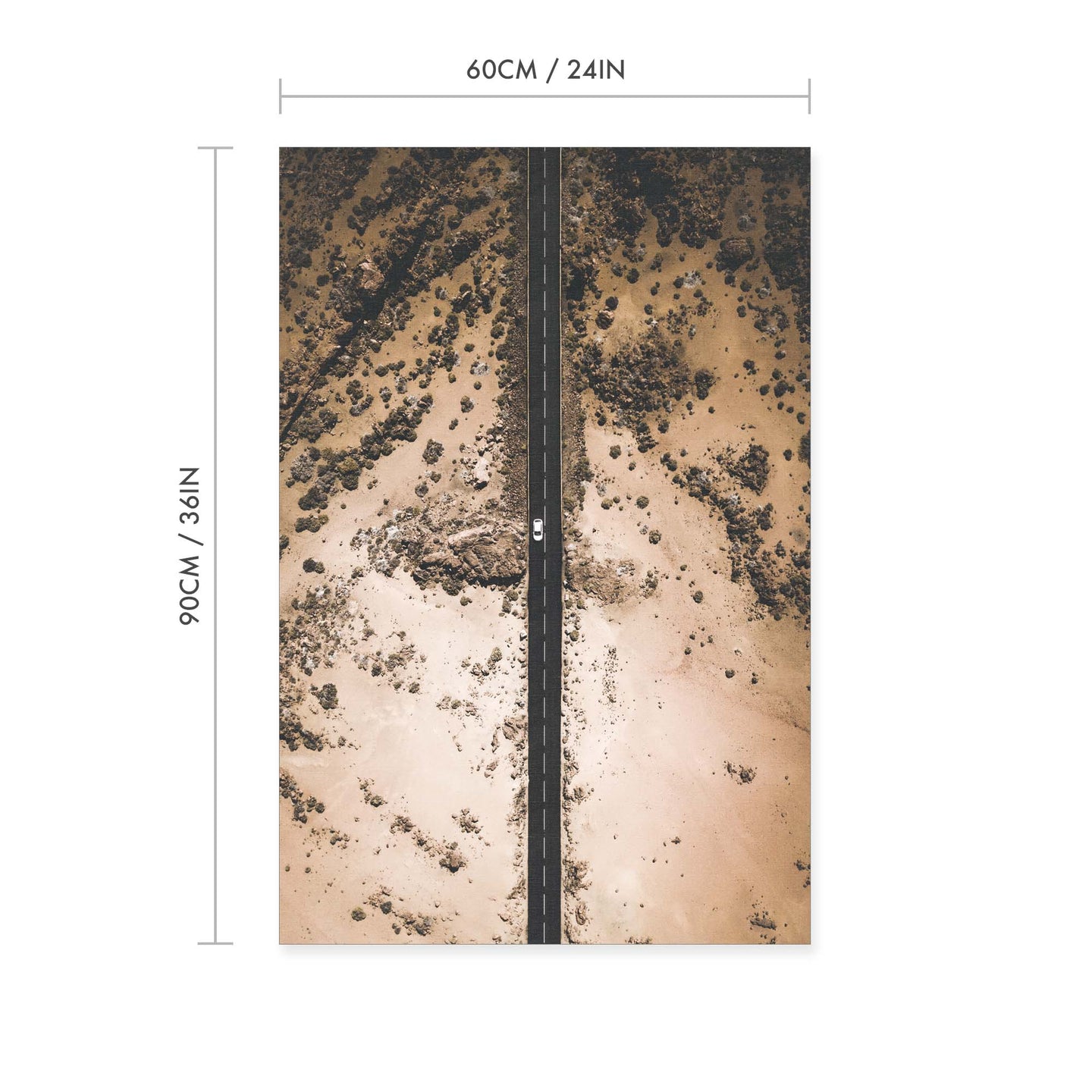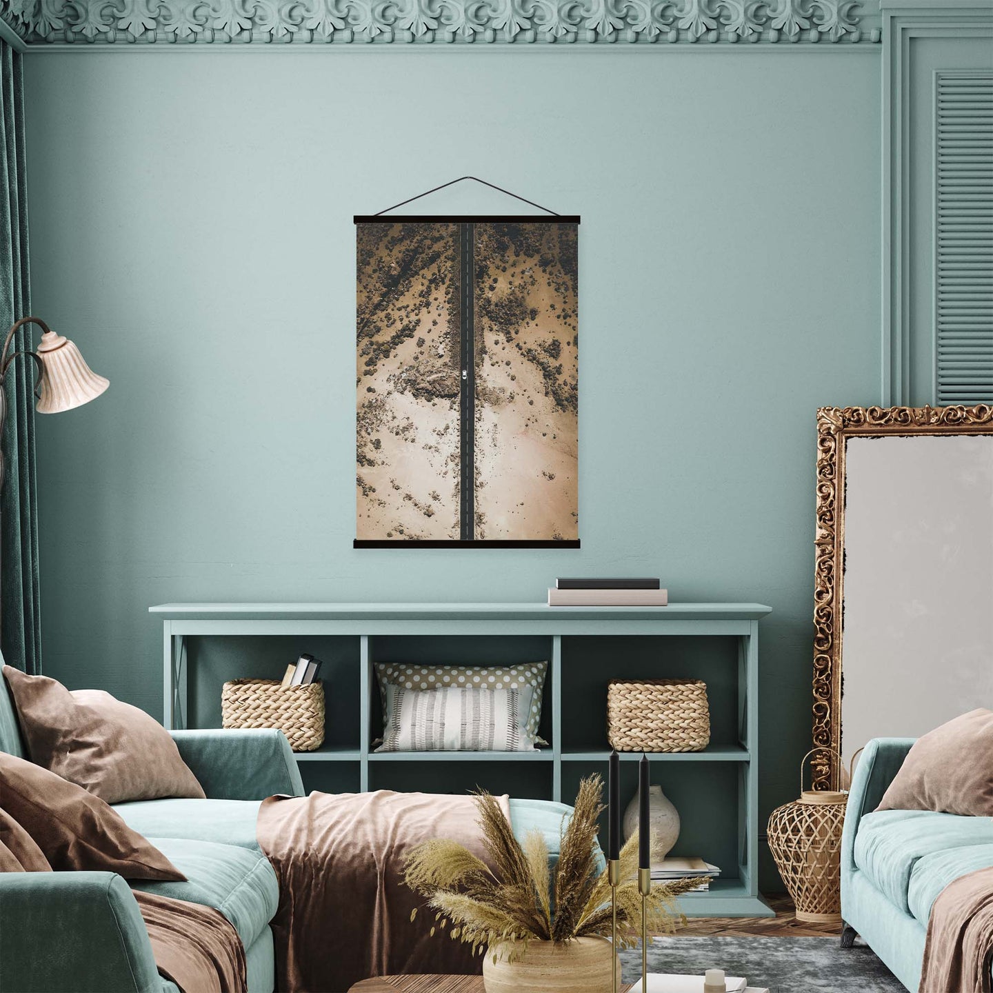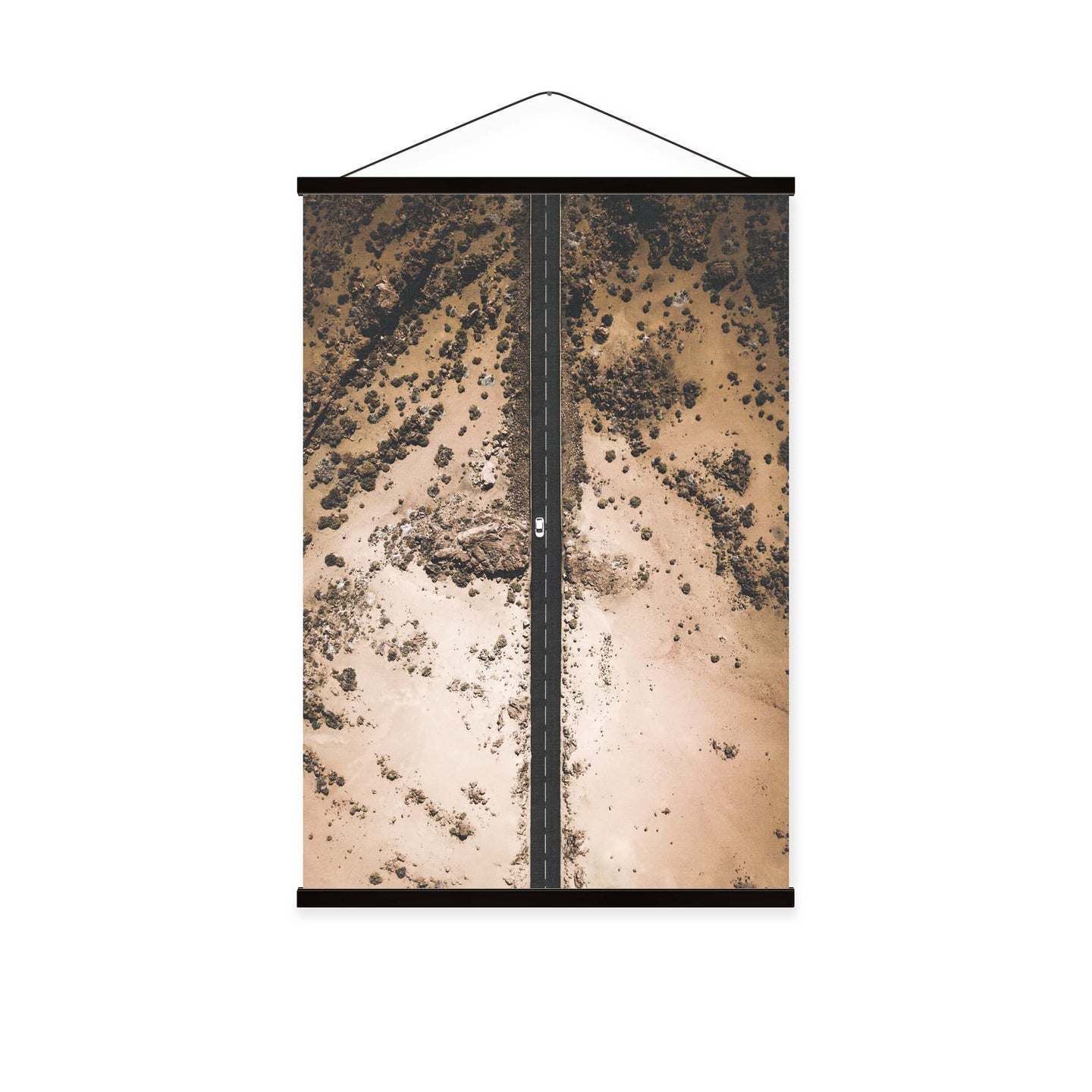 Create an instant room transformation, with the canvas tapestry print: 'Desert Drive'. Printed on luxury 260g canvas, Tapestro canvas tapestries hang from magnetic wooden holders, in either teak or black wood. Supplied with a black hanger. This print measures: 60cm x 90cm (24in x 36in). For each item sold, one tree is planted. This helps to offset carbon released during production and shipping, and to create a net positive contribution over the tree's lifetime. Transform your home, and our planet.