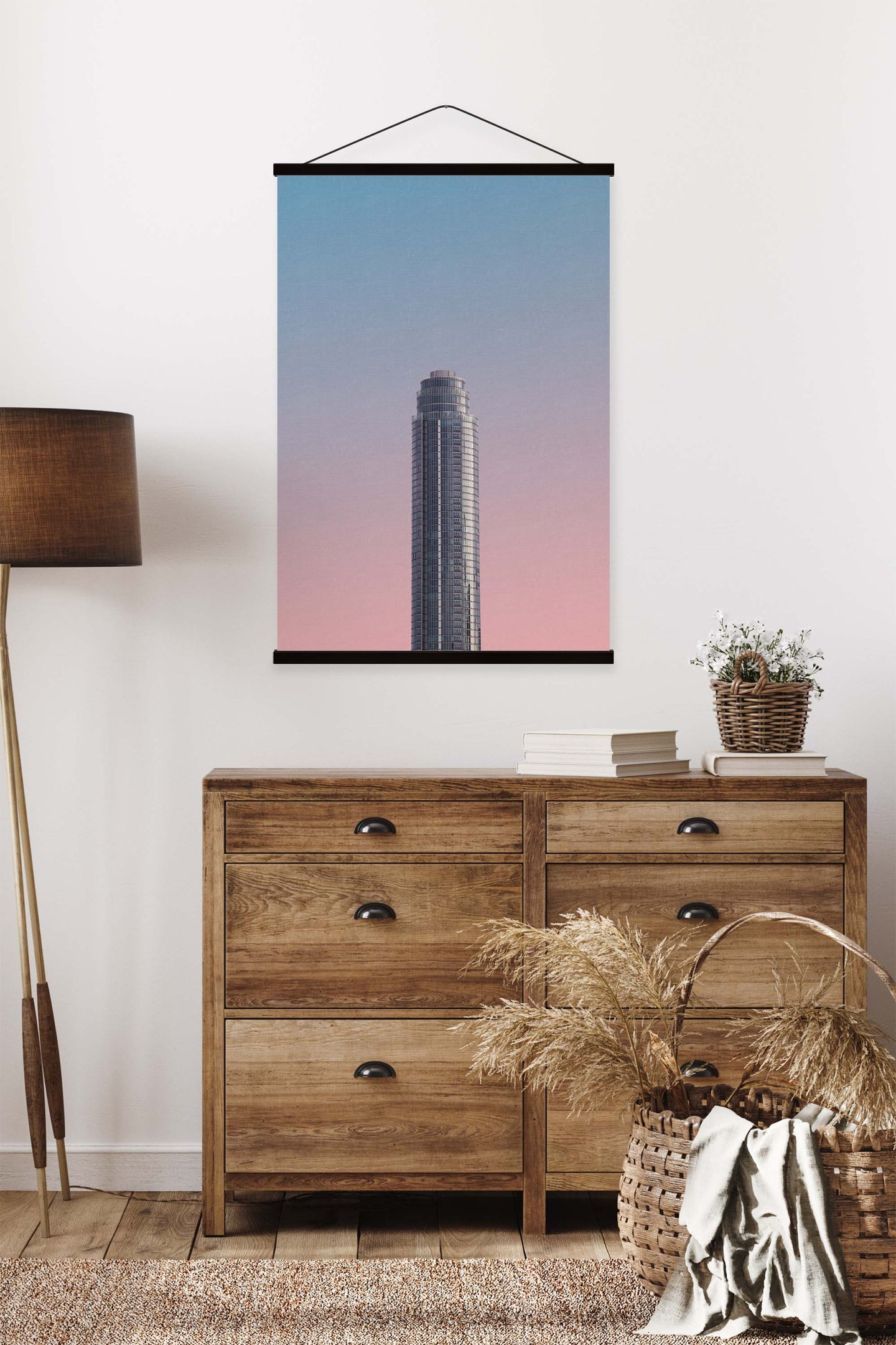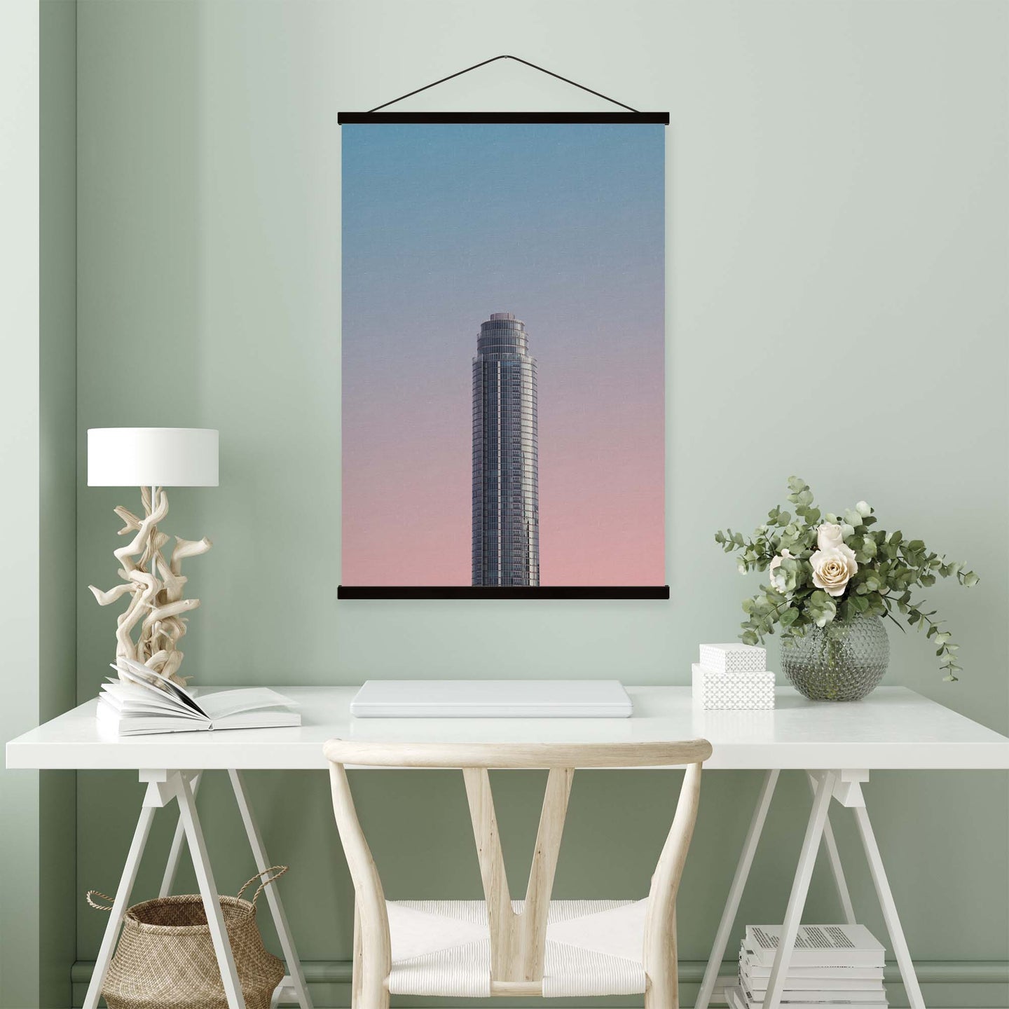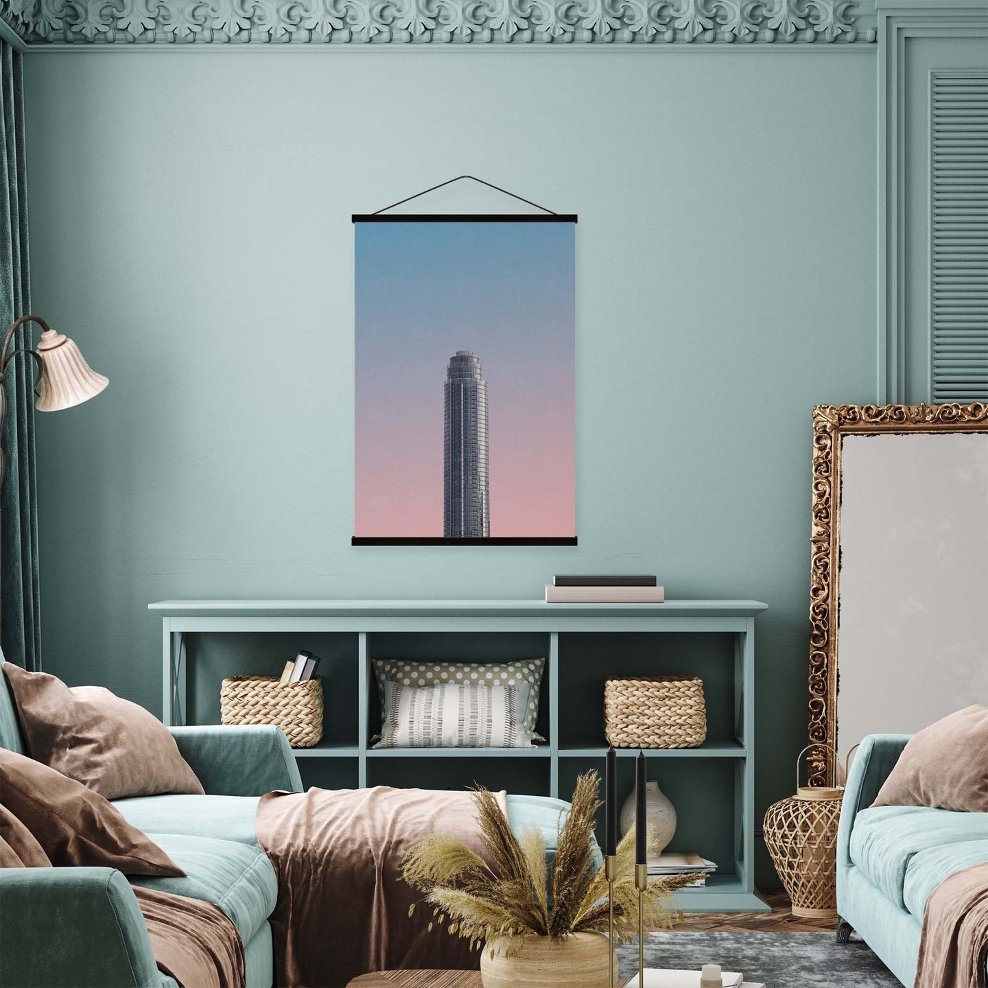 Create an instant room transformation, with the canvas tapestry print: 'Ombrestadt III'. Printed on luxury 260g canvas, Tapestro canvas tapestries hang from magnetic wooden holders, in either teak or black wood. Supplied with a black hanger. This print measures: 60cm x 90cm (24in x 36in). For each item sold, one tree is planted. This helps to offset carbon released during production and shipping, and to create a net positive contribution over the tree's lifetime. Transform your home, and our planet.