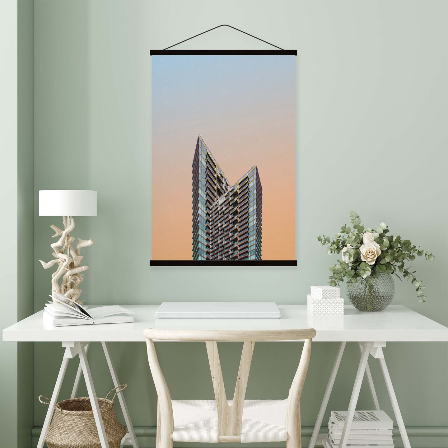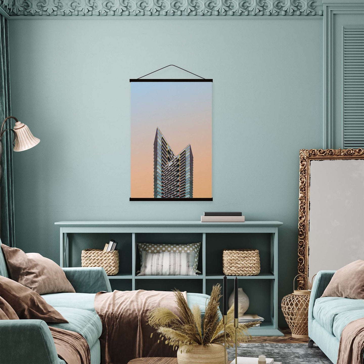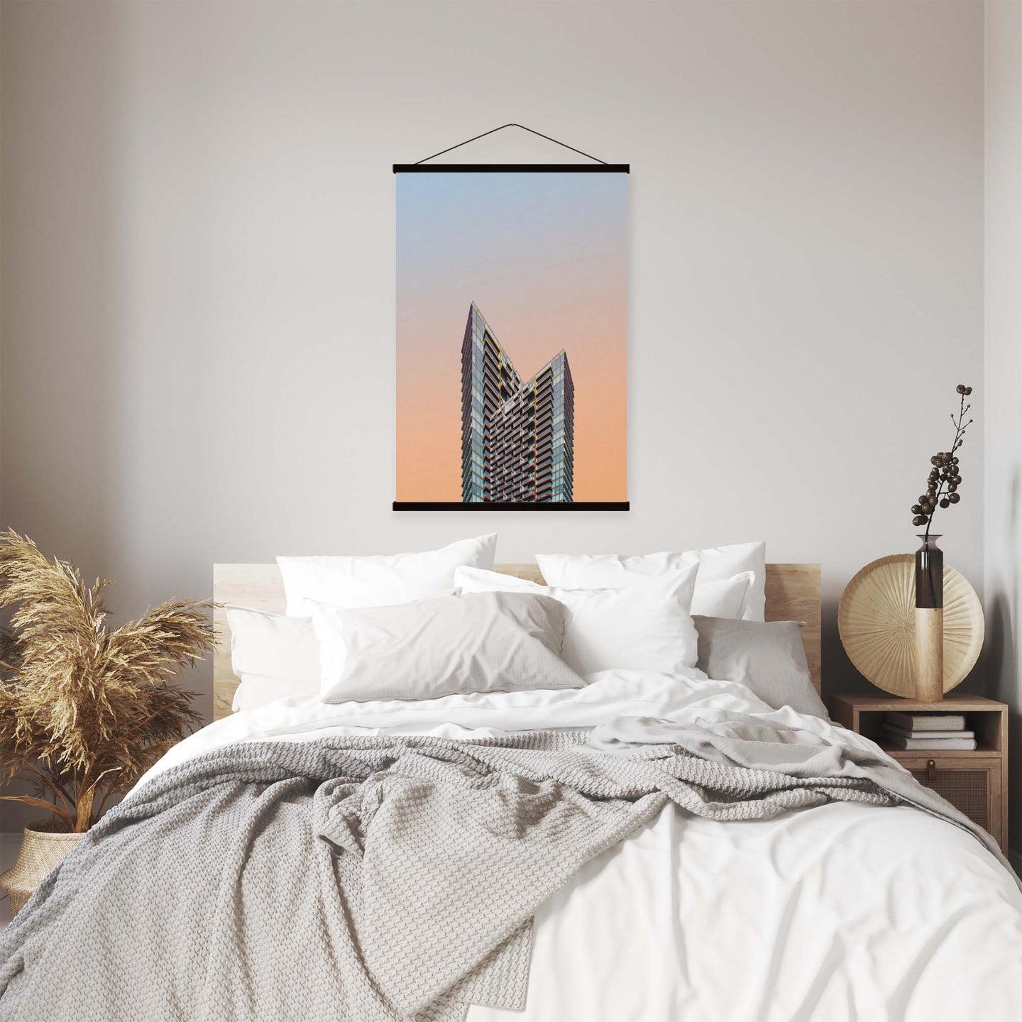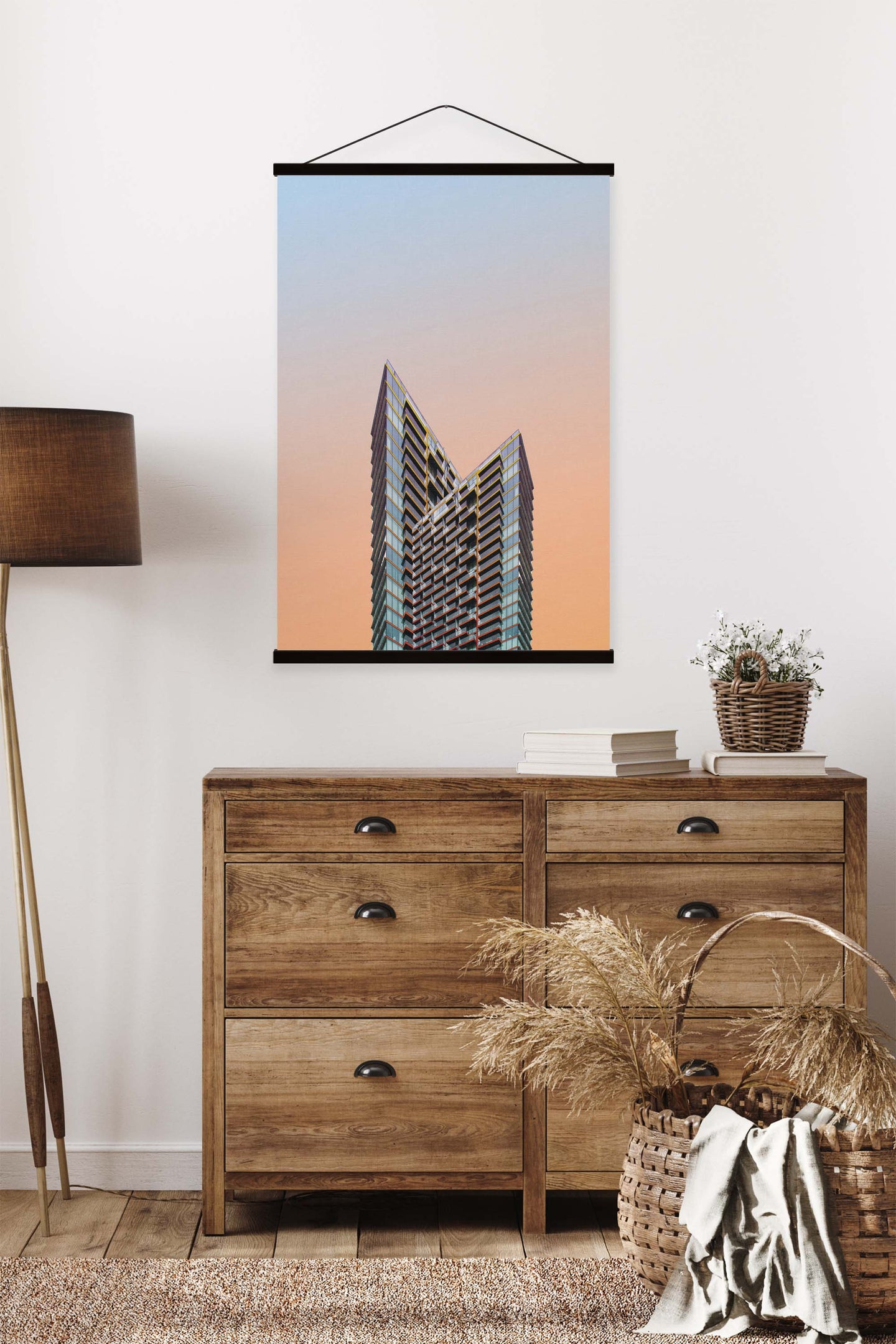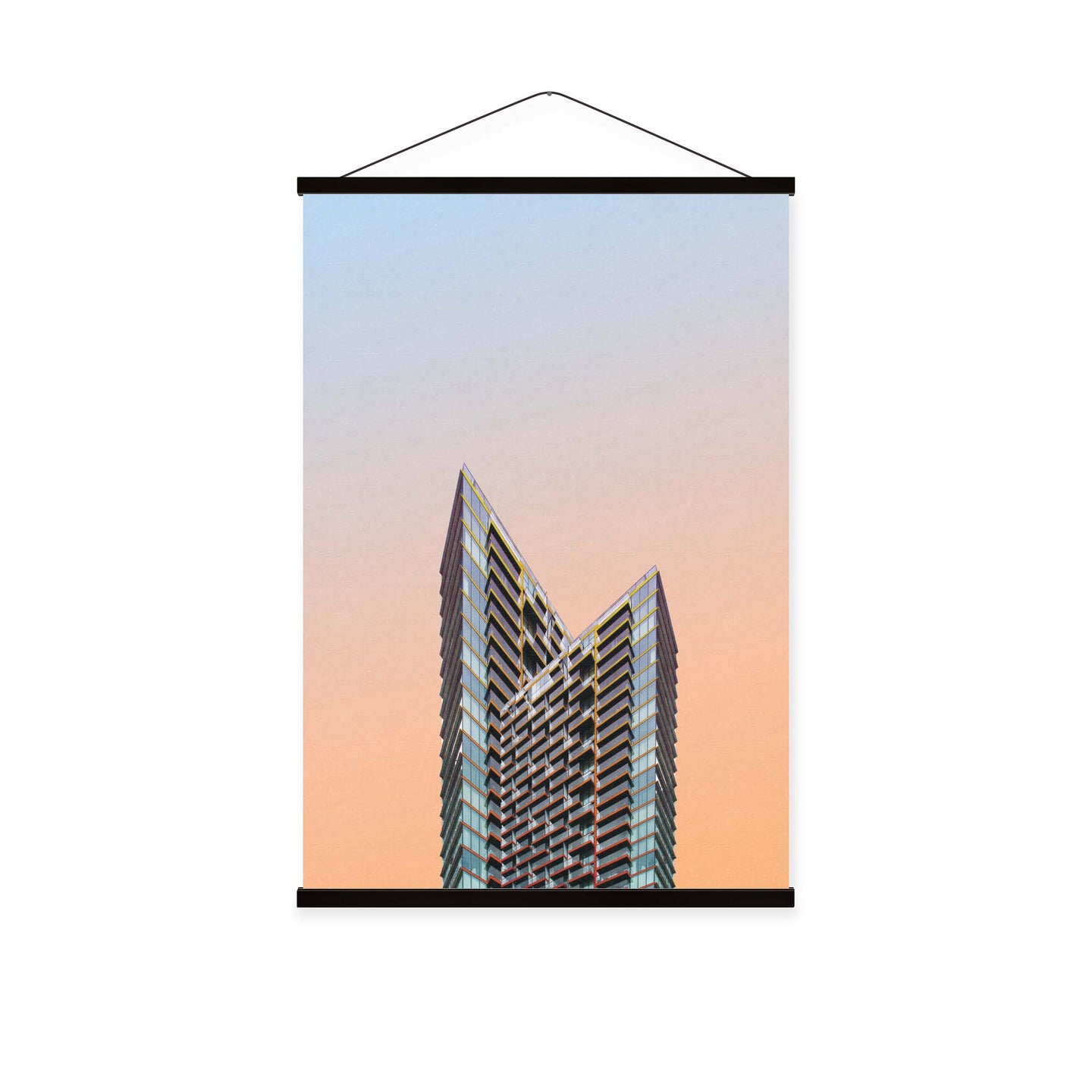 Create an instant room transformation, with the canvas tapestry print: 'Ombrestadt VII'. Printed on luxury 260g canvas, Tapestro canvas tapestries hang from magnetic wooden holders, in either teak or black wood. Supplied with a black hanger. This print measures: 60cm x 90cm (24in x 36in). For each item sold, one tree is planted. This helps to offset carbon released during production and shipping, and to create a net positive contribution over the tree's lifetime. Transform your home, and our planet.