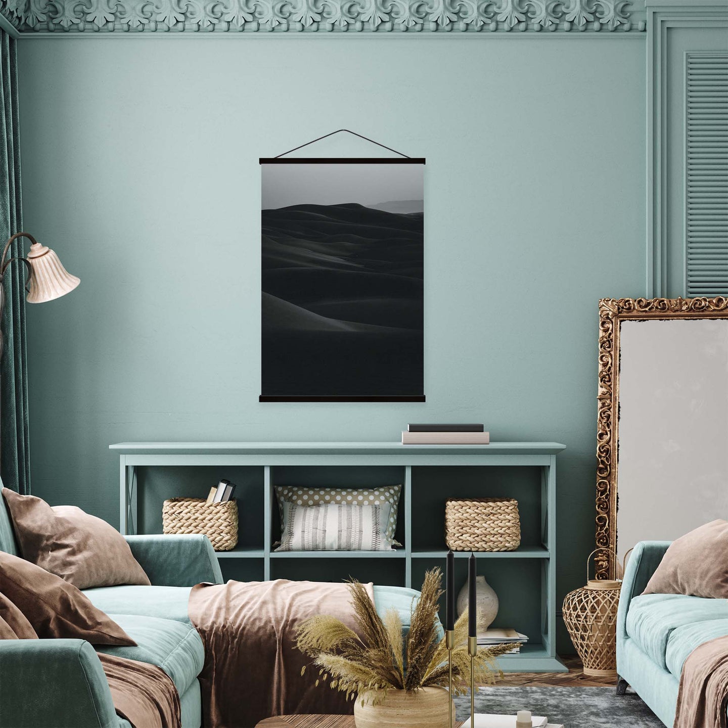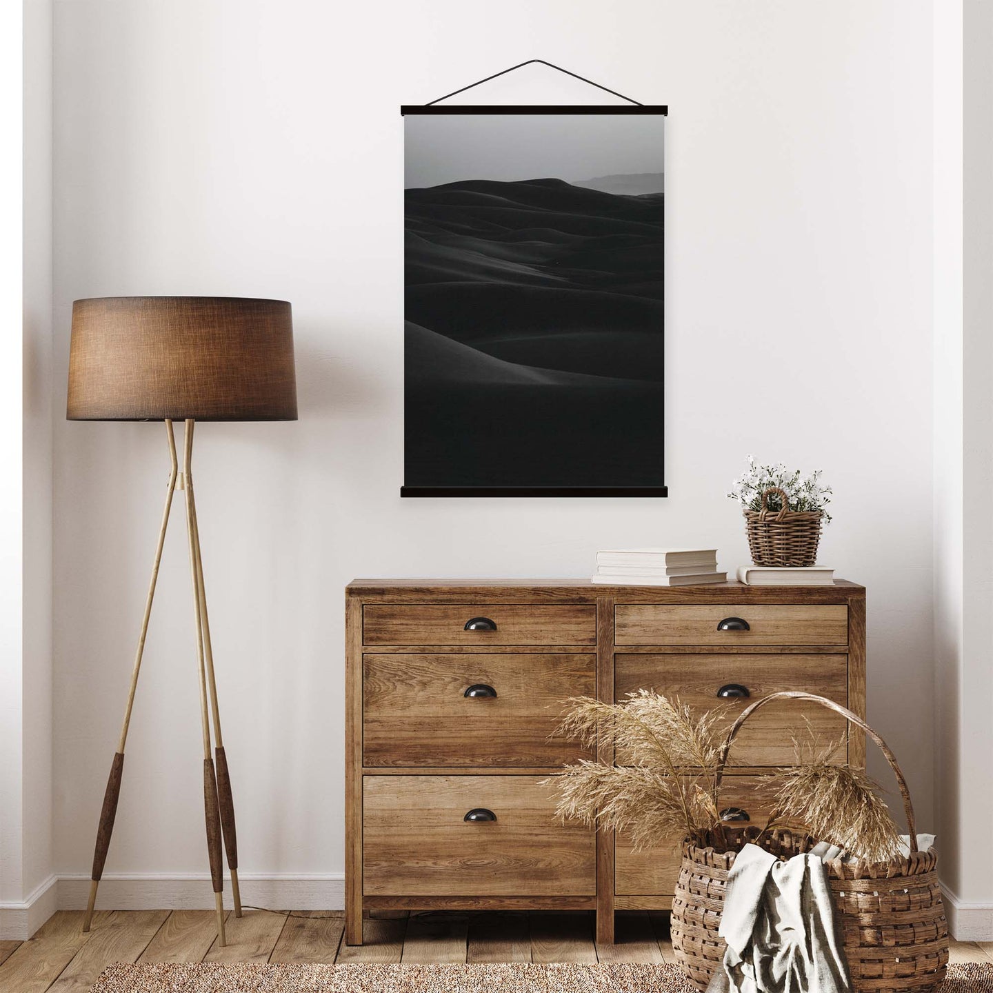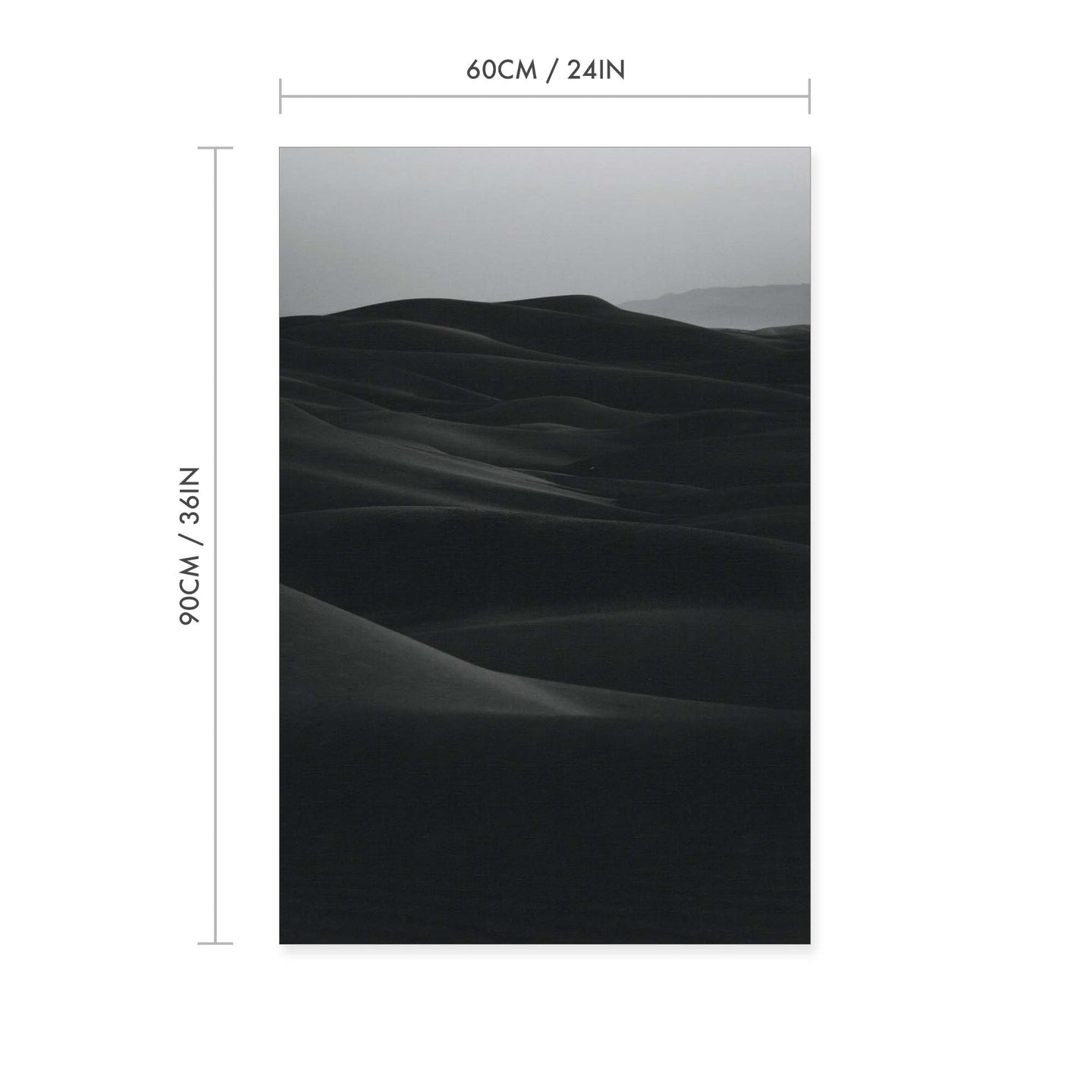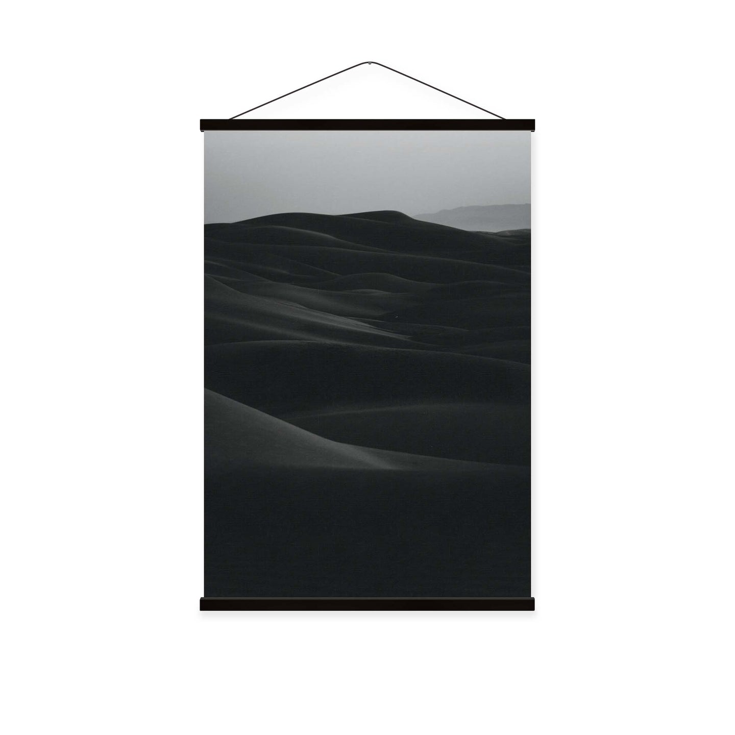 Create an instant room transformation, with the canvas tapestry print: 'Desert Noir'. Printed on luxury 260g canvas, Tapestro canvas tapestries hang from magnetic wooden holders, in either teak or black wood. Supplied with a black hanger. This print measures: 60cm x 90cm (24in x 36in). For each item sold, one tree is planted. This helps to offset carbon released during production and shipping, and to create a net positive contribution over the tree's lifetime. Transform your home, and our planet.