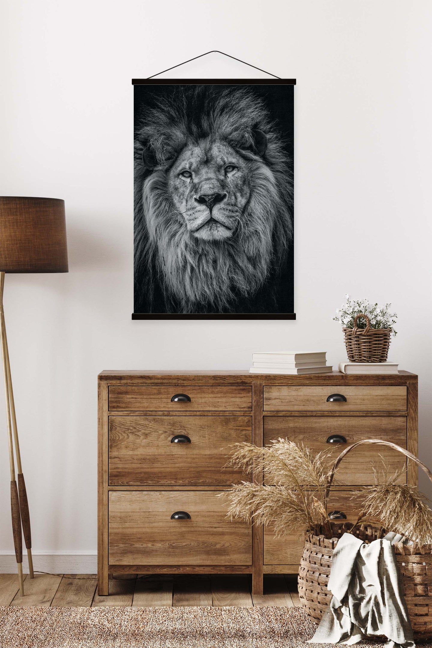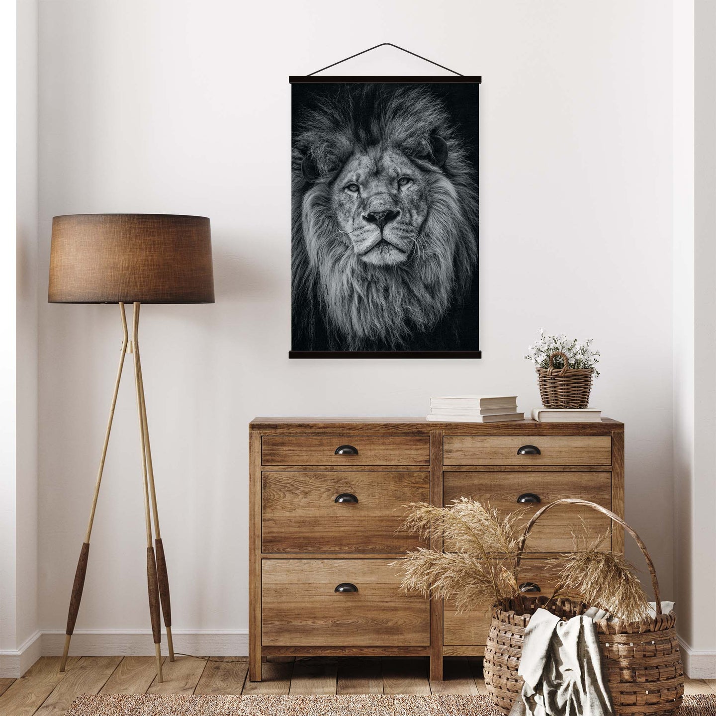 Create an instant room transformation, with the canvas tapestry print: 'His Majesty'. Printed on luxury 260g canvas, Tapestro canvas tapestries hang from magnetic wooden holders, in either teak or black wood. Supplied with a black hanger. This print measures: 60cm x 90cm (24in x 36in). For each item sold, one tree is planted. This helps to offset carbon released during production and shipping, and to create a net positive contribution over the tree's lifetime. Transform your home, and our planet.