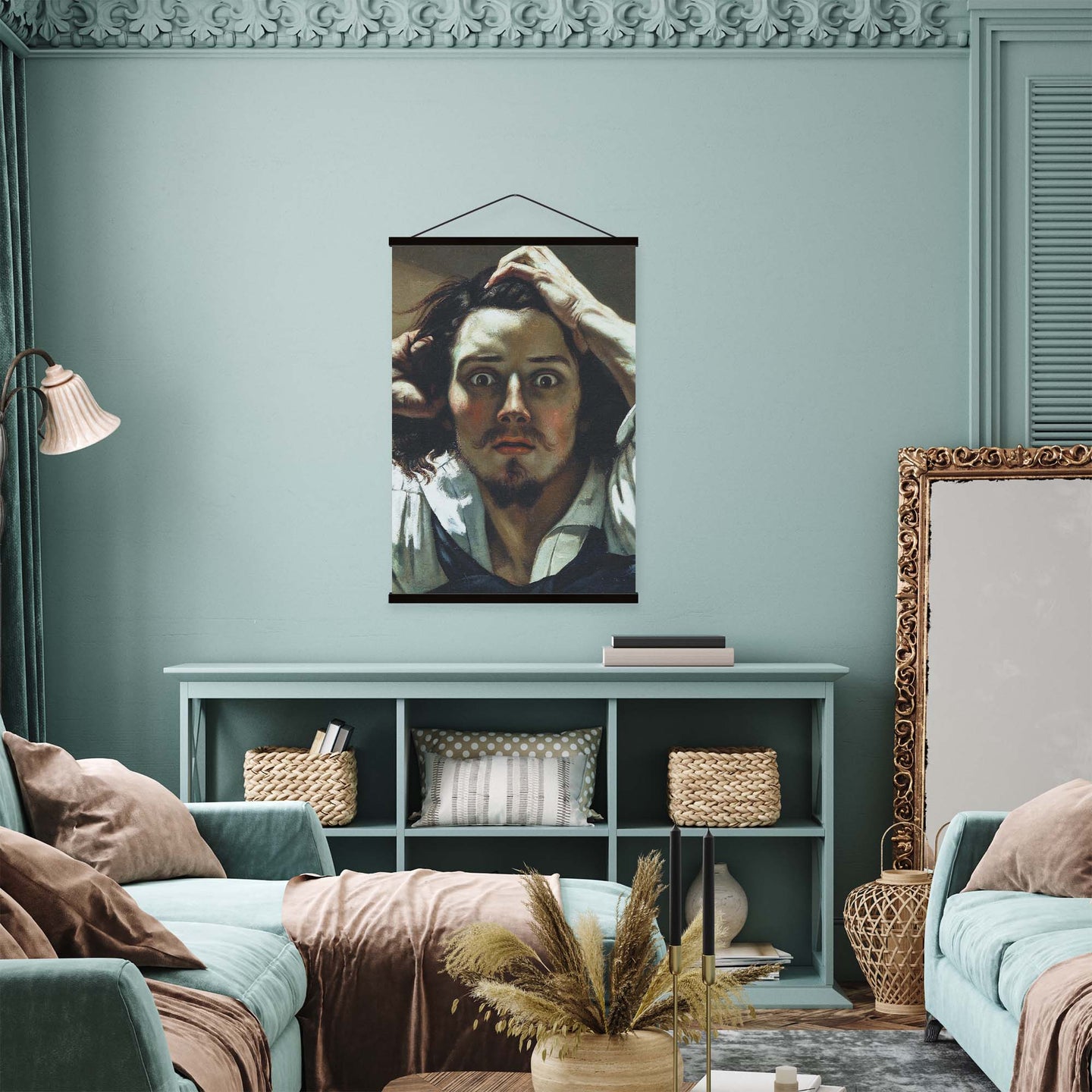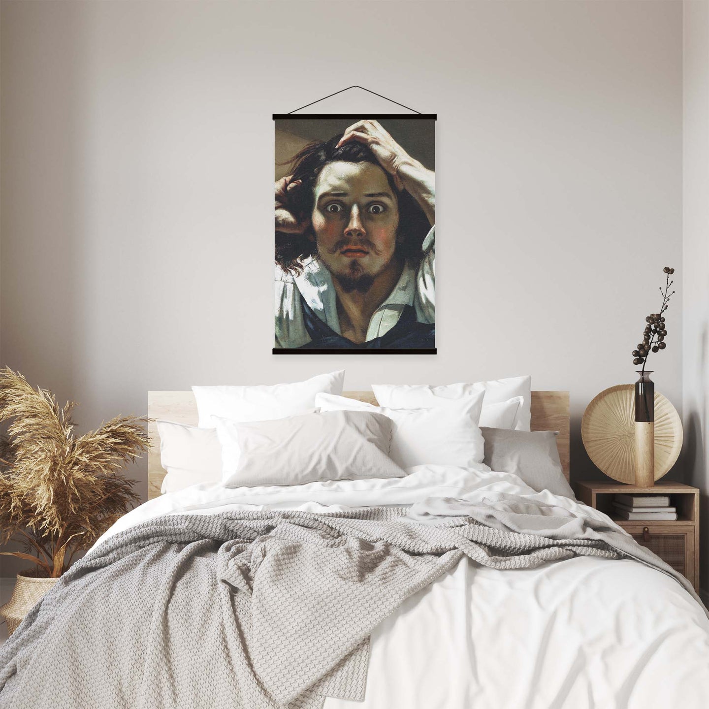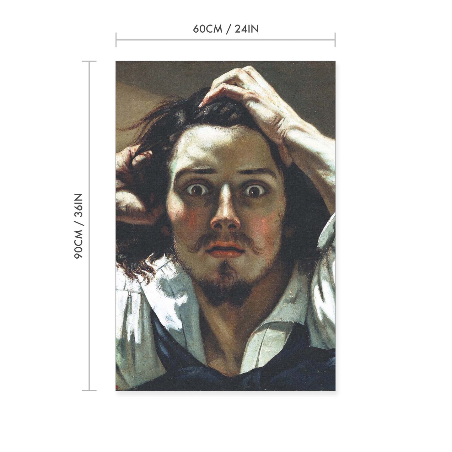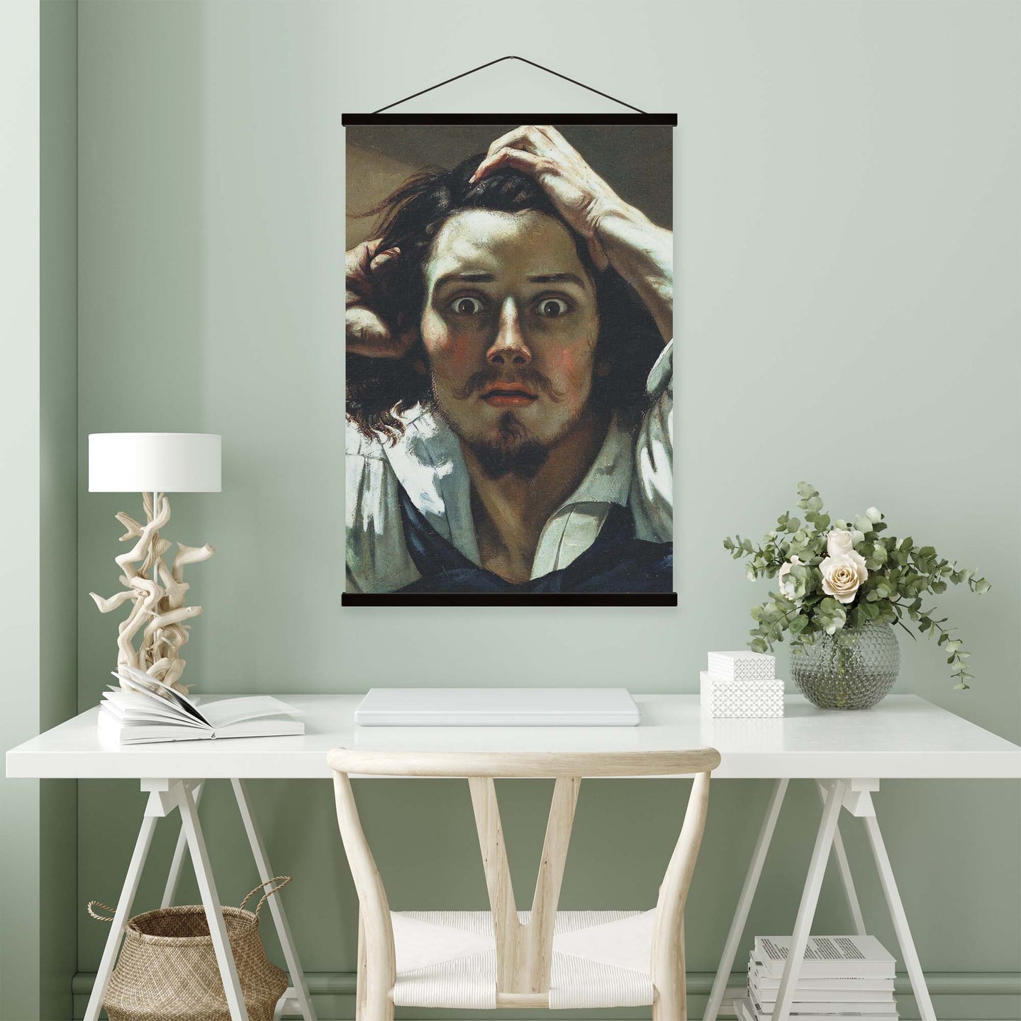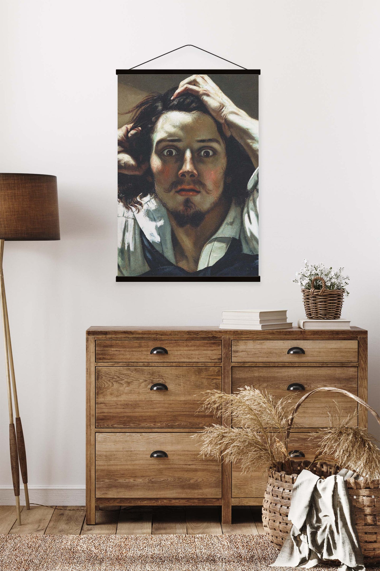 Create an instant room transformation, with the canvas tapestry print: 'Le Désepére by Gustave Courbet'. Printed on luxury 260g canvas, Tapestro canvas tapestries hang from magnetic wooden holders, in either teak or black wood. Supplied with a black hanger. This print measures: 60cm x 90cm (24in x 36in). For each item sold, one tree is planted. This helps to offset carbon released during production and shipping, and to create a net positive contribution over the tree's lifetime. Transform your home, and our planet.