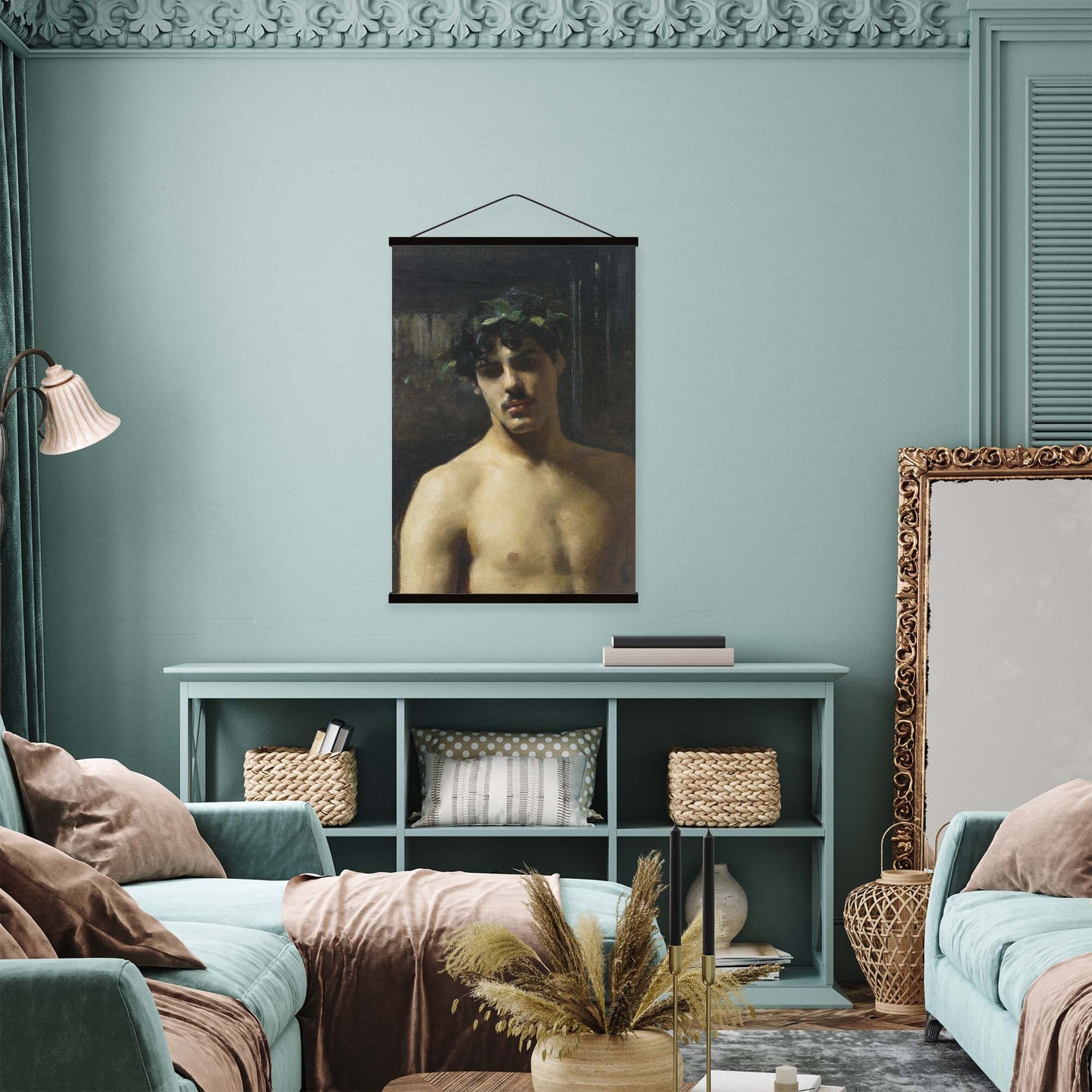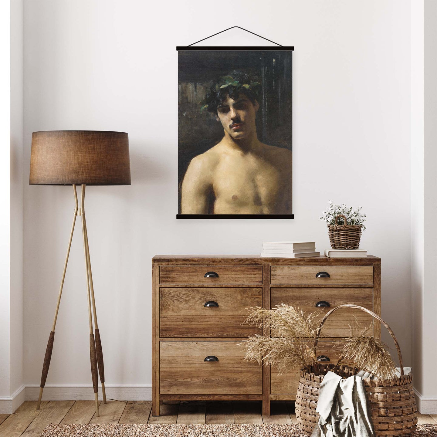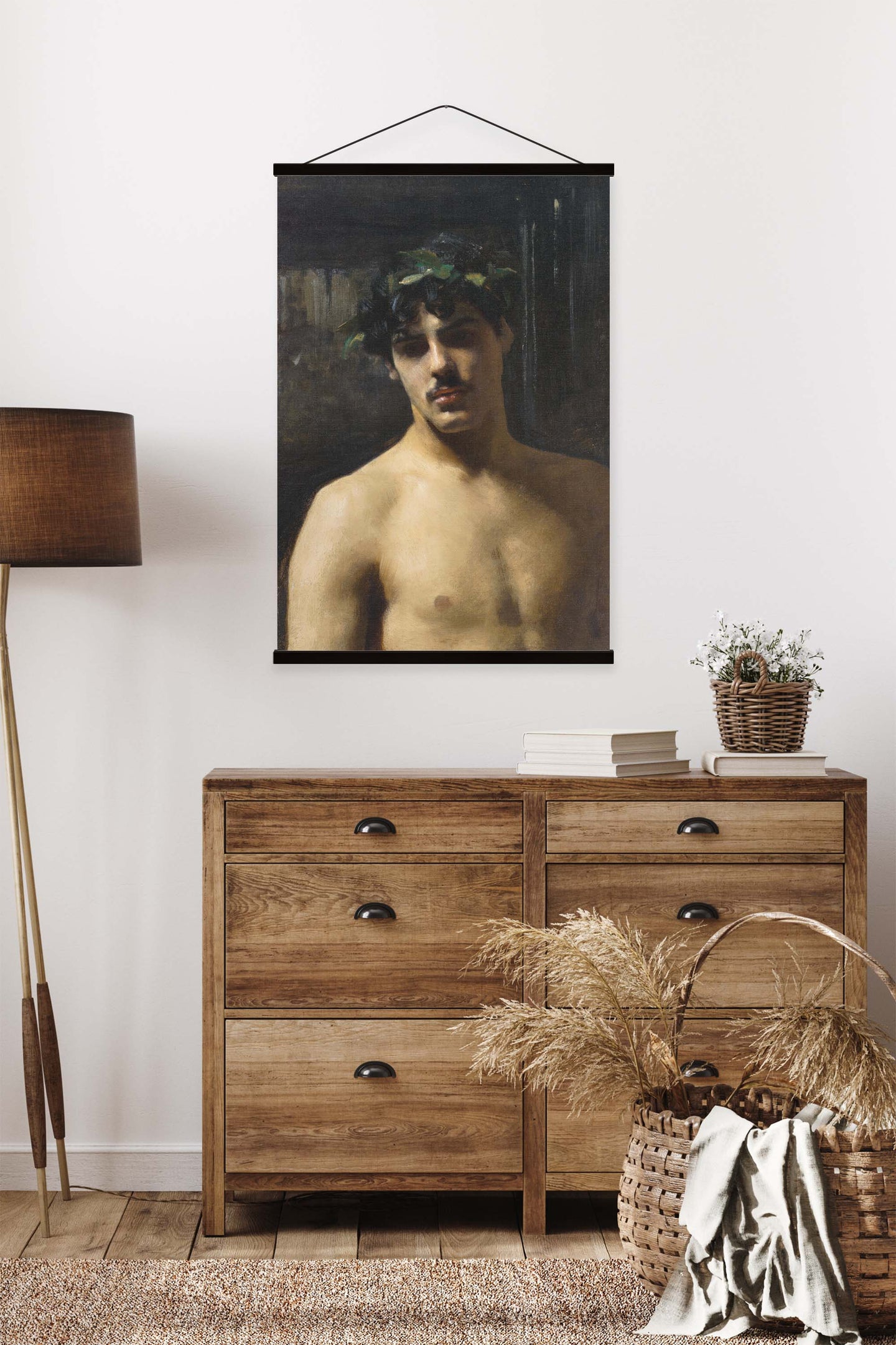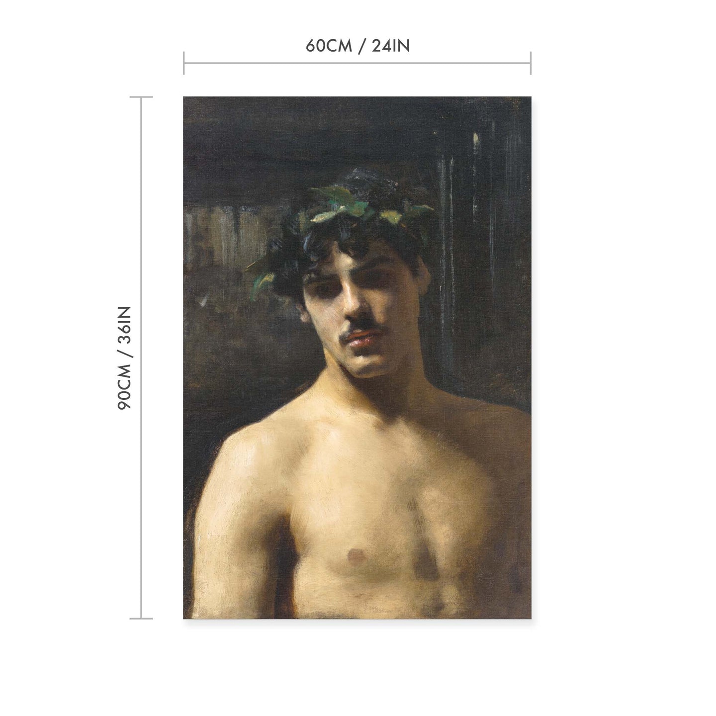 Create an instant room transformation, with the canvas tapestry print: 'Man Wearing Laurels by John Singer-Sargent'. Printed on luxury 260g canvas, Tapestro canvas tapestries hang from magnetic wooden holders, in either teak or black wood. Supplied with a black hanger. This print measures: 60cm x 90cm (24in x 36in). For each item sold, one tree is planted. This helps to offset carbon released during production and shipping, and to create a net positive contribution over the tree's lifetime. Transform your home, and our planet.