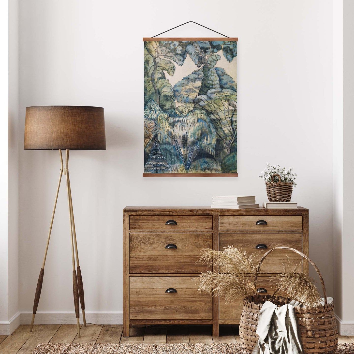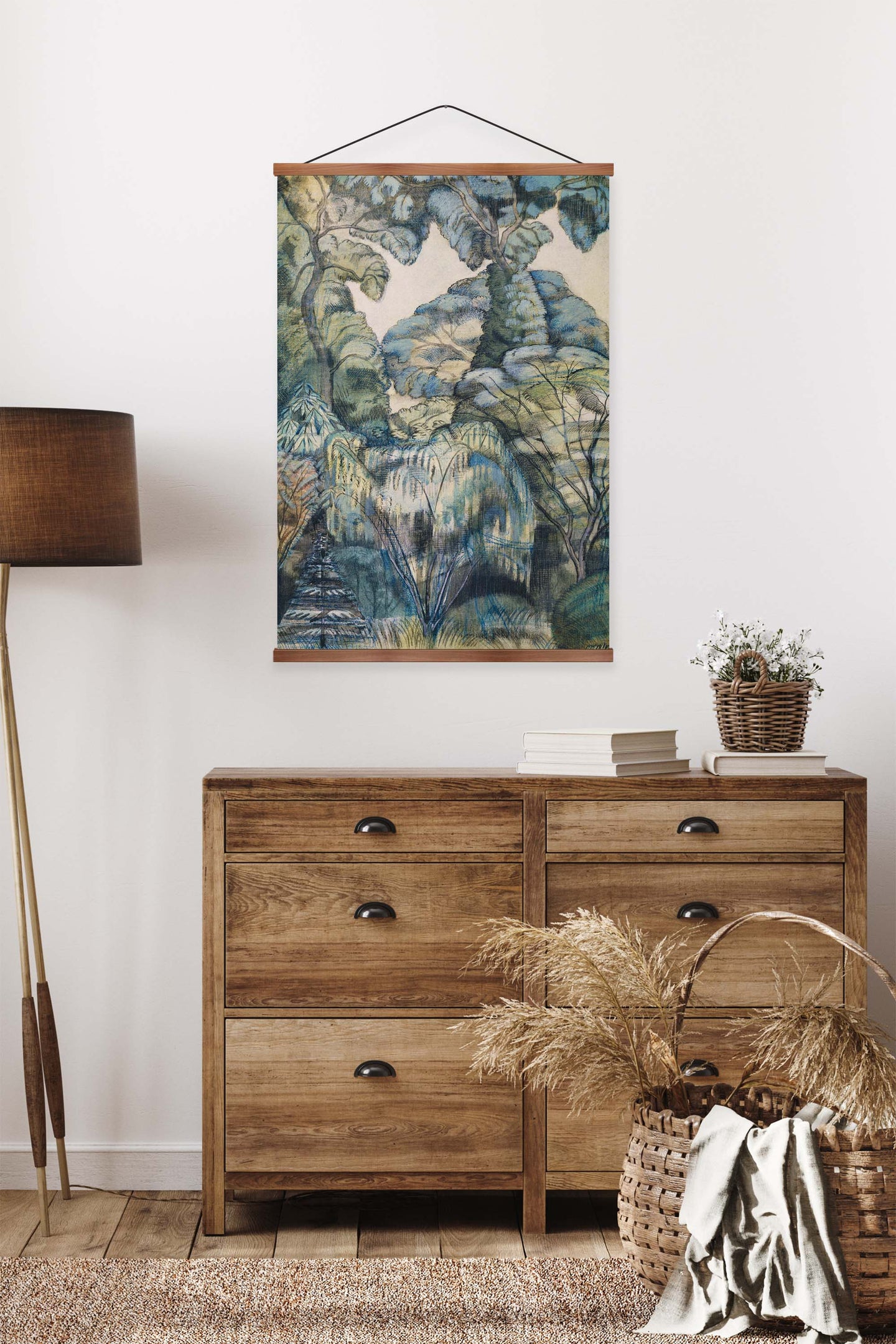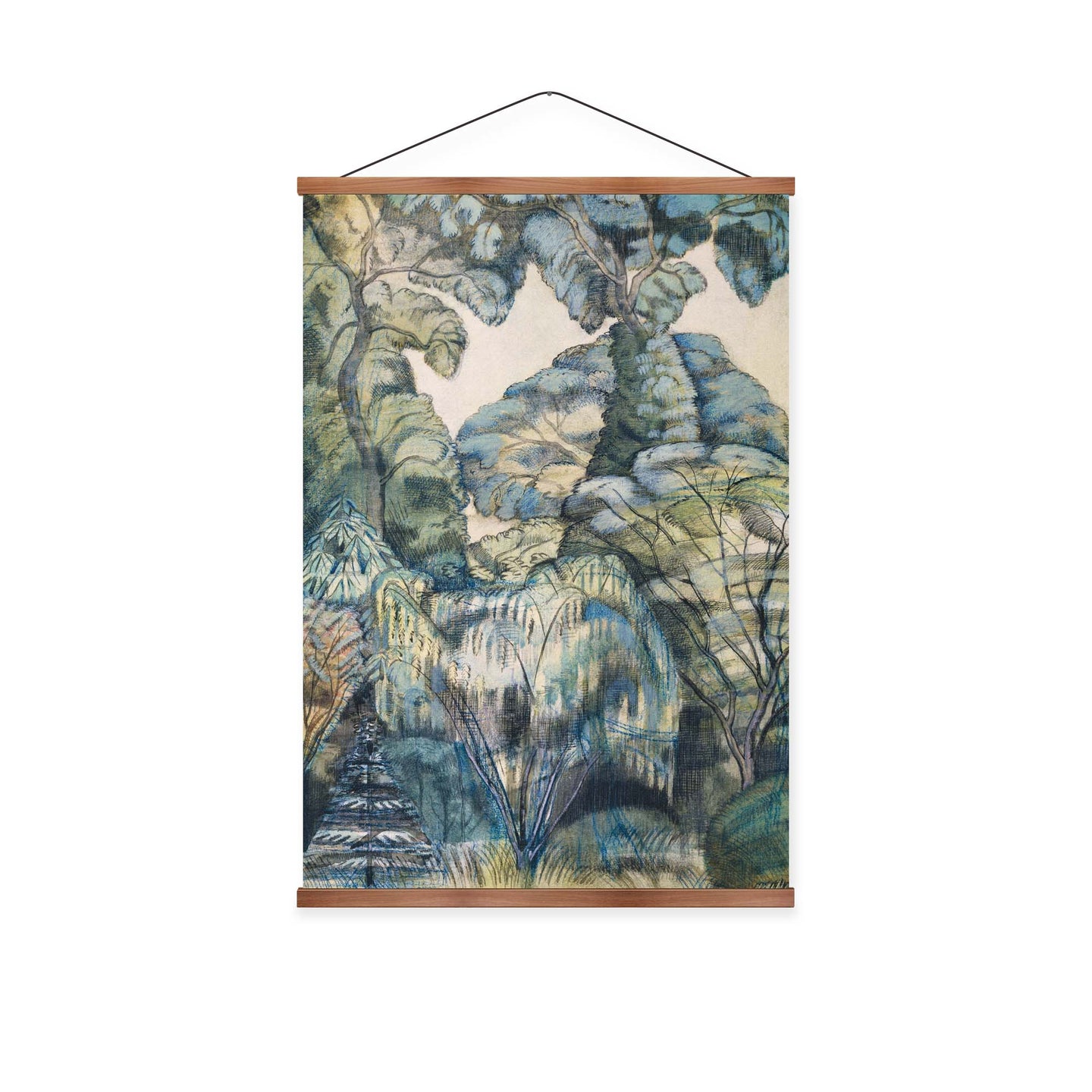 Create an instant room transformation, with the canvas tapestry print: 'Trees in Bird Garden by Iver Heath'. Printed on luxury 260g canvas, Tapestro canvas tapestries hang from magnetic wooden holders, in either teak or black wood. Supplied with a teak hanger. This print measures: 60cm x 90cm (24in x 36in). For each item sold, one tree is planted. This helps to offset carbon released during production and shipping, and to create a net positive contribution over the tree's lifetime. Transform your home, and our planet.