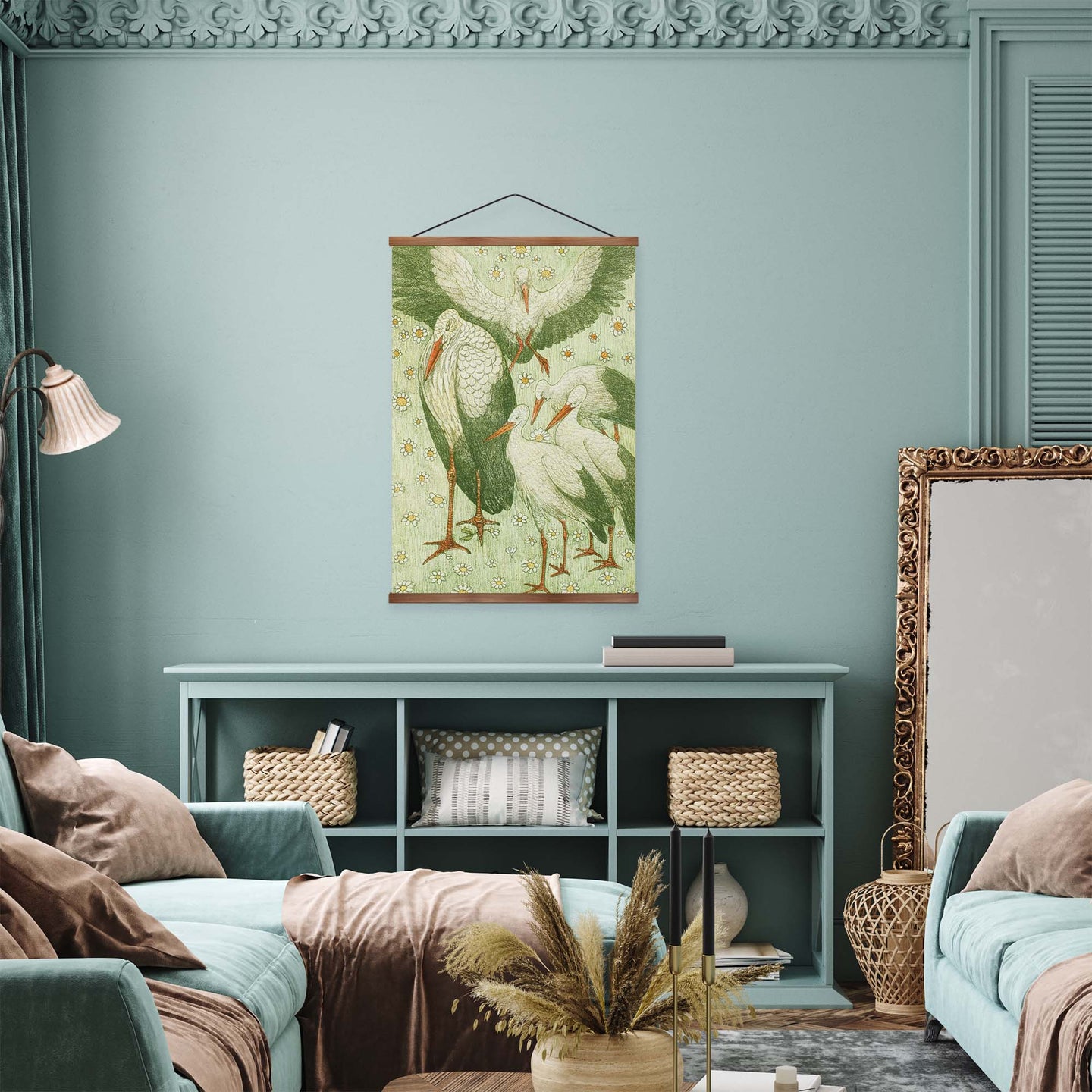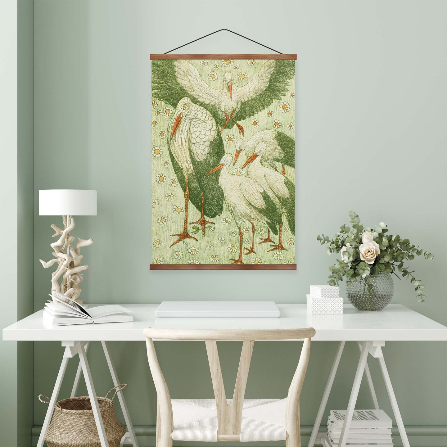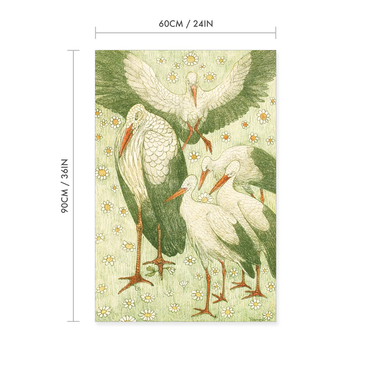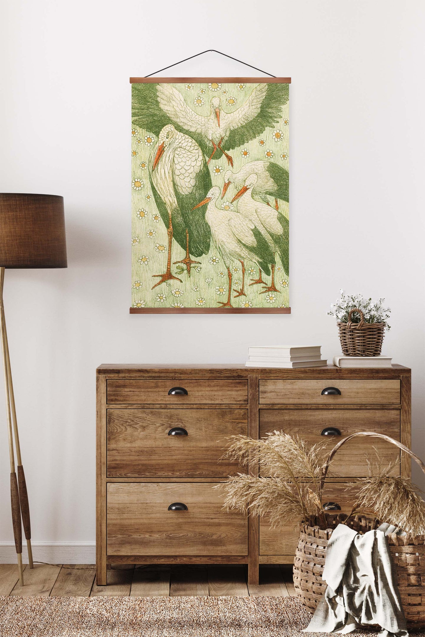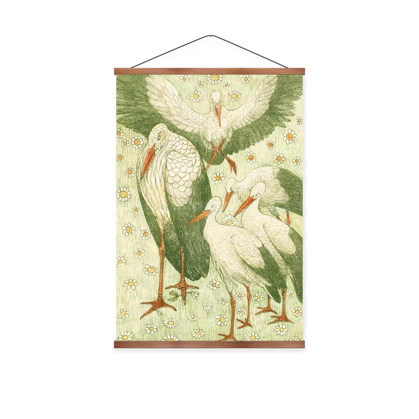 Create an instant room transformation, with the canvas tapestry print: 'Vijf Ooievaars in een Wei by Theo van Hoytema'. Printed on luxury 260g canvas, Tapestro canvas tapestries hang from magnetic wooden holders, in either teak or black wood. Supplied with a teak hanger. This print measures: 60cm x 90cm (24in x 36in). For each item sold, one tree is planted. This helps to offset carbon released during production and shipping, and to create a net positive contribution over the tree's lifetime. Transform your home, and our planet.