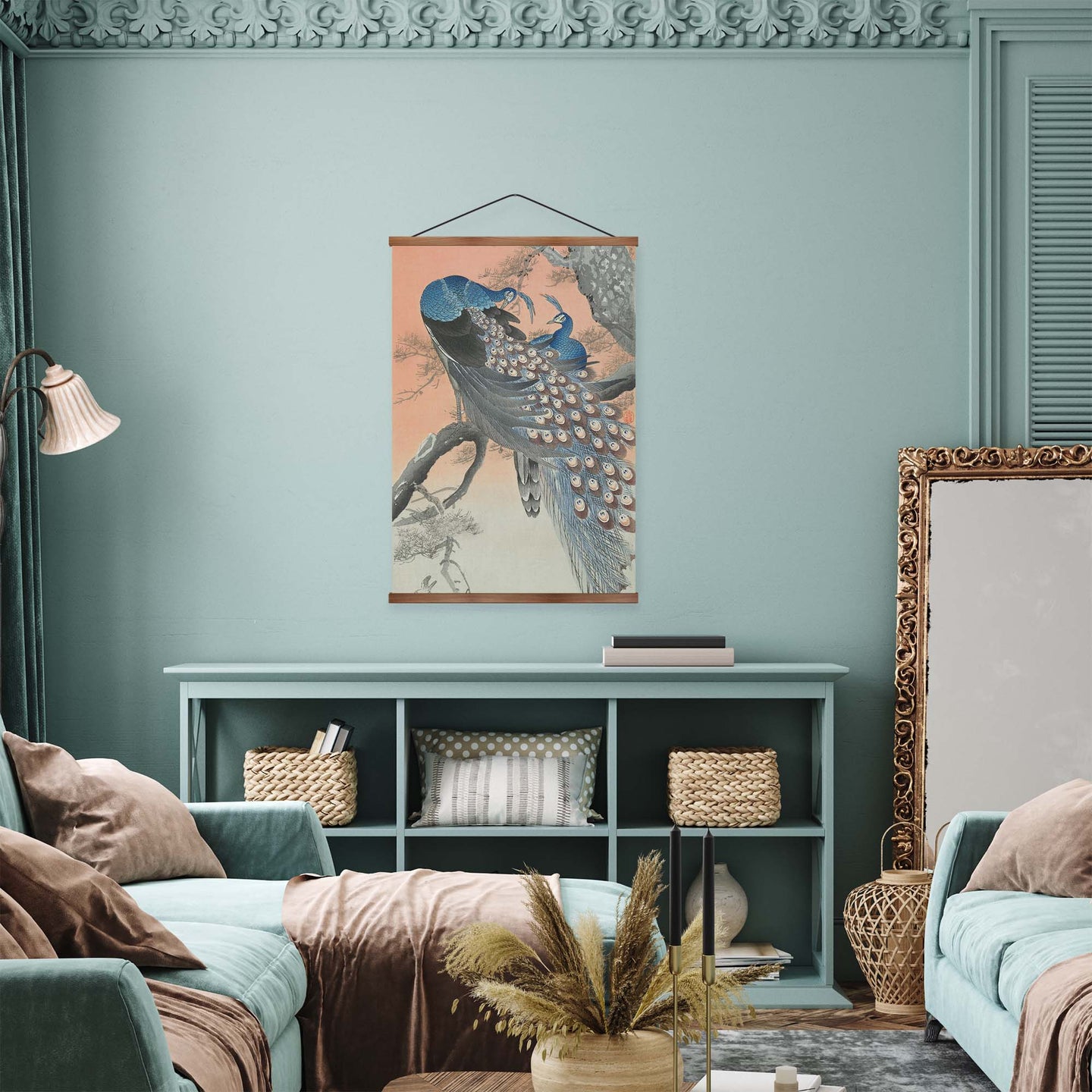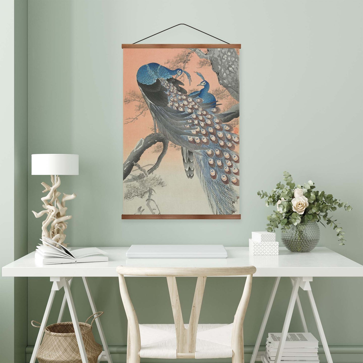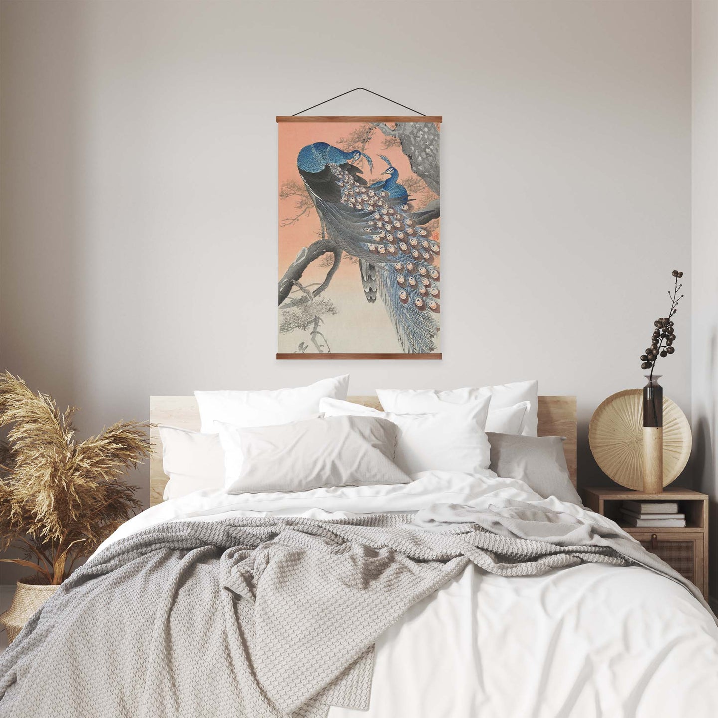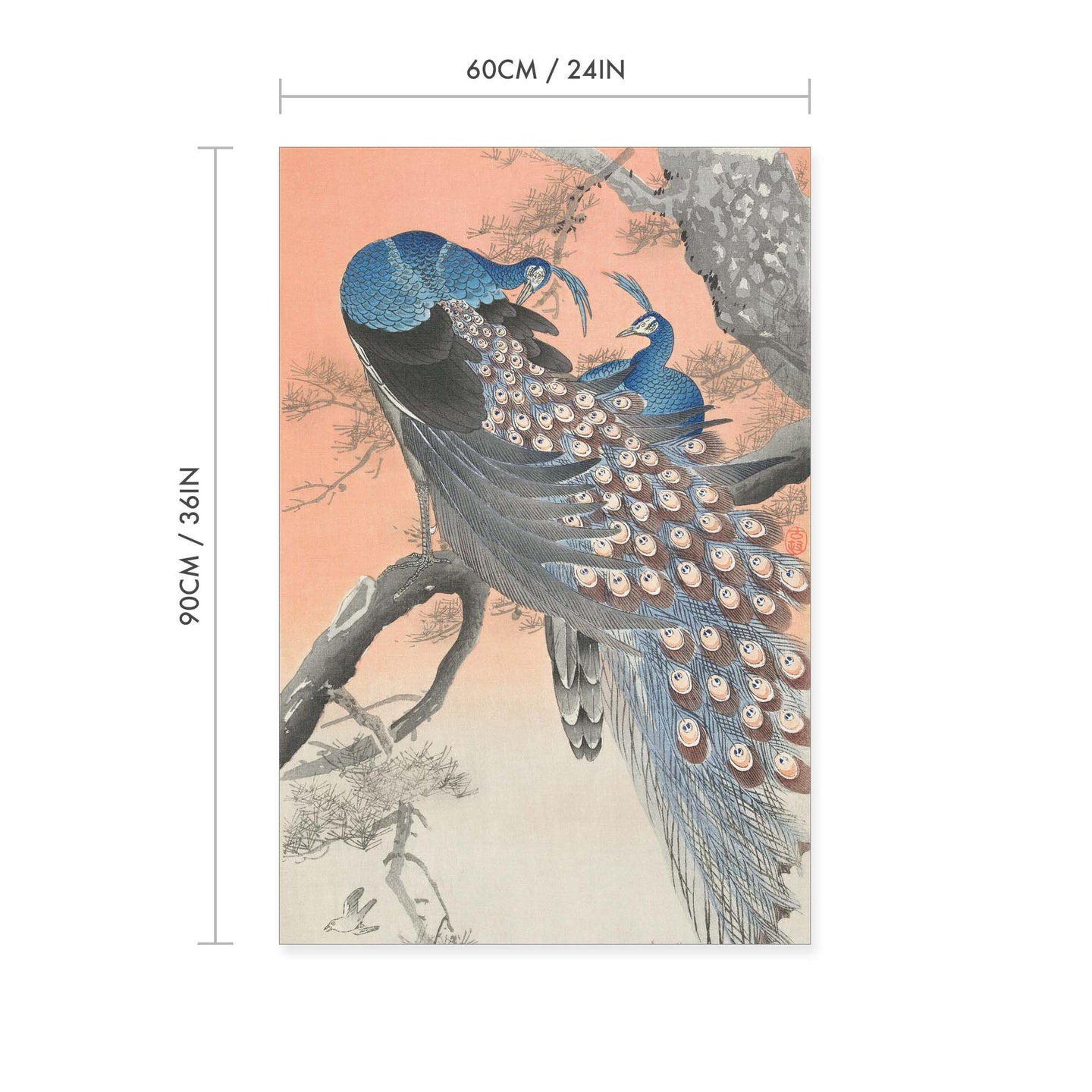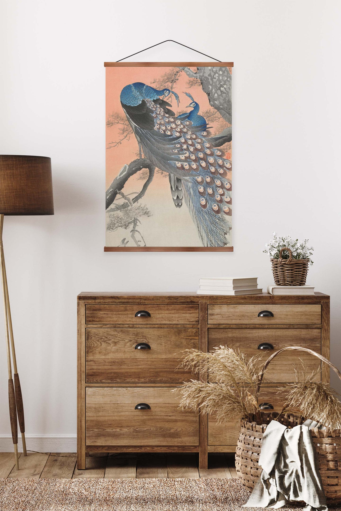 Create an instant room transformation, with the canvas tapestry print: 'Two Peacocks by Ohara Koson'. Printed on luxury 260g canvas, Tapestro canvas tapestries hang from magnetic wooden holders, in either teak or black wood. Supplied with a teak hanger. This print measures: 60cm x 90cm (24in x 36in). For each item sold, one tree is planted. This helps to offset carbon released during production and shipping, and to create a net positive contribution over the tree's lifetime. Transform your home, and our planet.