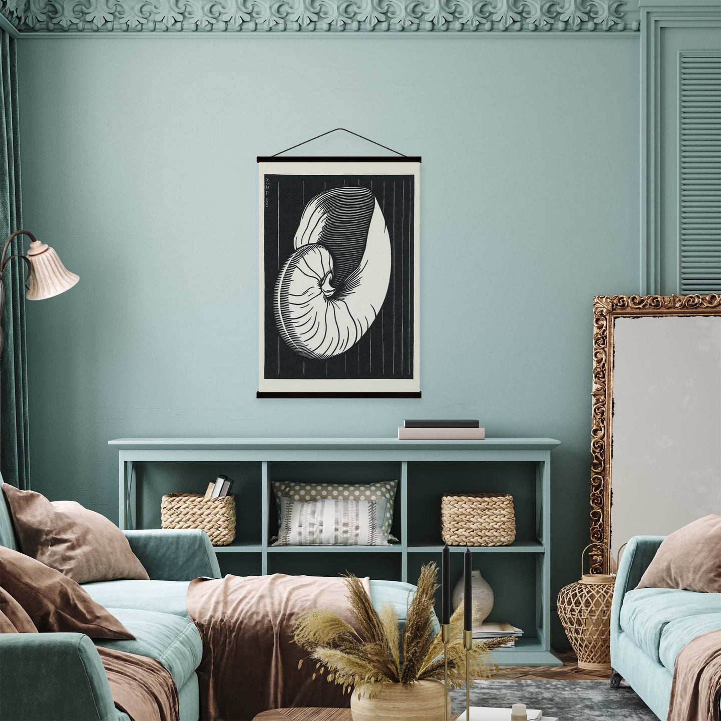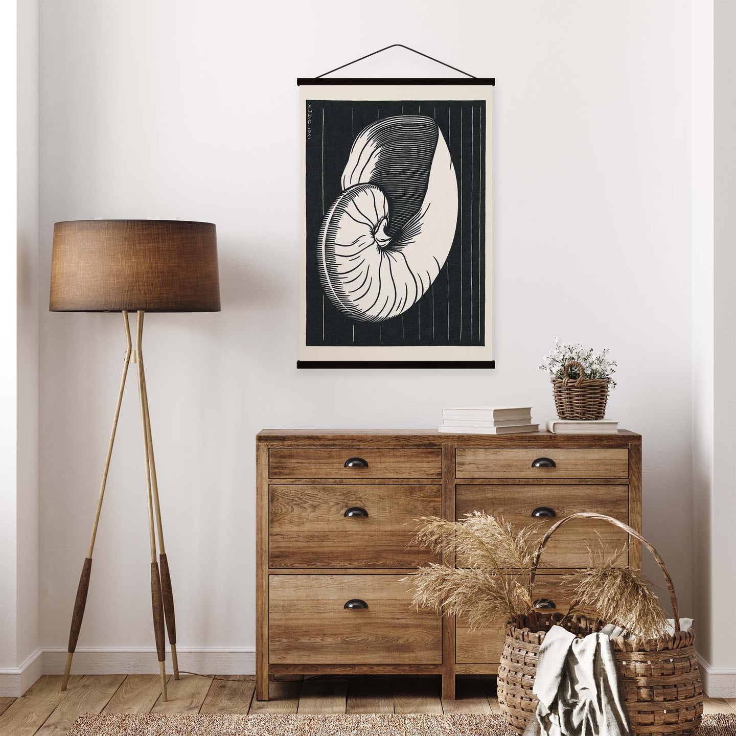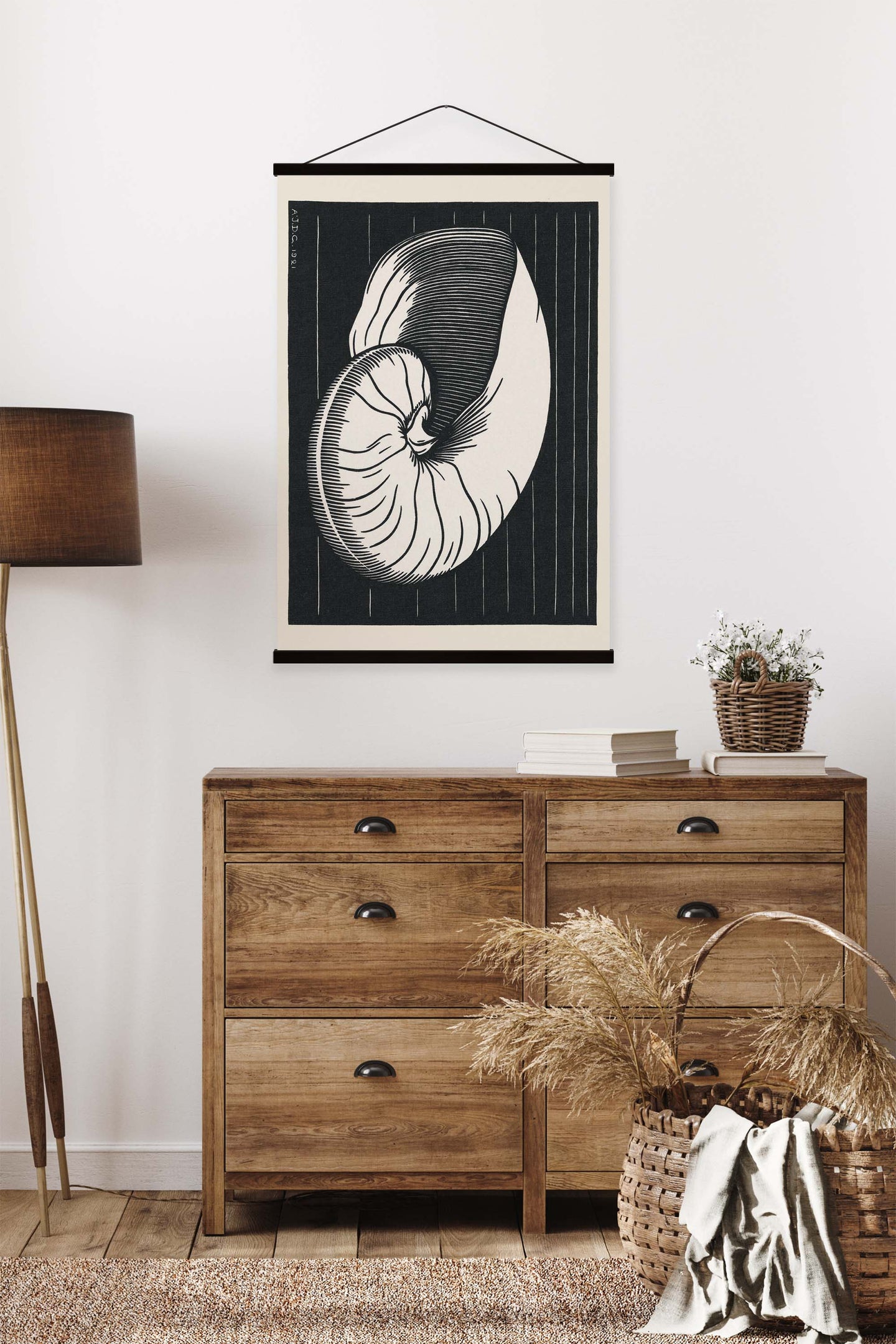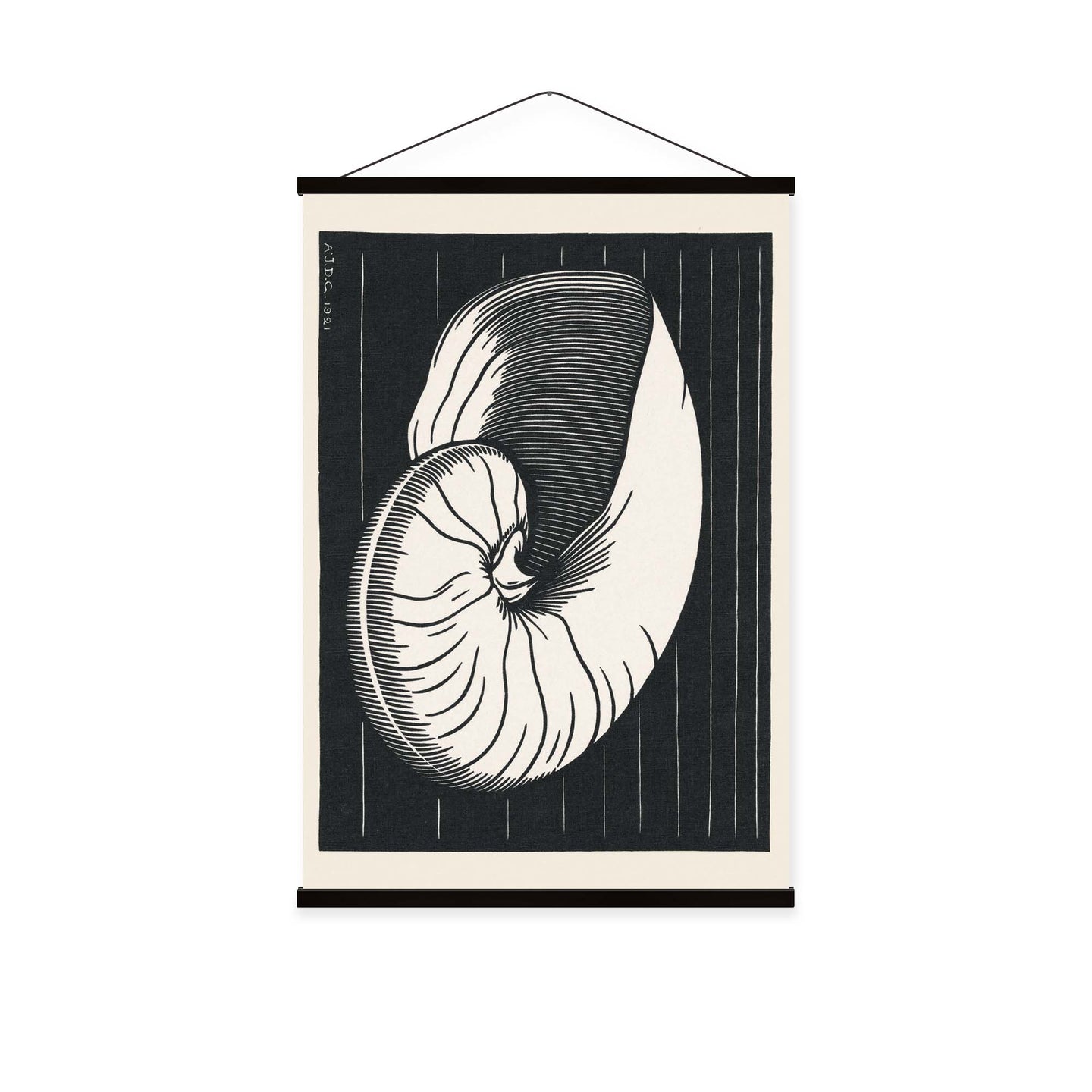 Create an instant room transformation, with the canvas tapestry print: 'Shell by Julie de Graag'. Printed on luxury 260g canvas, Tapestro canvas tapestries hang from magnetic wooden holders, in either teak or black wood. Supplied with a black hanger. This print measures: 60cm x 90cm (24in x 36in). For each item sold, one tree is planted. This helps to offset carbon released during production and shipping, and to create a net positive contribution over the tree's lifetime. Transform your home, and our planet.