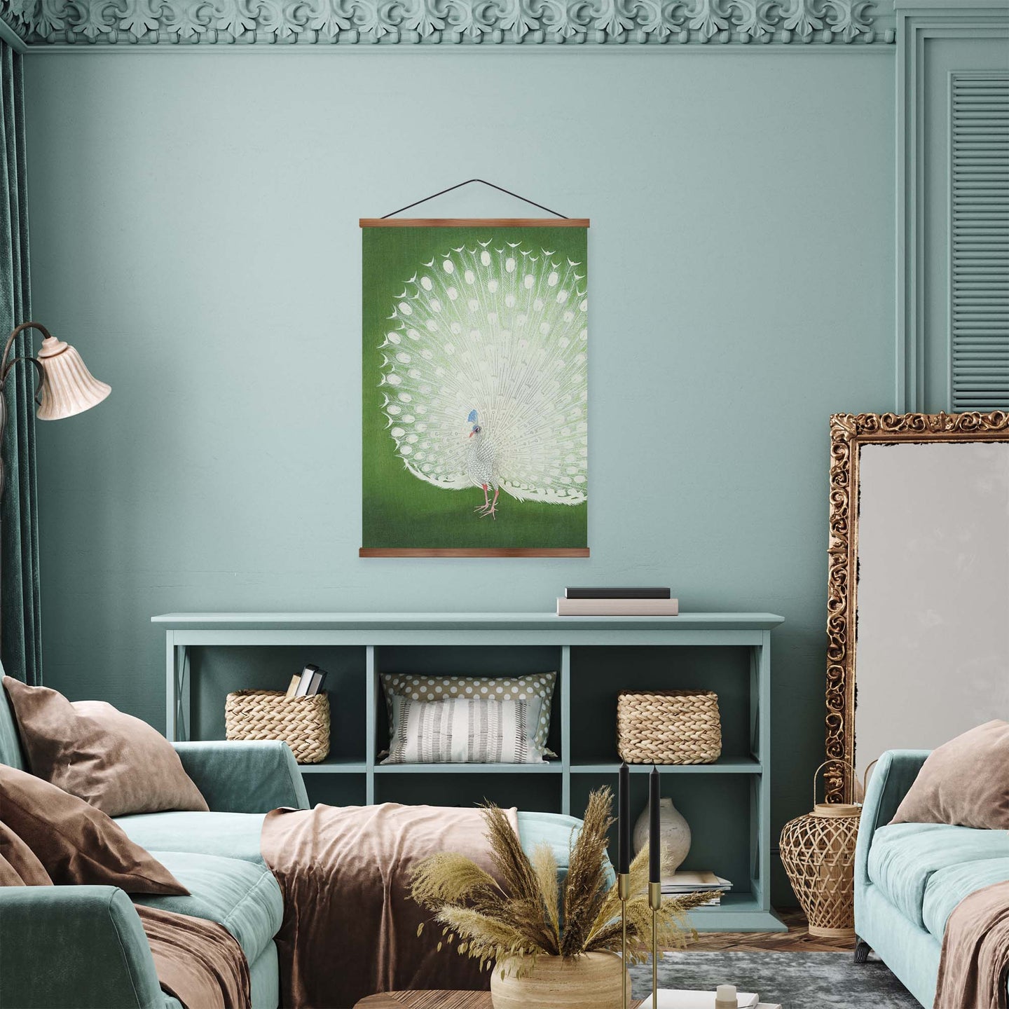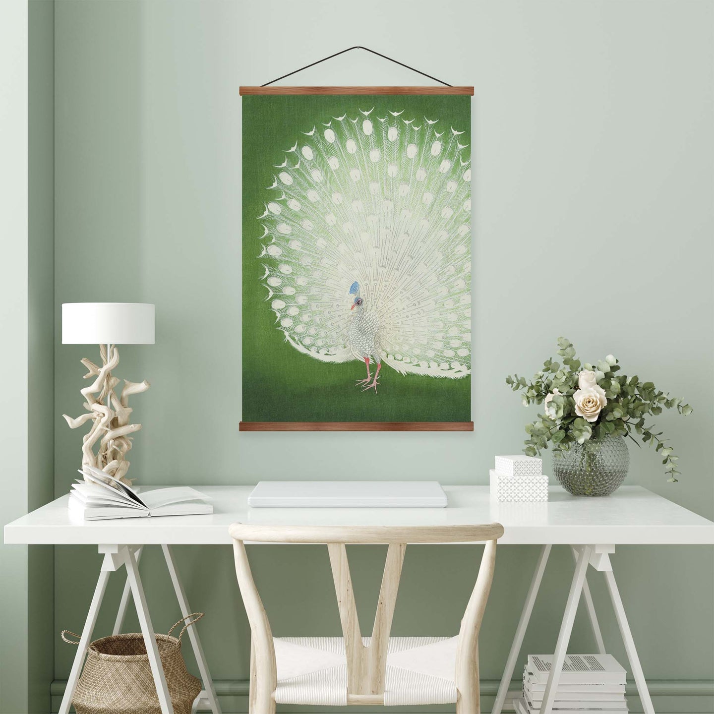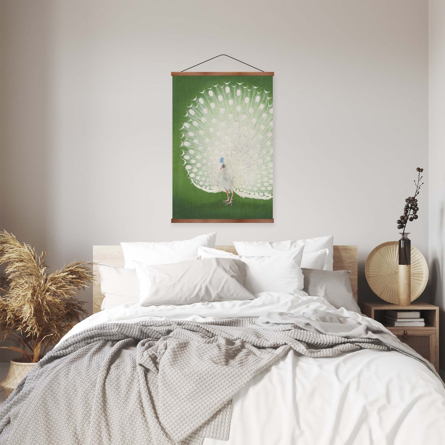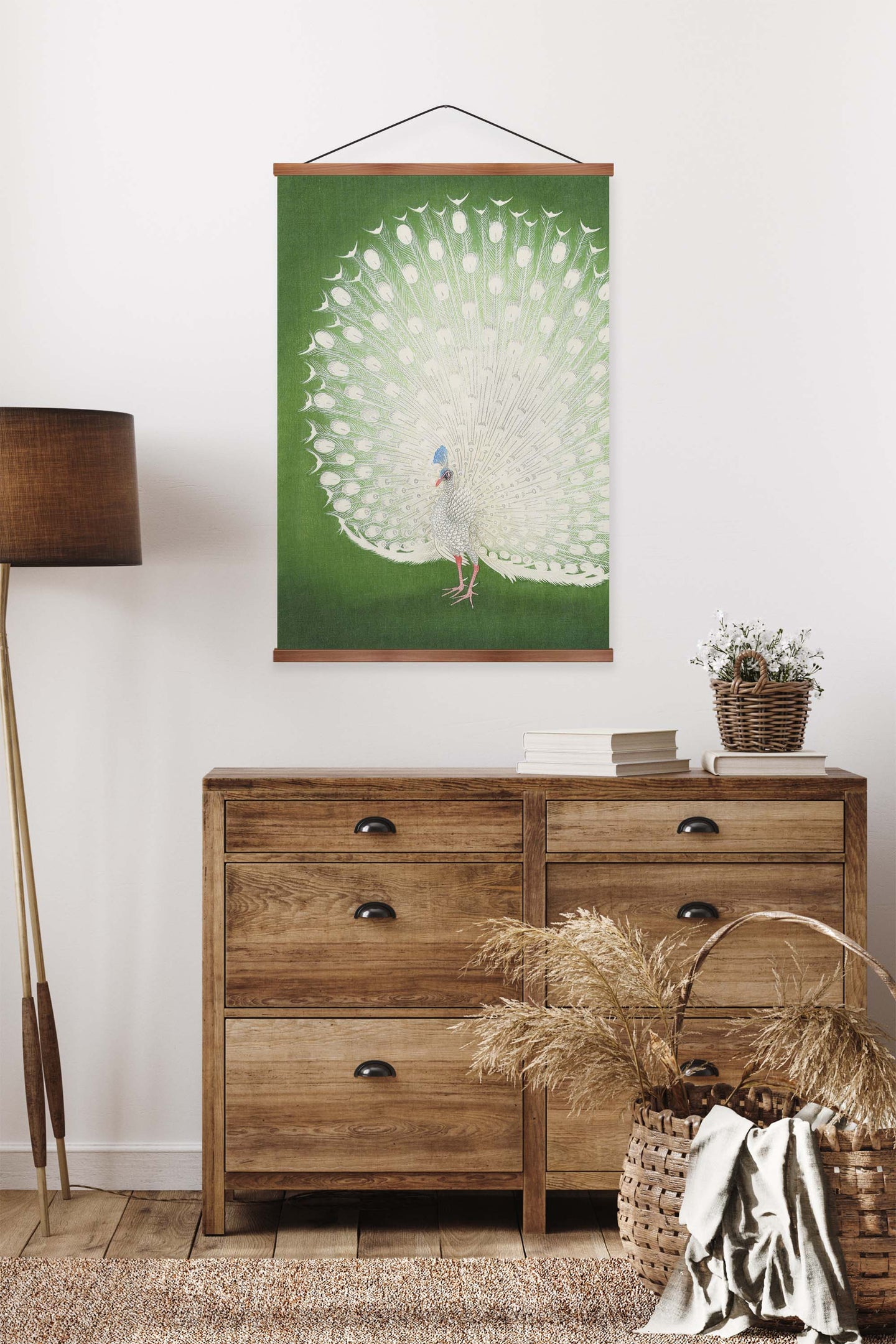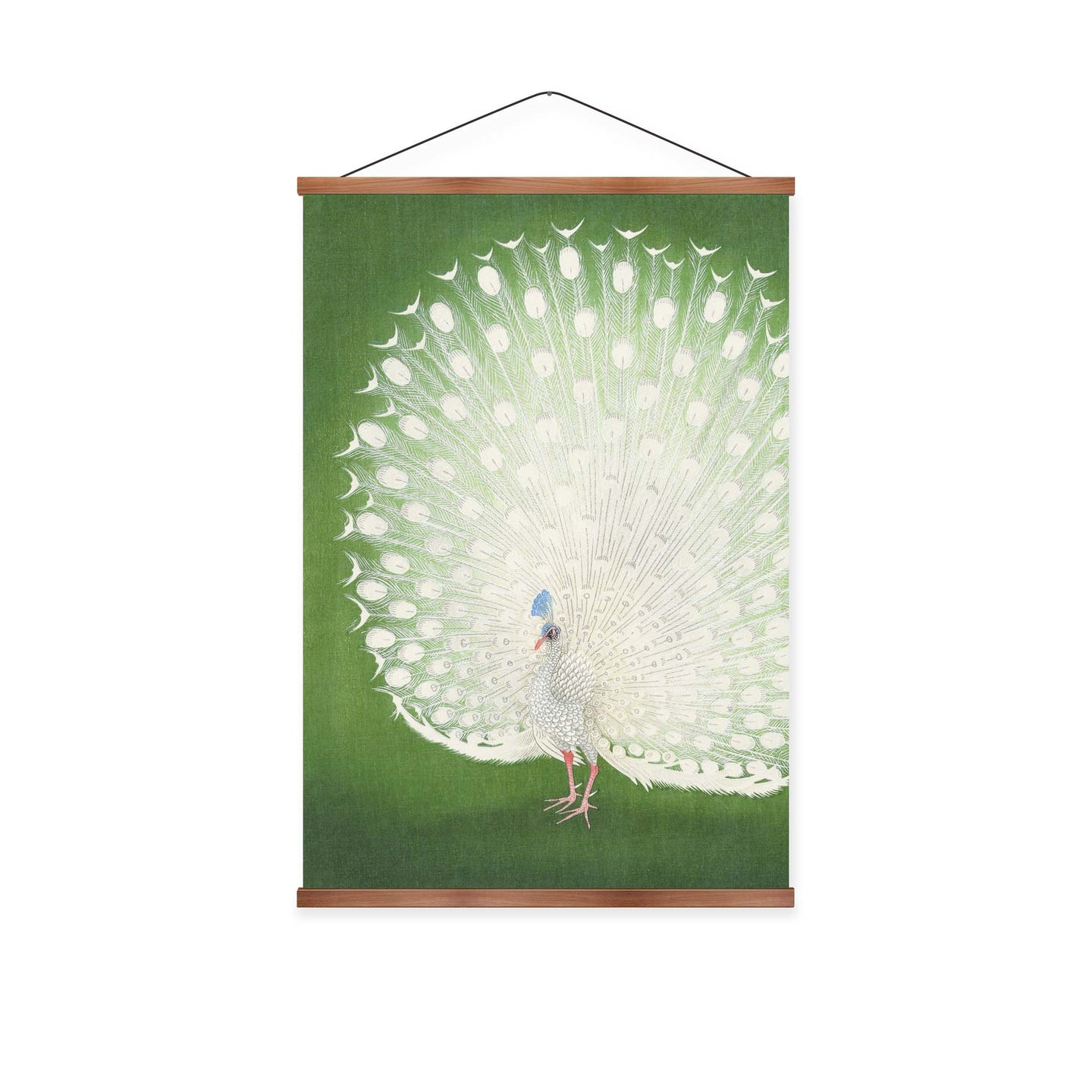 Create an instant room transformation, with the canvas tapestry print: 'Peacock by Ohara Koson'. Printed on luxury 260g canvas, Tapestro canvas tapestries hang from magnetic wooden holders, in either teak or black wood. Supplied with a teak hanger. This print measures: 60cm x 90cm (24in x 36in). For each item sold, one tree is planted. This helps to offset carbon released during production and shipping, and to create a net positive contribution over the tree's lifetime. Transform your home, and our planet.