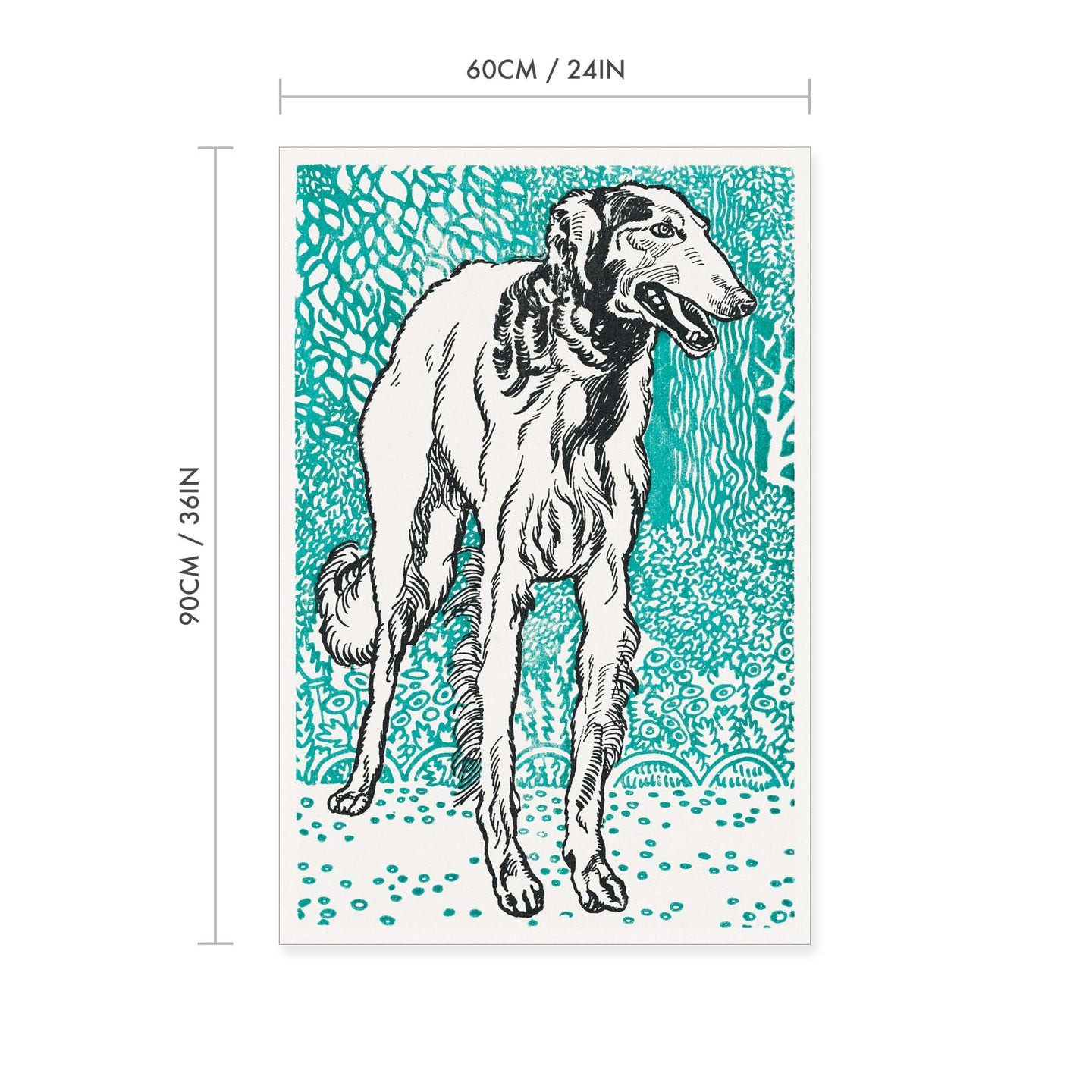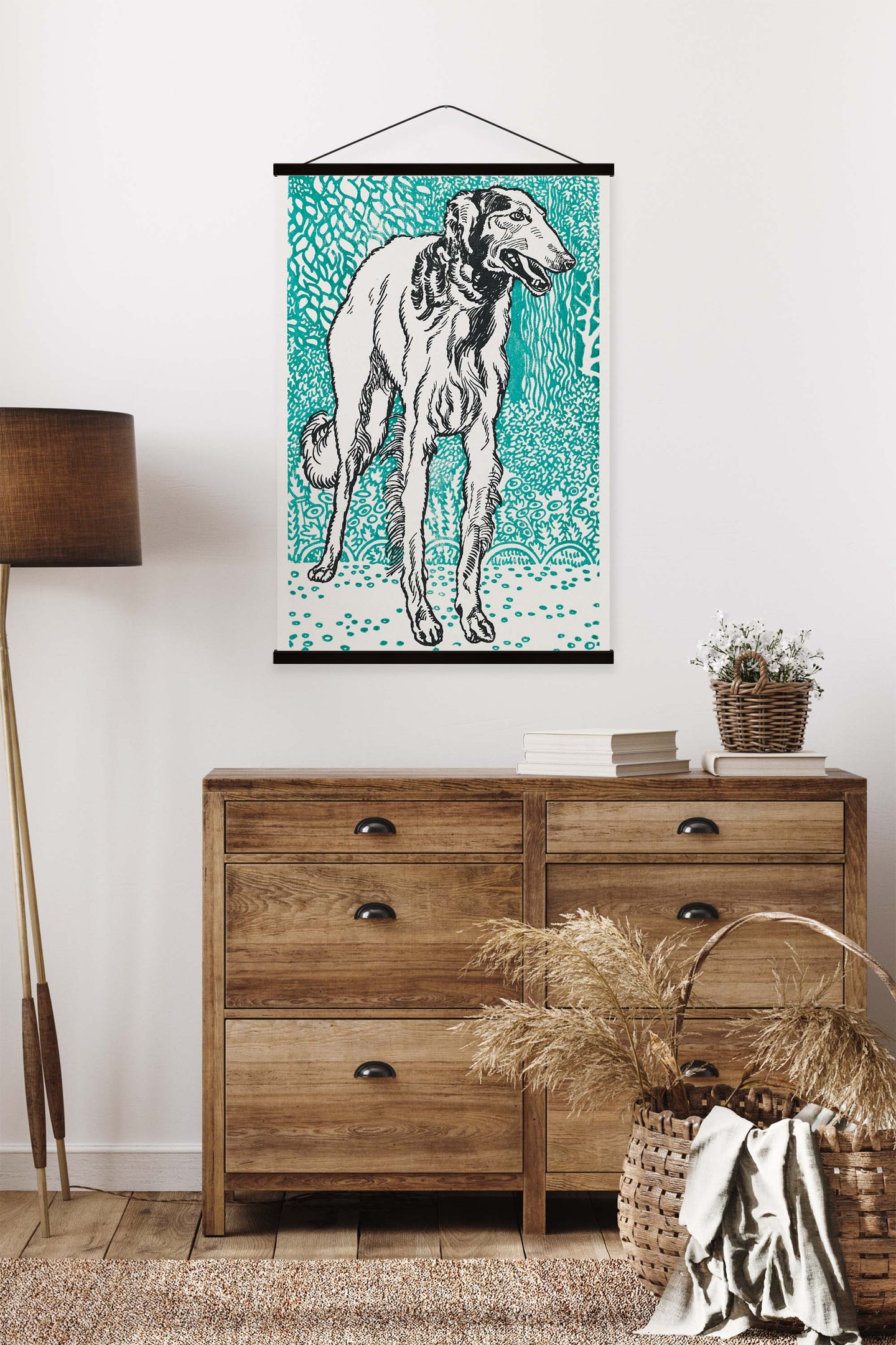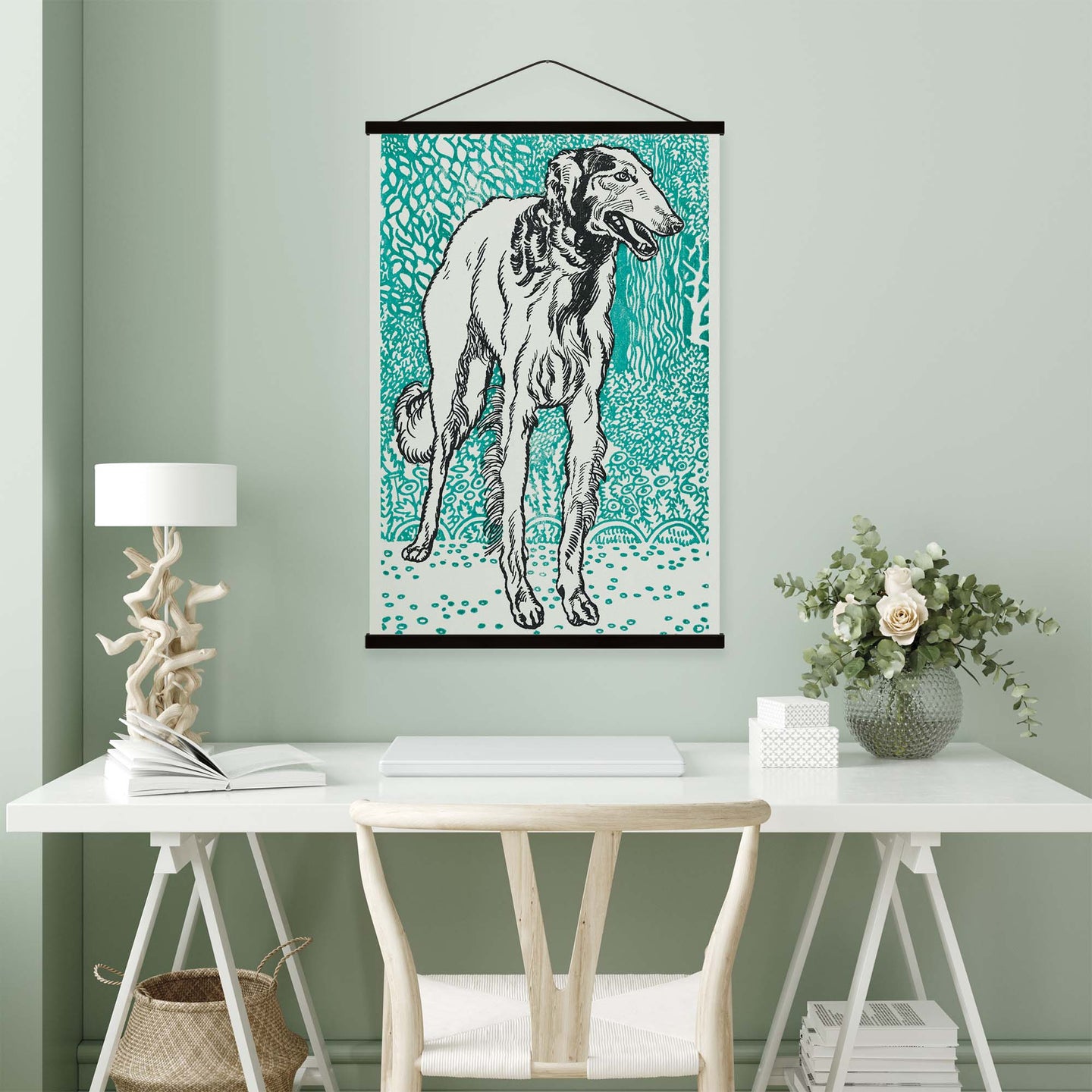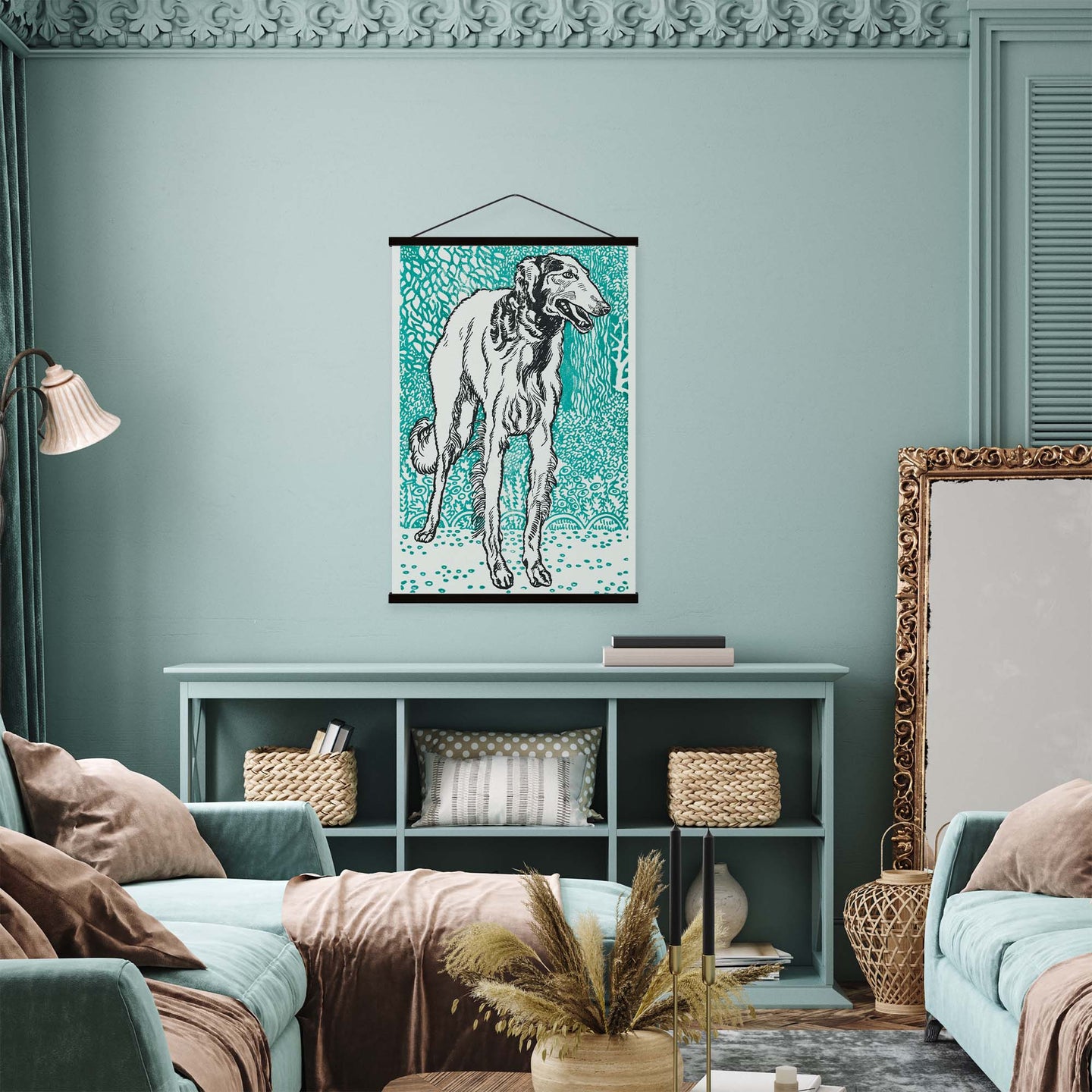 Create an instant room transformation, with the canvas tapestry print: 'Greyhound II Vintage Print by Moriz Jung'. Printed on luxury 260g canvas, Tapestro canvas tapestries hang from magnetic wooden holders, in either teak or black wood. Supplied with a black hanger. This print measures: 60cm x 90cm (24in x 36in). For each item sold, one tree is planted. This helps to offset carbon released during production and shipping, and to create a net positive contribution over the tree's lifetime. Transform your home, and our planet.
