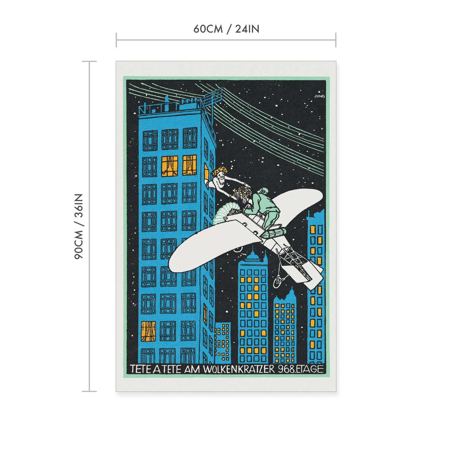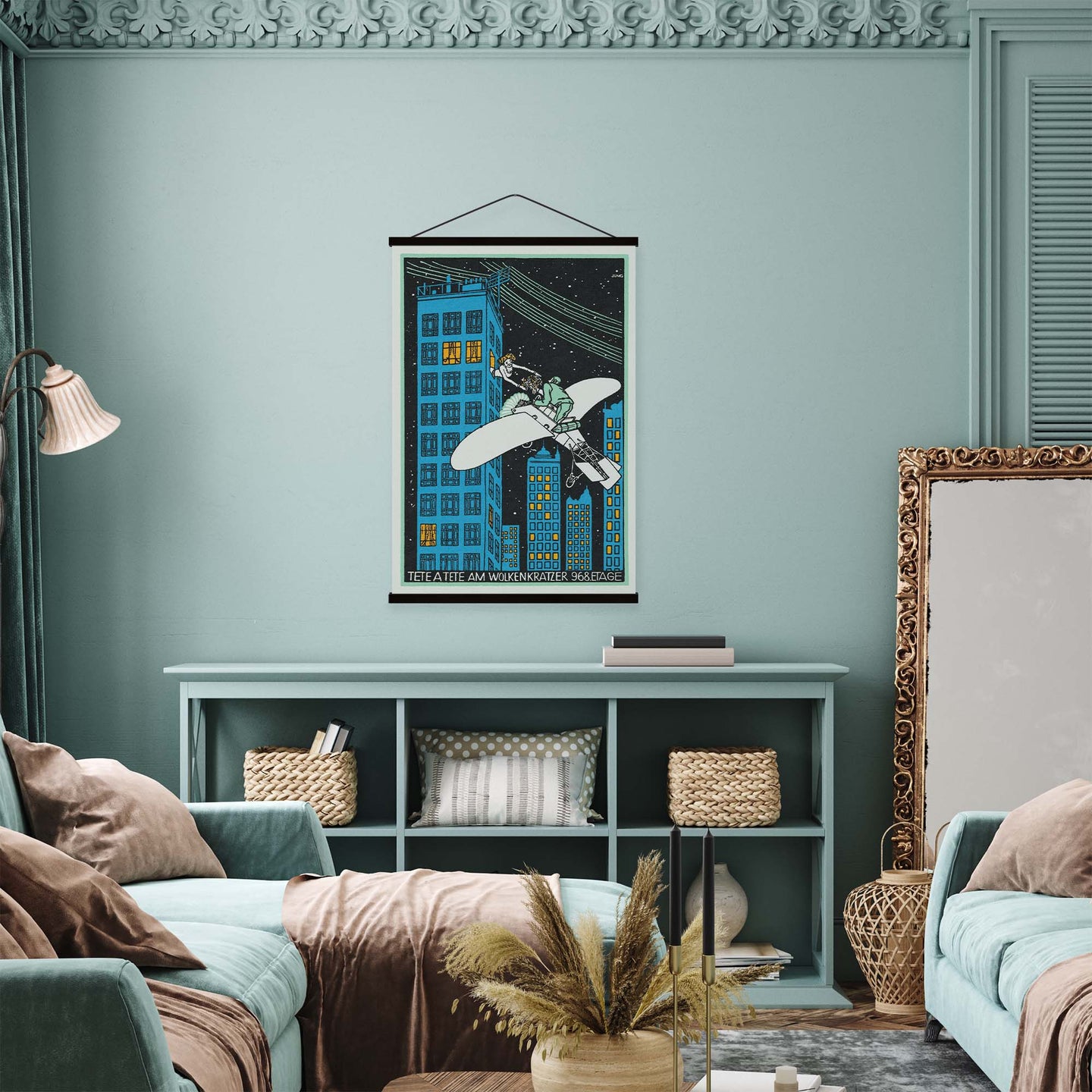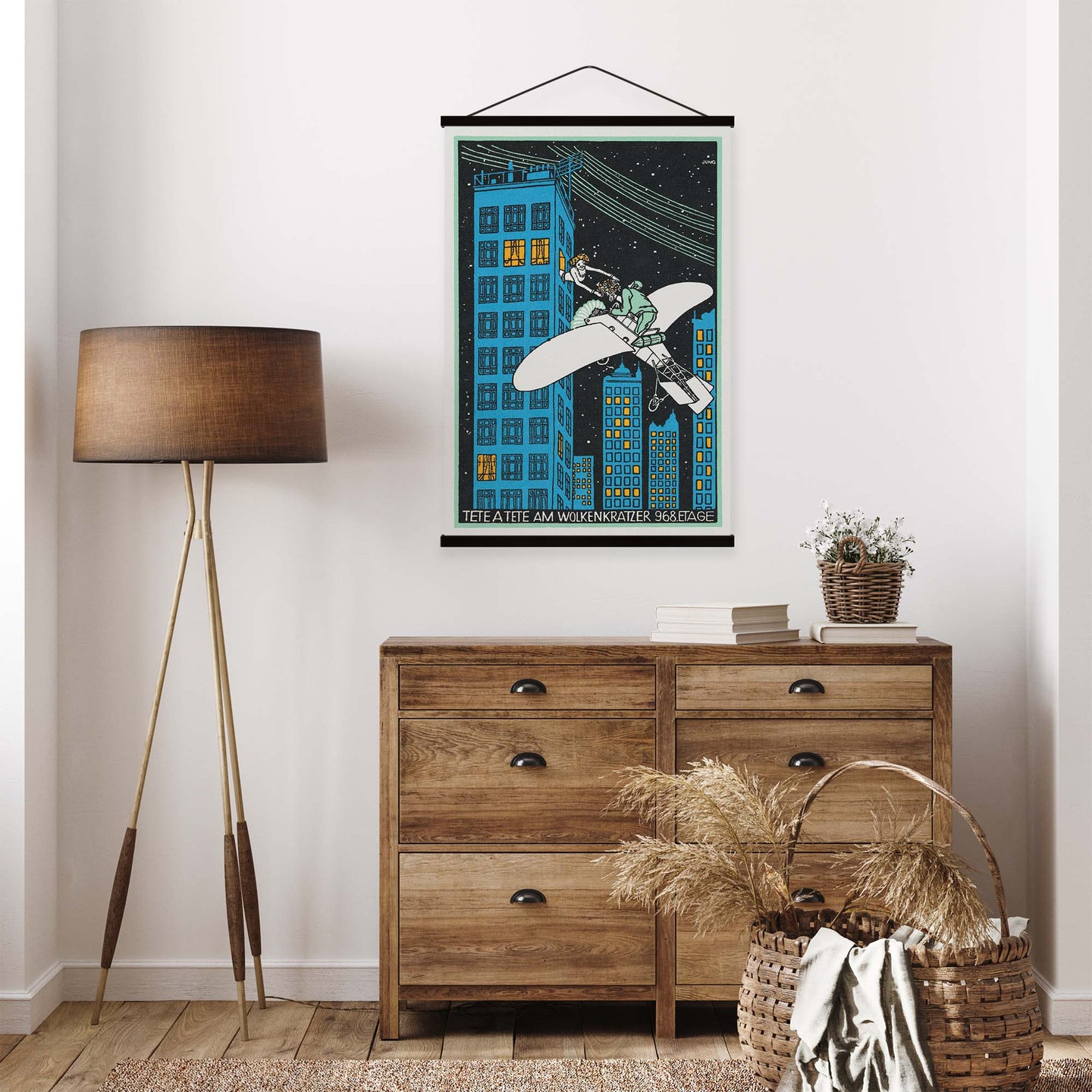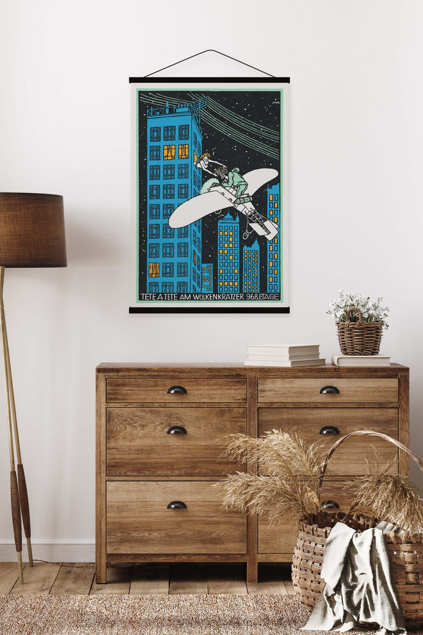 Create an instant room transformation, with the canvas tapestry print: 'Tête á Tête am Wolkenkratzer 968 Etage Vintage Print by Moriz Jung'. Printed on luxury 260g canvas, Tapestro canvas tapestries hang from magnetic wooden holders, in either teak or black wood. Supplied with a black hanger. This print measures: 60cm x 90cm (24in x 36in). For each item sold, one tree is planted. This helps to offset carbon released during production and shipping, and to create a net positive contribution over the tree's lifetime. Transform your home, and our planet.