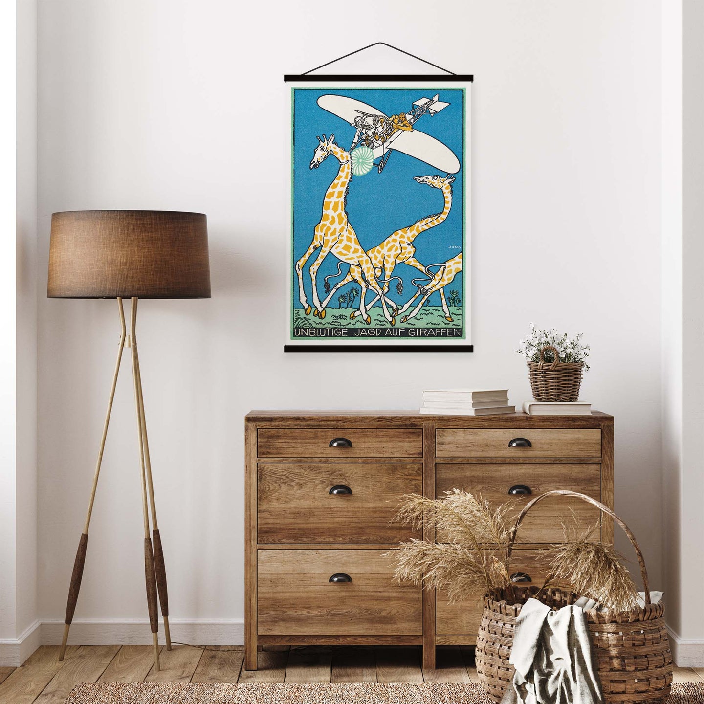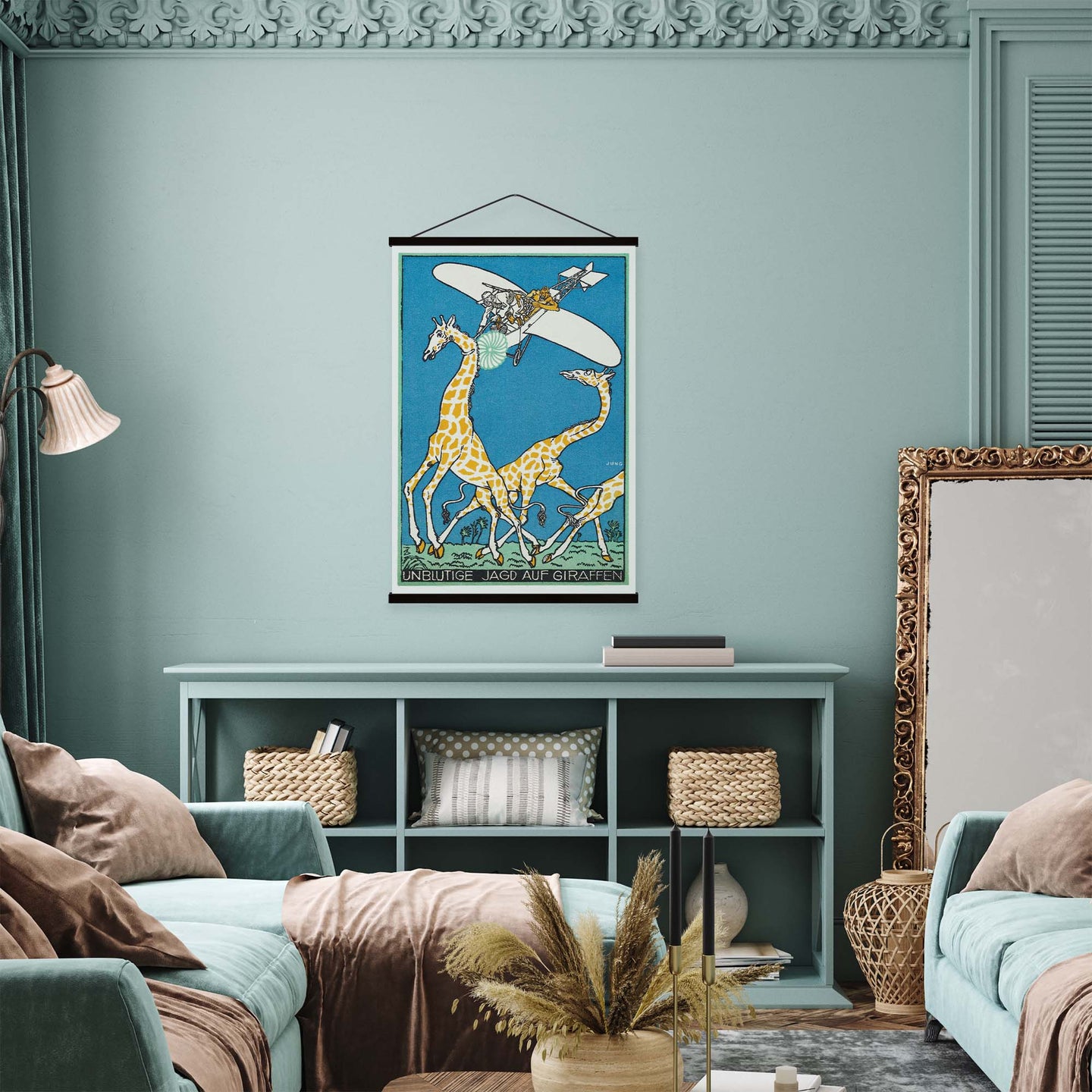 Create an instant room transformation, with the canvas tapestry print: 'Unblutige Jagd auf Giraffen Vintage Print by Moriz Jung'. Printed on luxury 260g canvas, Tapestro canvas tapestries hang from magnetic wooden holders, in either teak or black wood. Supplied with a black hanger. This print measures: 60cm x 90cm (24in x 36in). For each item sold, one tree is planted. This helps to offset carbon released during production and shipping, and to create a net positive contribution over the tree's lifetime. Transform your home, and our planet.