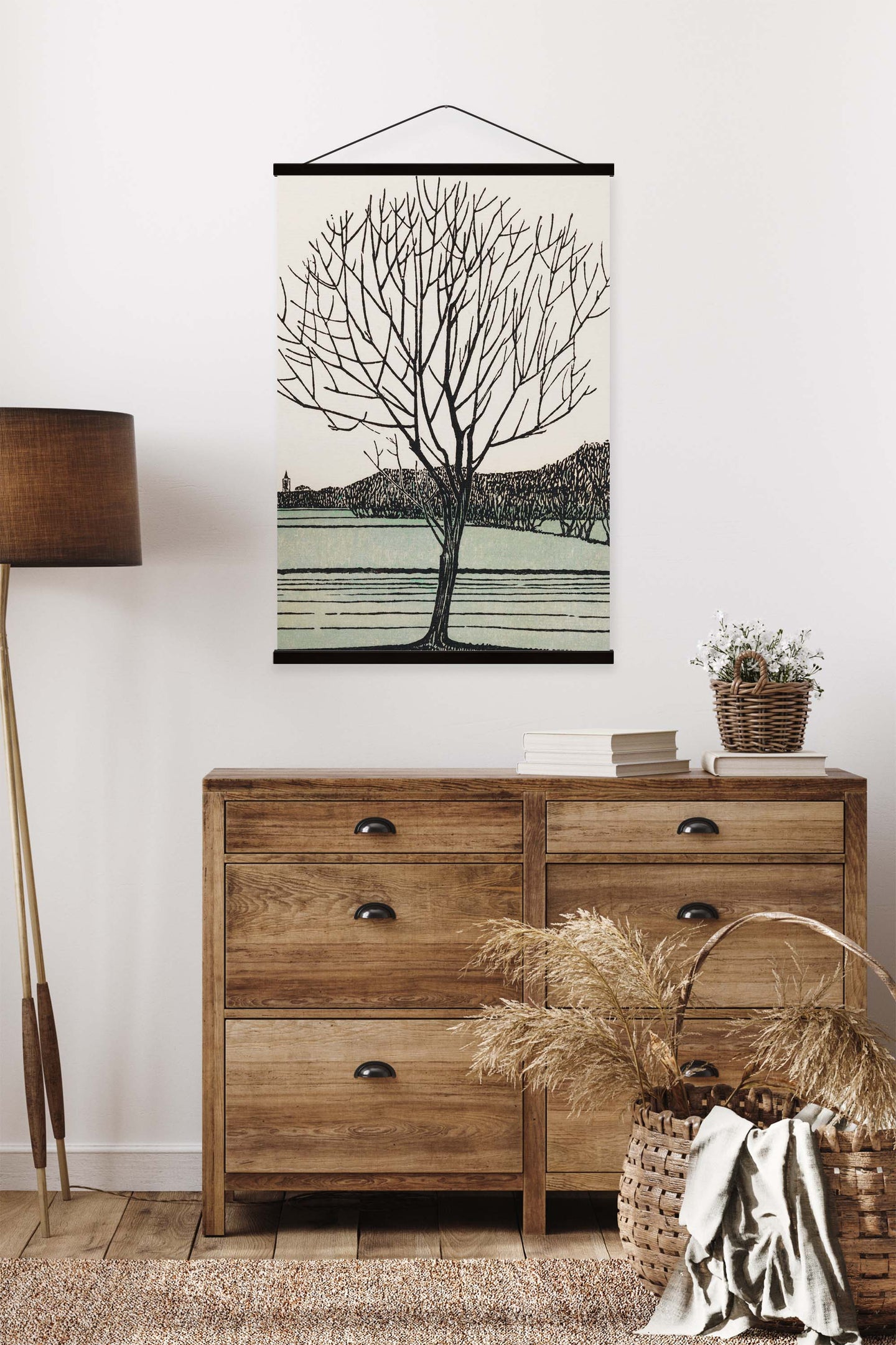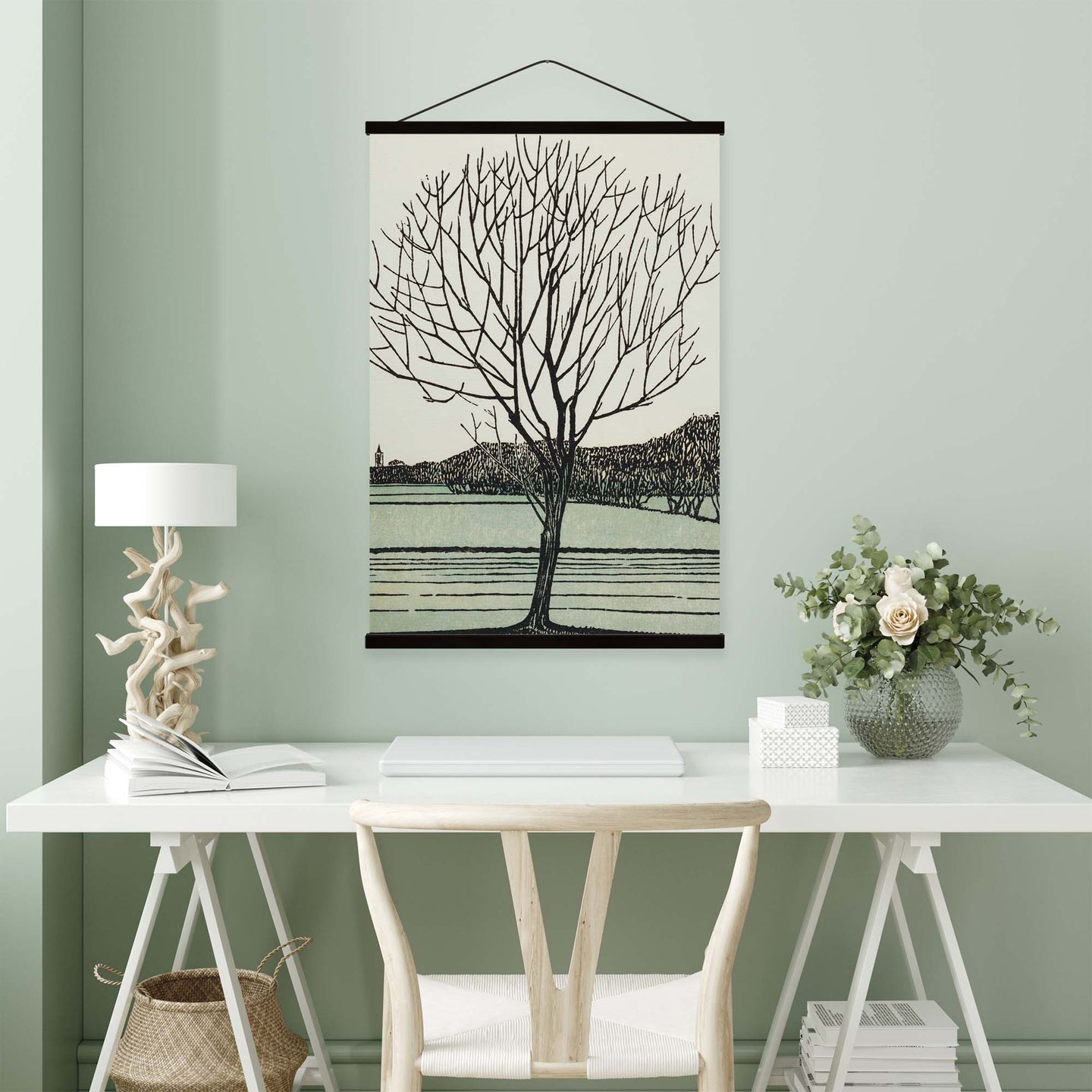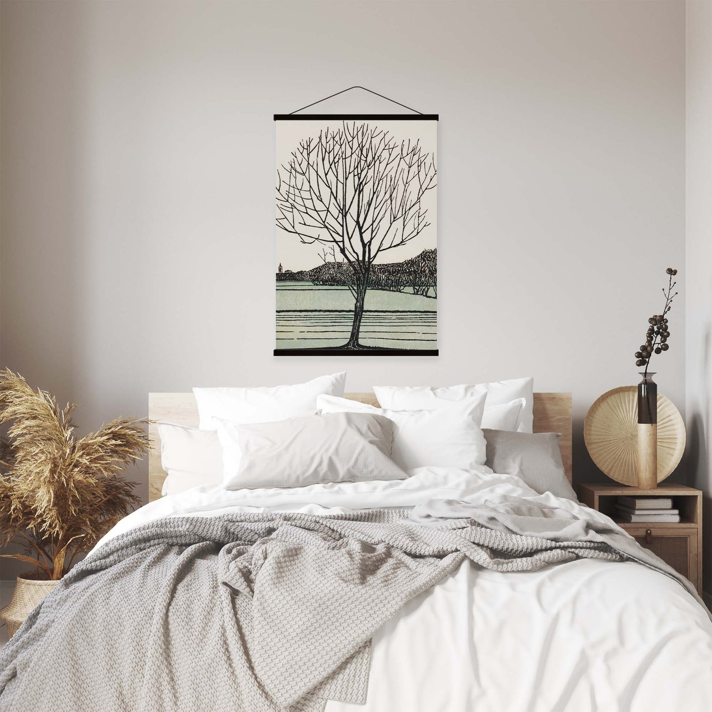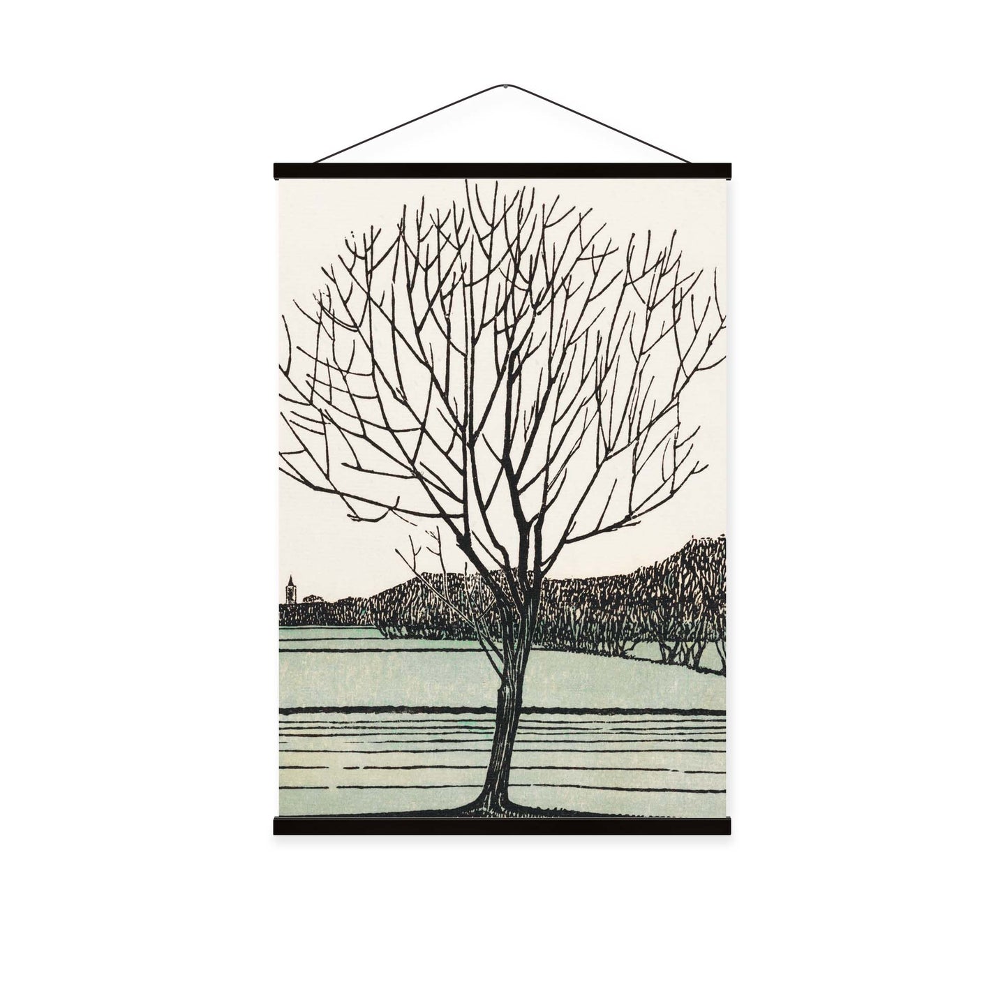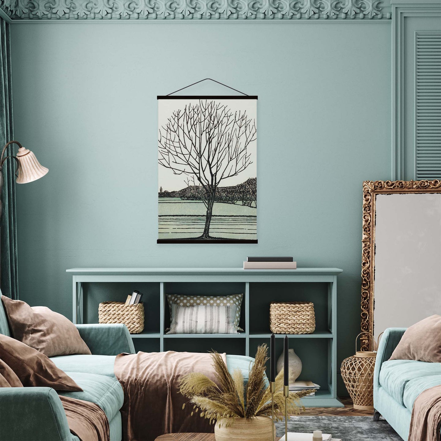 Create an instant room transformation, with the canvas tapestry print: 'Bald Tree Vintage Print by Julie de Graag'. Printed on luxury 260g canvas, Tapestro canvas tapestries hang from magnetic wooden holders, in either teak or black wood. Supplied with a black hanger. This print measures: 60cm x 90cm (24in x 36in). For each item sold, one tree is planted. This helps to offset carbon released during production and shipping, and to create a net positive contribution over the tree's lifetime. Transform your home, and our planet.