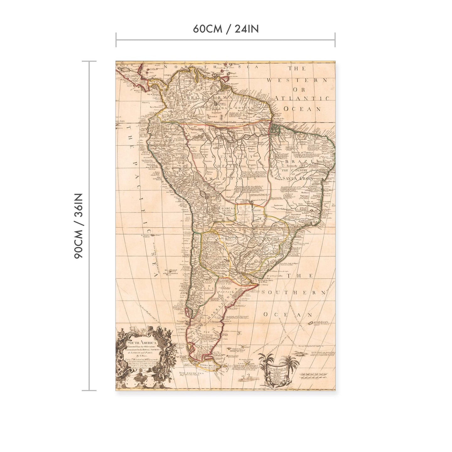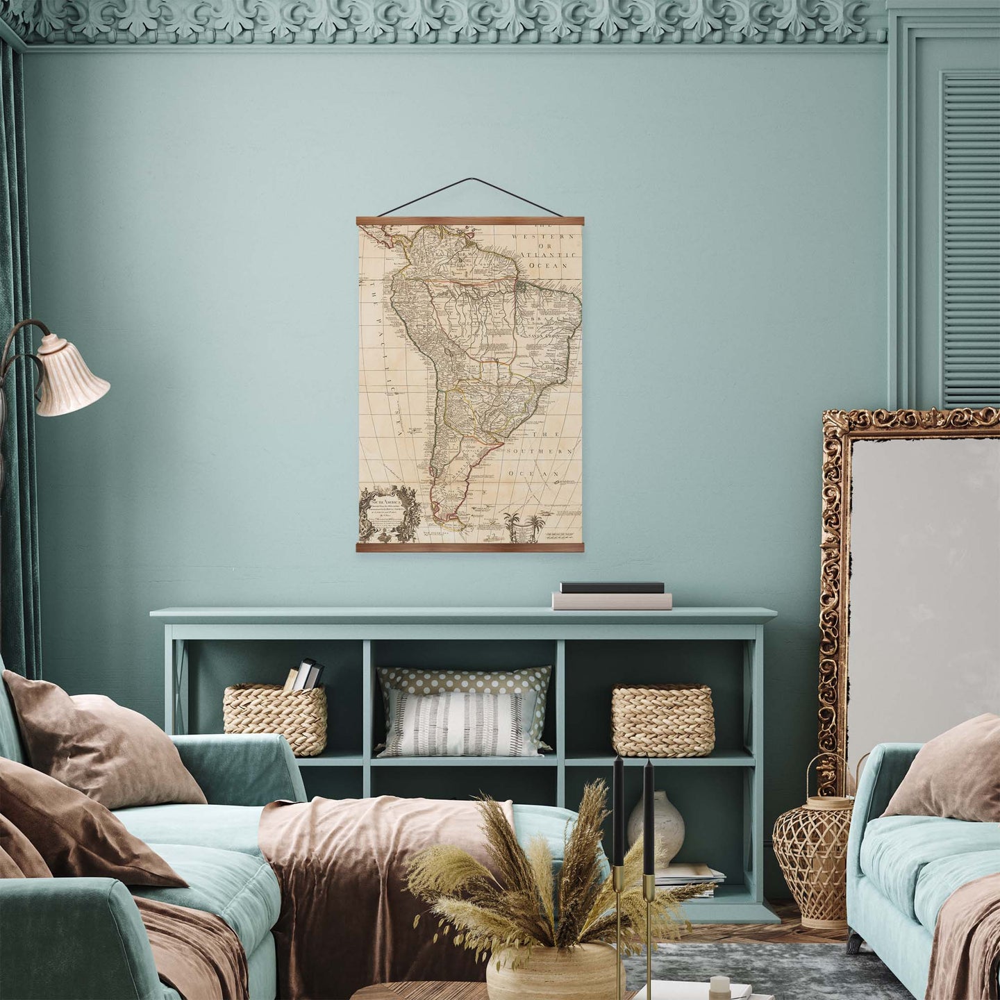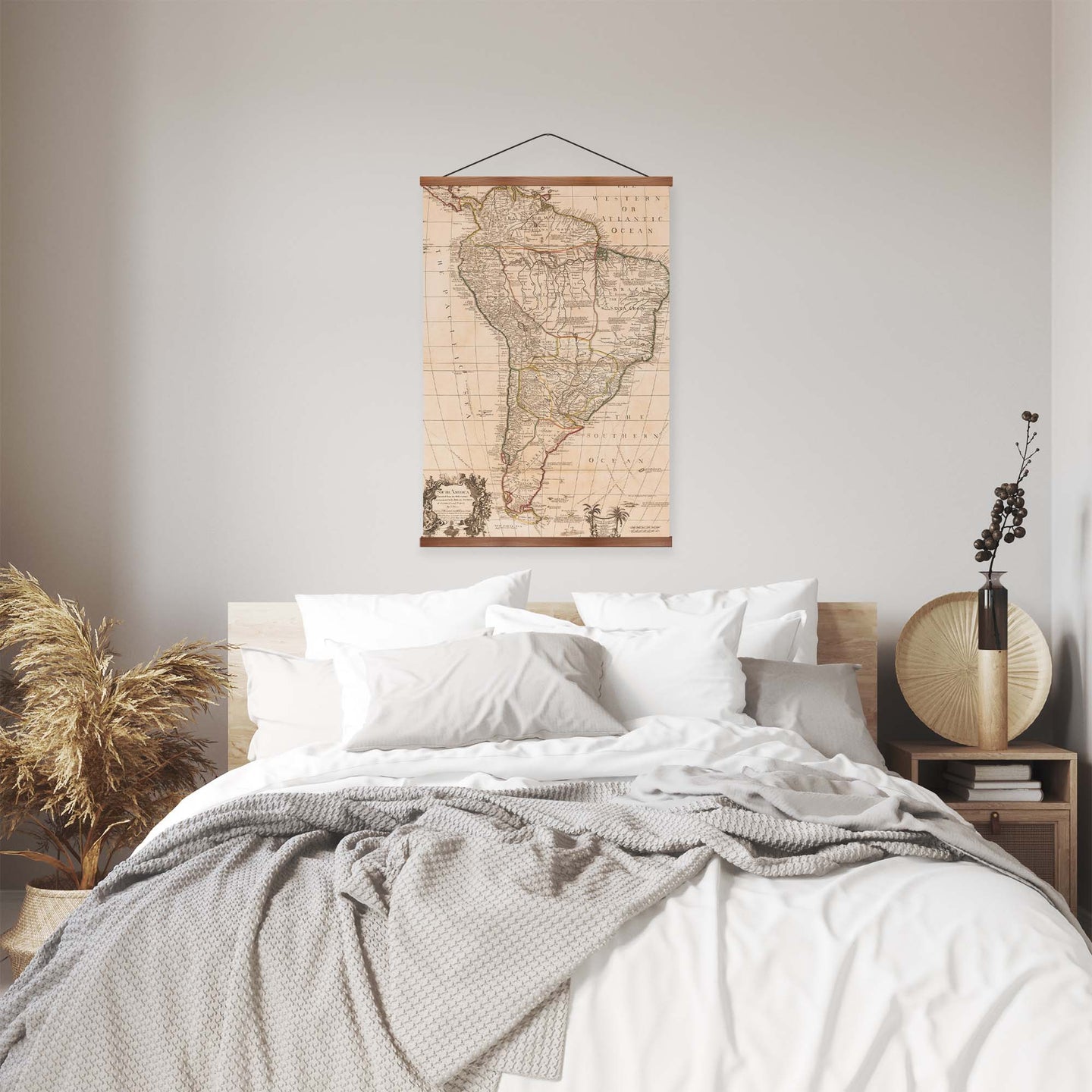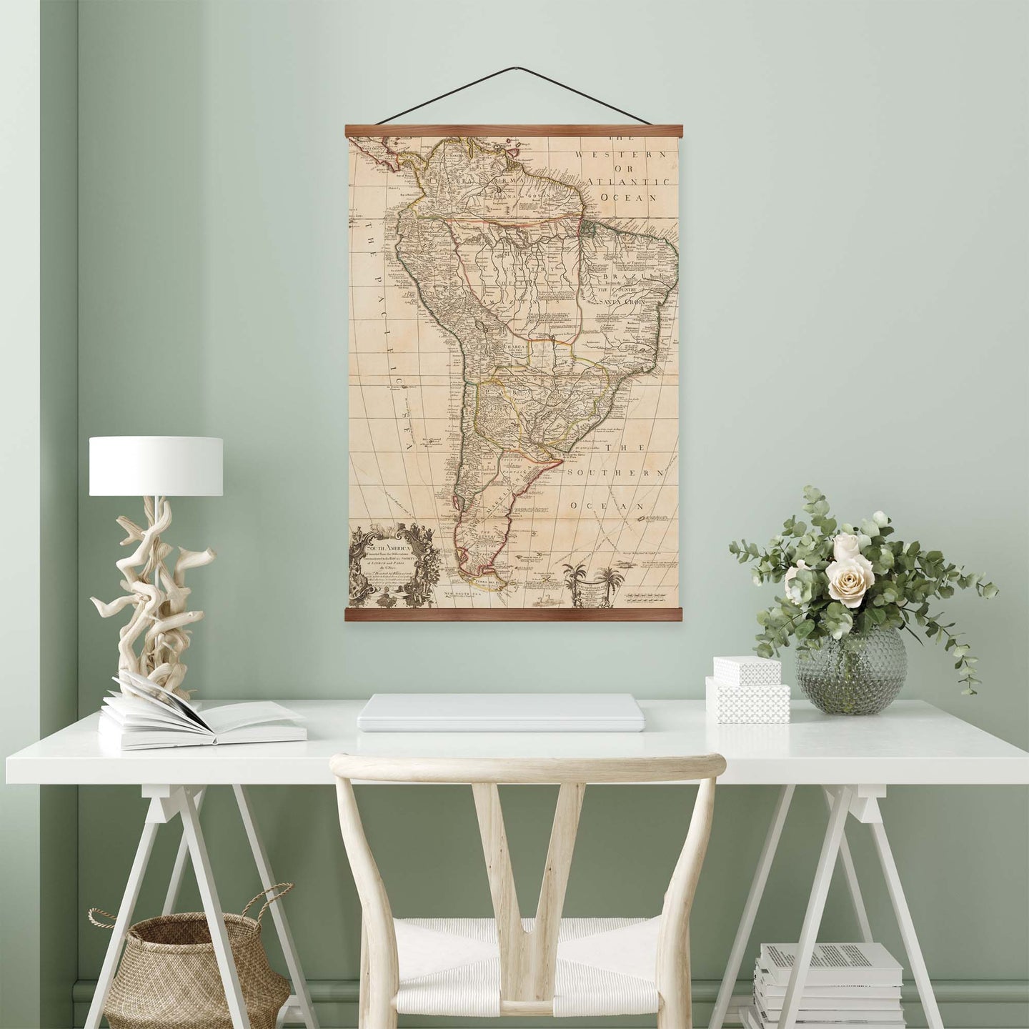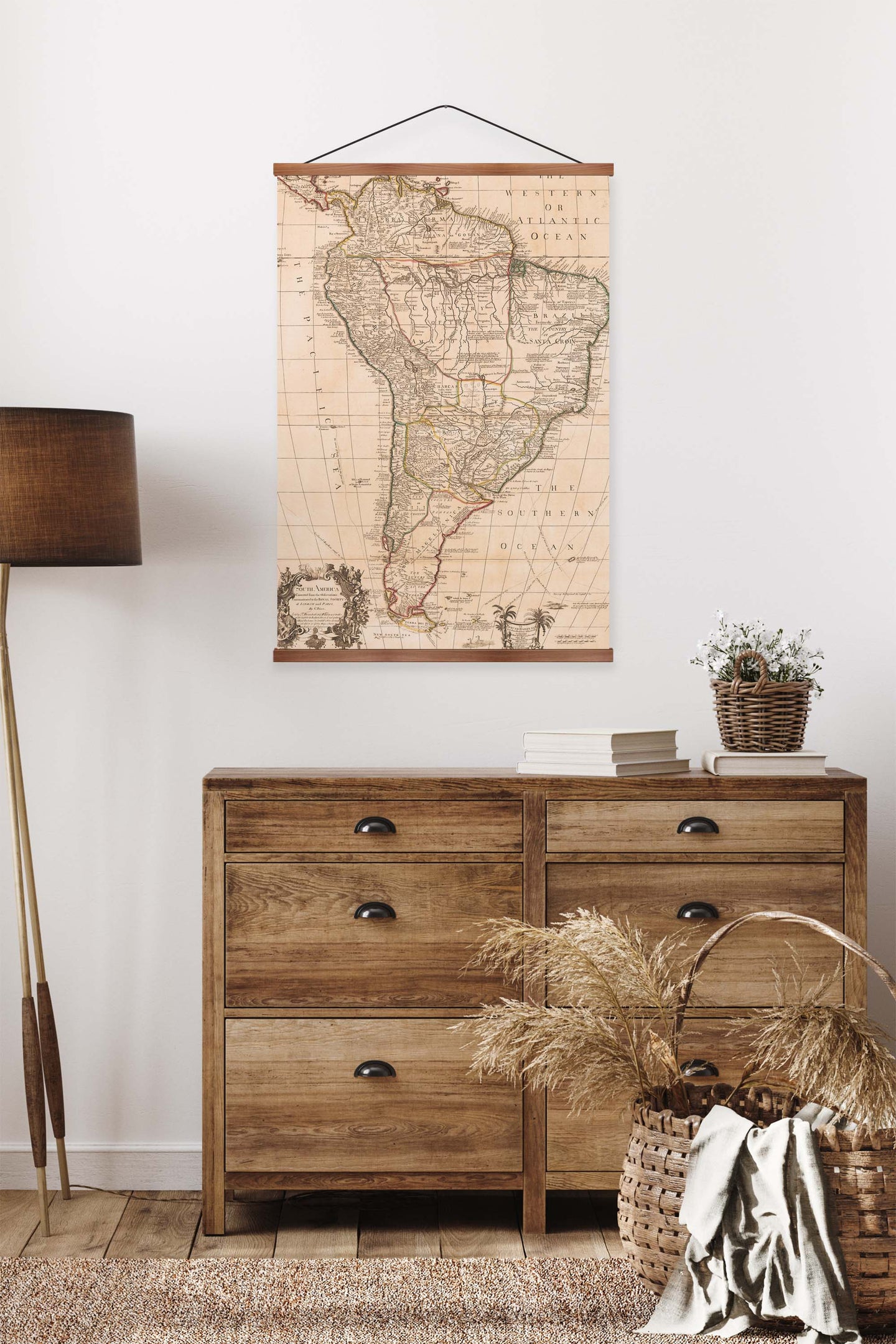 Create an instant room transformation, with the canvas tapestry print: 'South America Vintage Map'. Printed on luxury 260g canvas, Tapestro canvas tapestries hang from magnetic wooden holders, in either teak or black wood. Supplied with a teak hanger. This print measures: 60cm x 90cm (24in x 36in). For each item sold, one tree is planted. This helps to offset carbon released during production and shipping, and to create a net positive contribution over the tree's lifetime. Transform your home, and our planet.