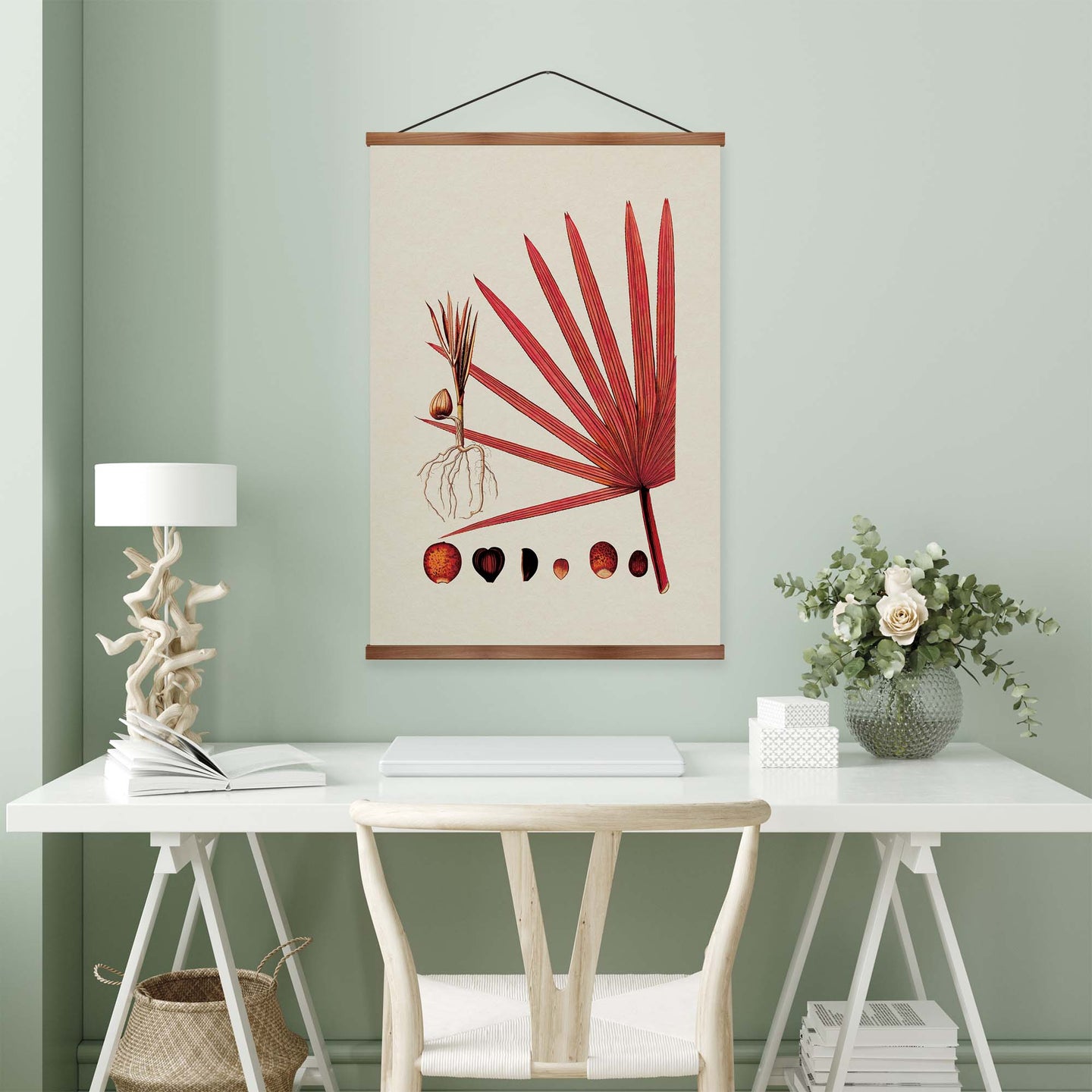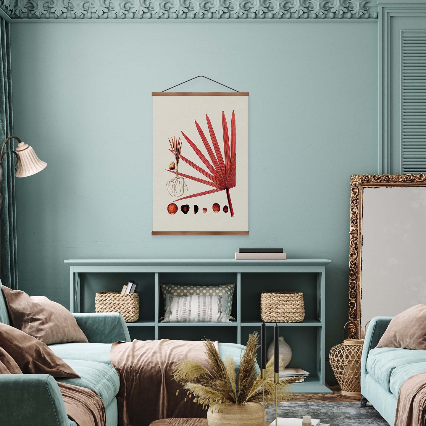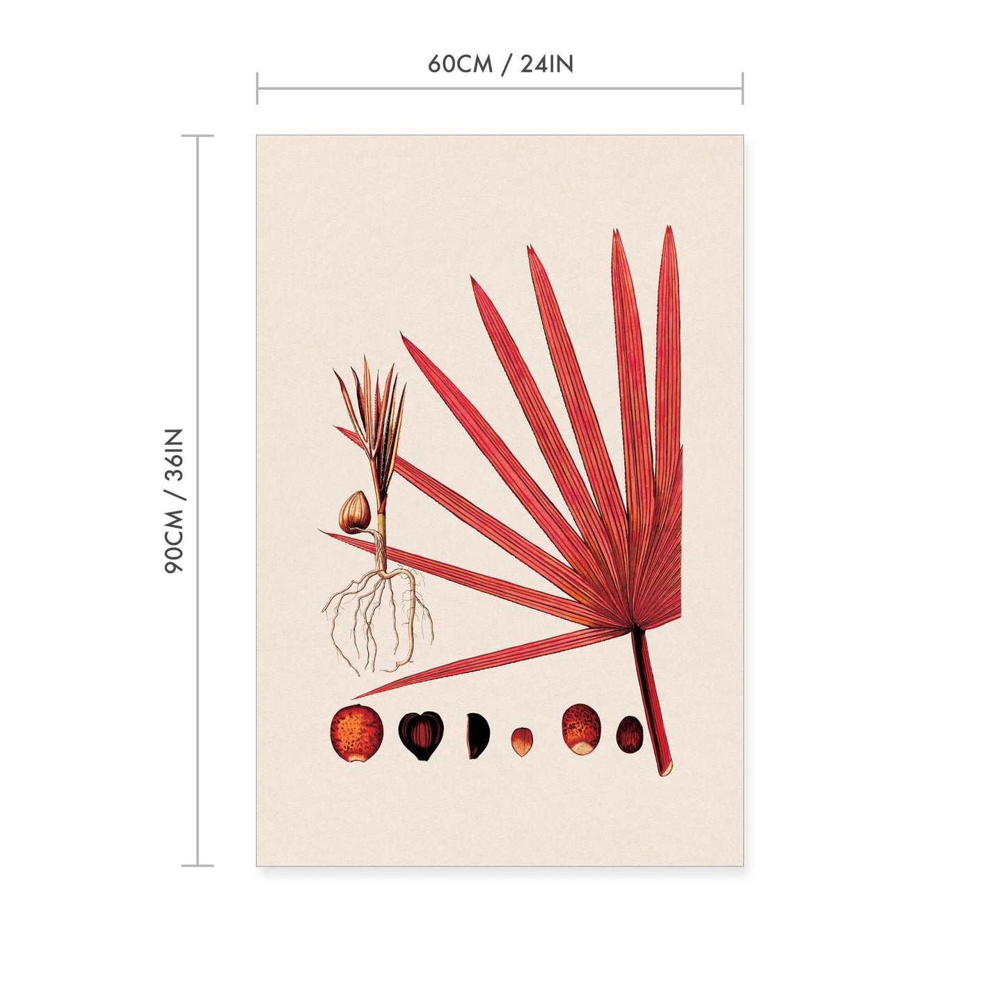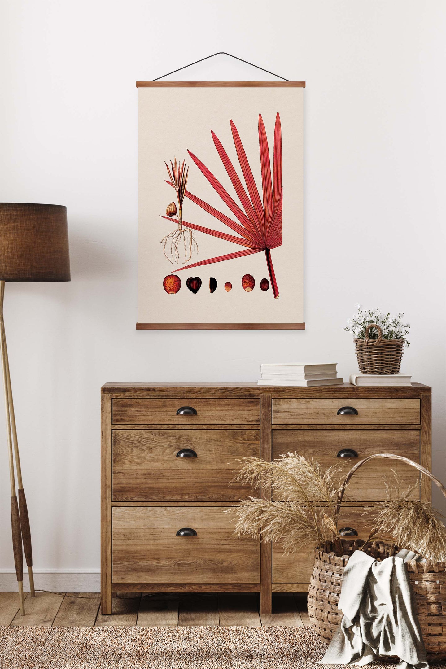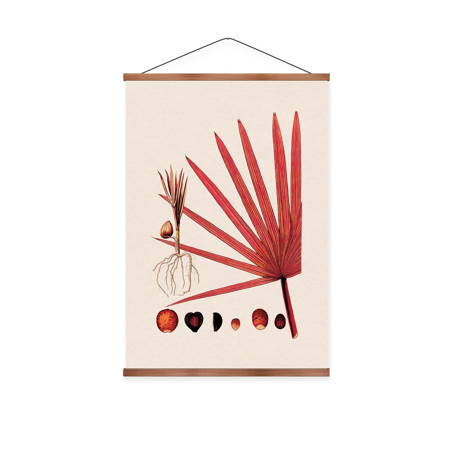 Create an instant room transformation, with the canvas tapestry print: 'Red Latan Palm Vintage Print'. Printed on luxury 260g canvas, Tapestro canvas tapestries hang from magnetic wooden holders, in either teak or black wood. Supplied with a teak hanger. This print measures: 60cm x 90cm (24in x 36in). For each item sold, one tree is planted. This helps to offset carbon released during production and shipping, and to create a net positive contribution over the tree's lifetime. Transform your home, and our planet.