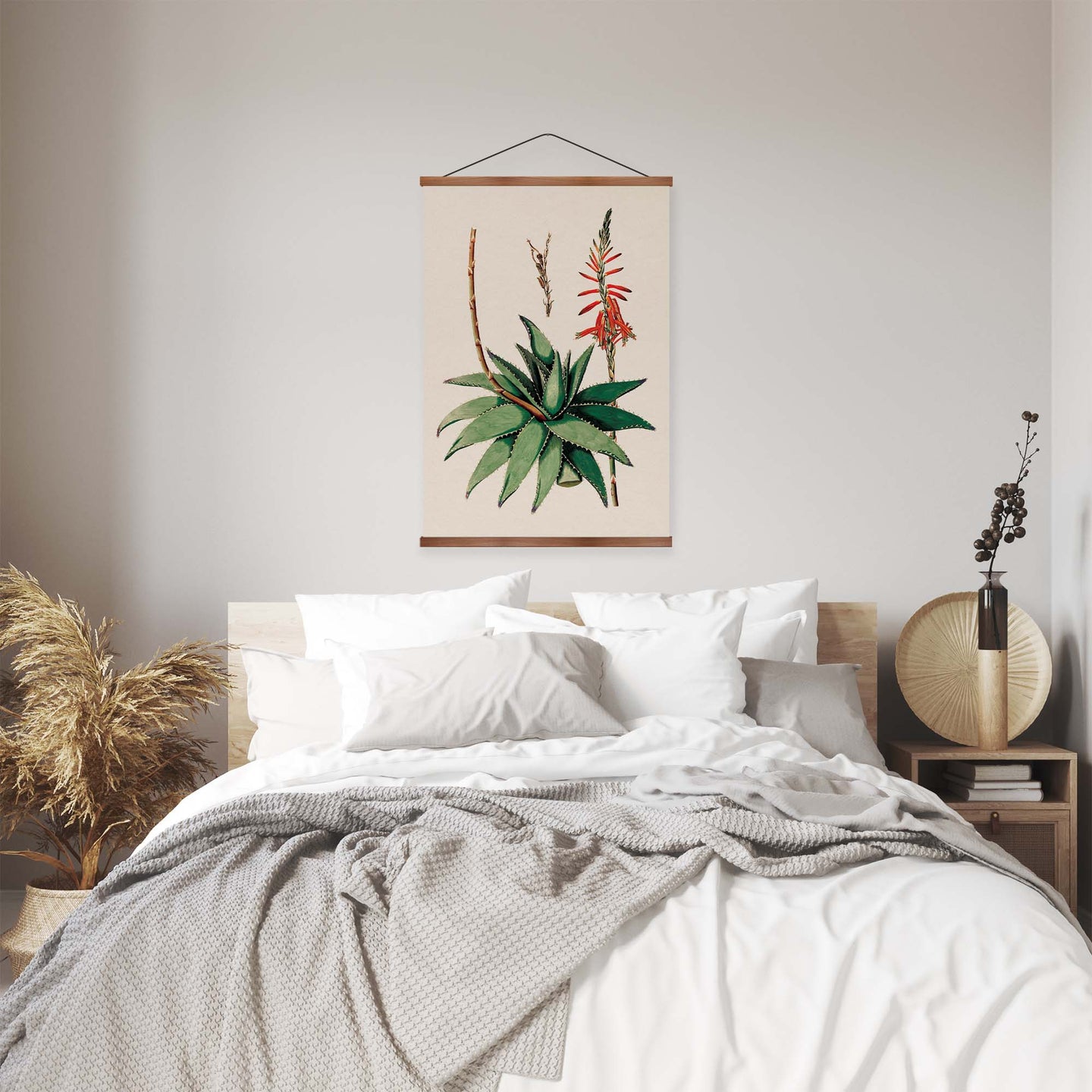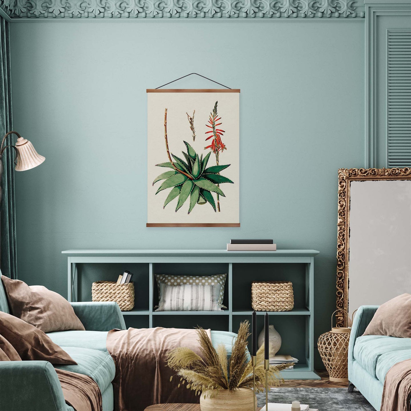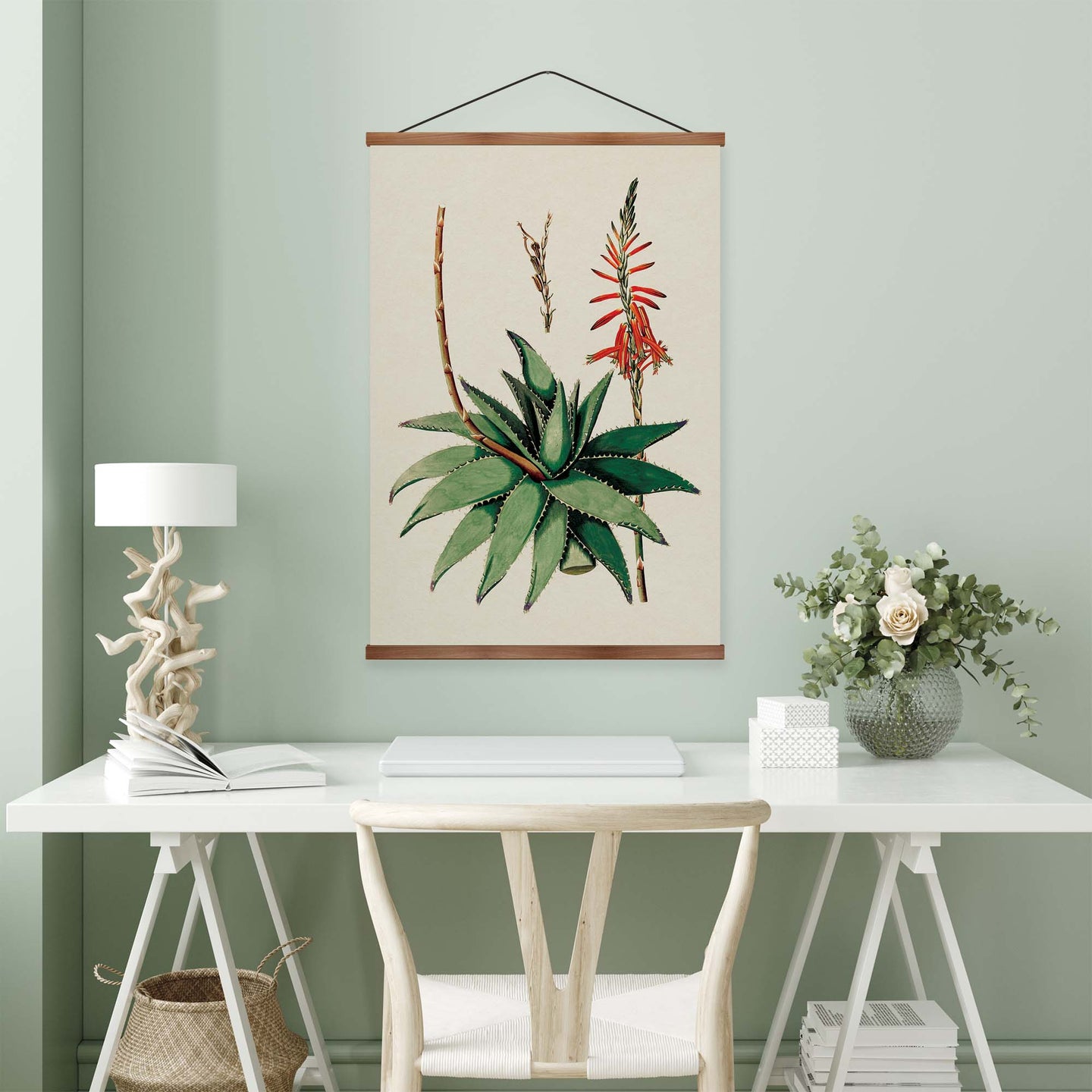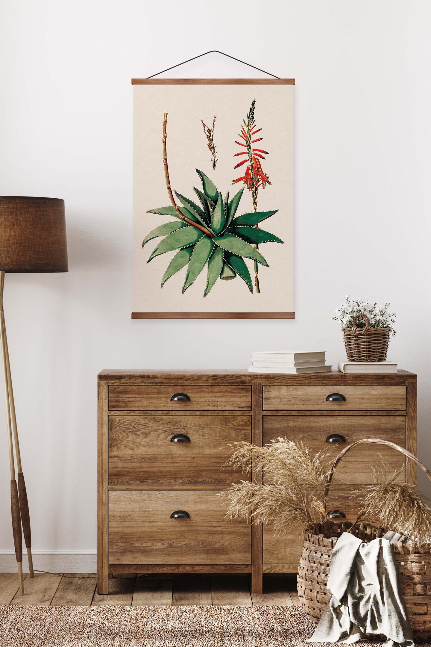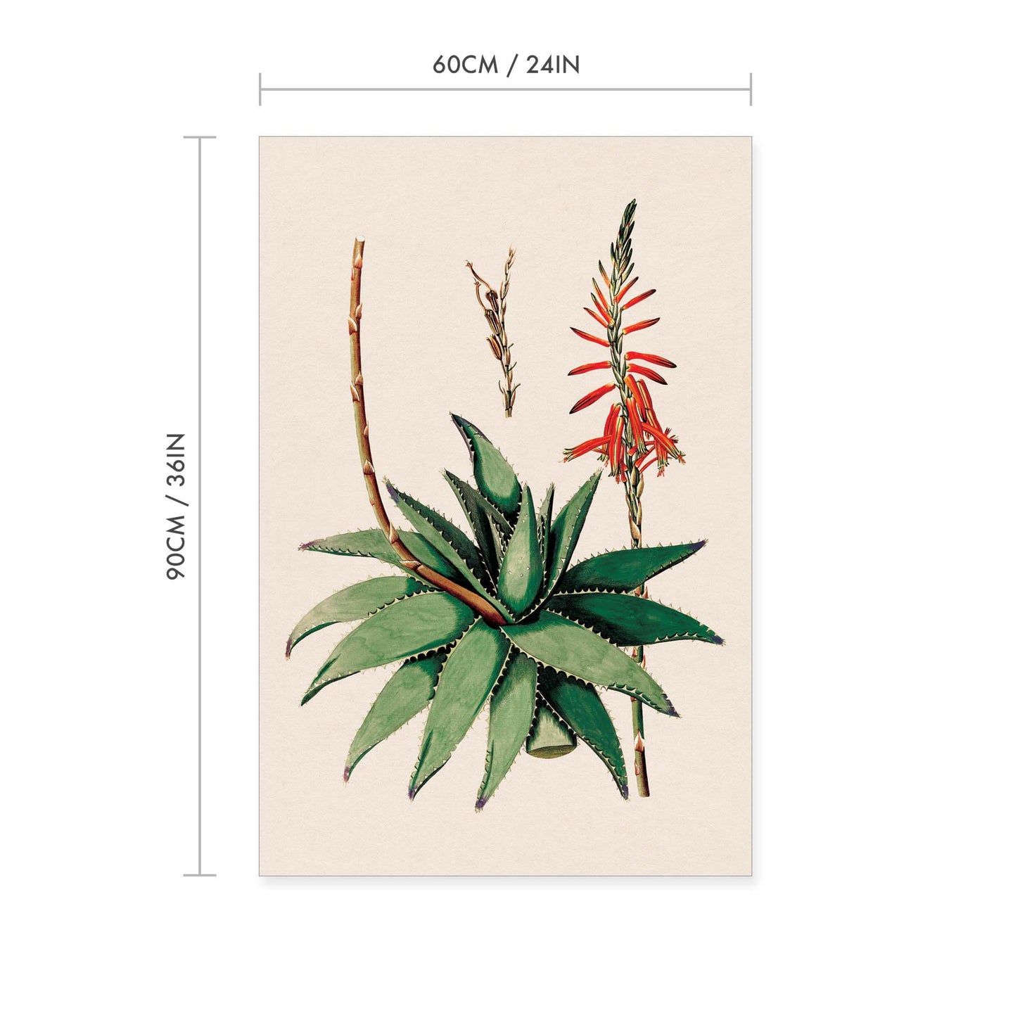Create an instant room transformation, with the canvas tapestry print: 'Aloe Vera Vintage Print'. Printed on luxury 260g canvas, Tapestro canvas tapestries hang from magnetic wooden holders, in either teak or black wood. Supplied with a teak hanger. This print measures: 60cm x 90cm (24in x 36in). For each item sold, one tree is planted. This helps to offset carbon released during production and shipping, and to create a net positive contribution over the tree's lifetime. Transform your home, and our planet.