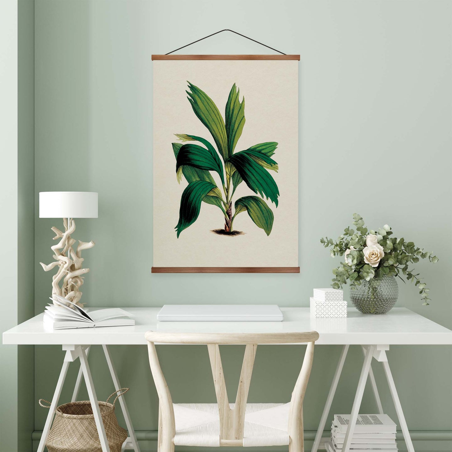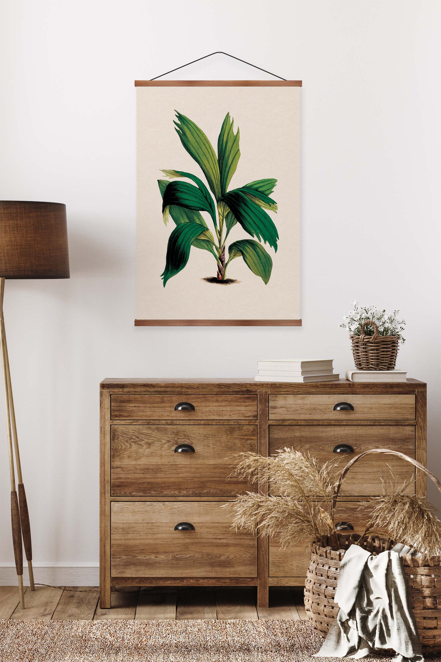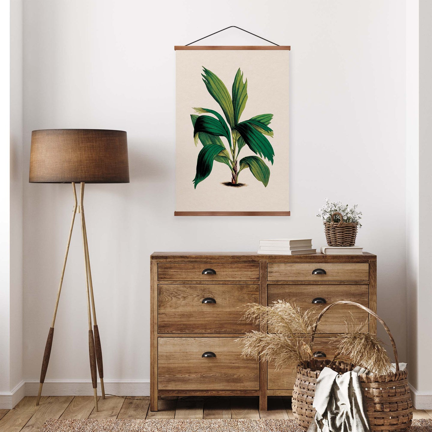 Create an instant room transformation, with the canvas tapestry print: 'Areca Palm Vintage Print'. Printed on luxury 260g canvas, Tapestro canvas tapestries hang from magnetic wooden holders, in either teak or black wood. Supplied with a teak hanger. This print measures: 60cm x 90cm (24in x 36in). For each item sold, one tree is planted. This helps to offset carbon released during production and shipping, and to create a net positive contribution over the tree's lifetime. Transform your home, and our planet.