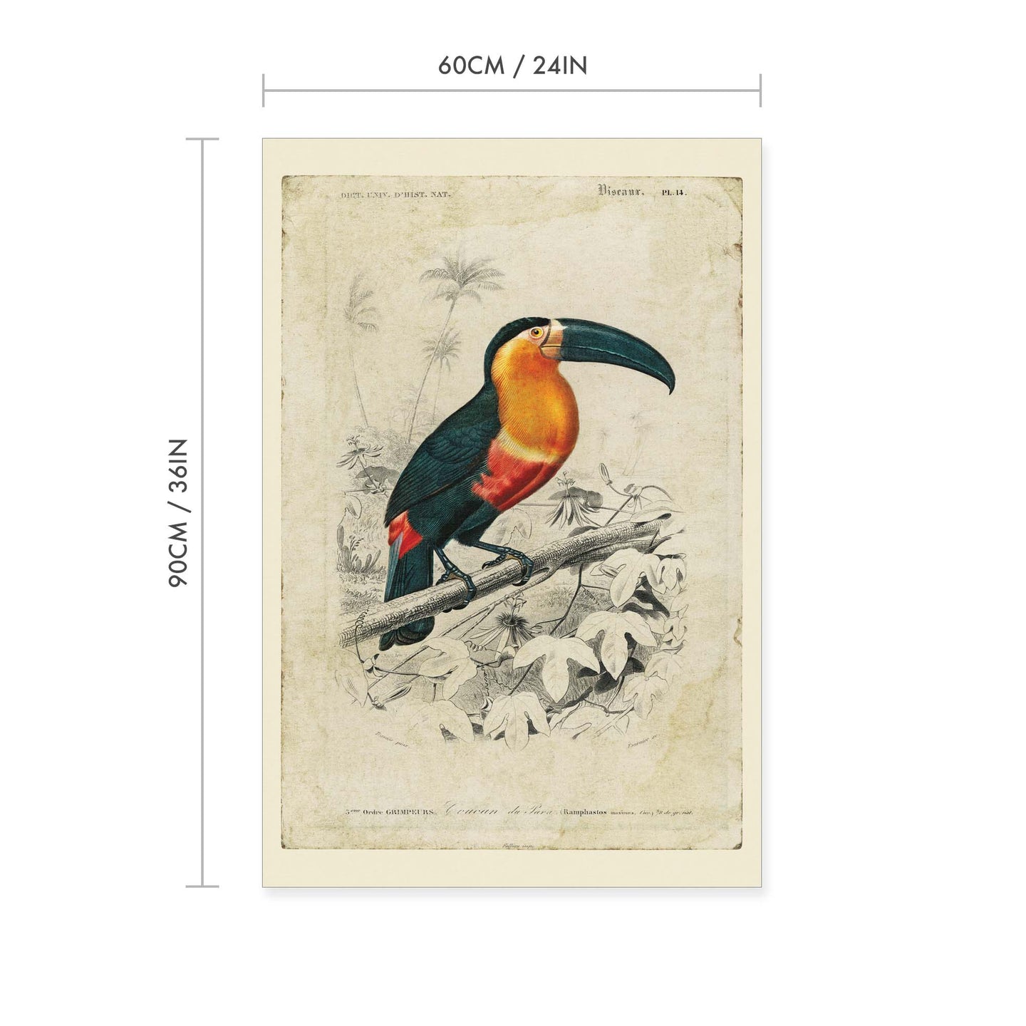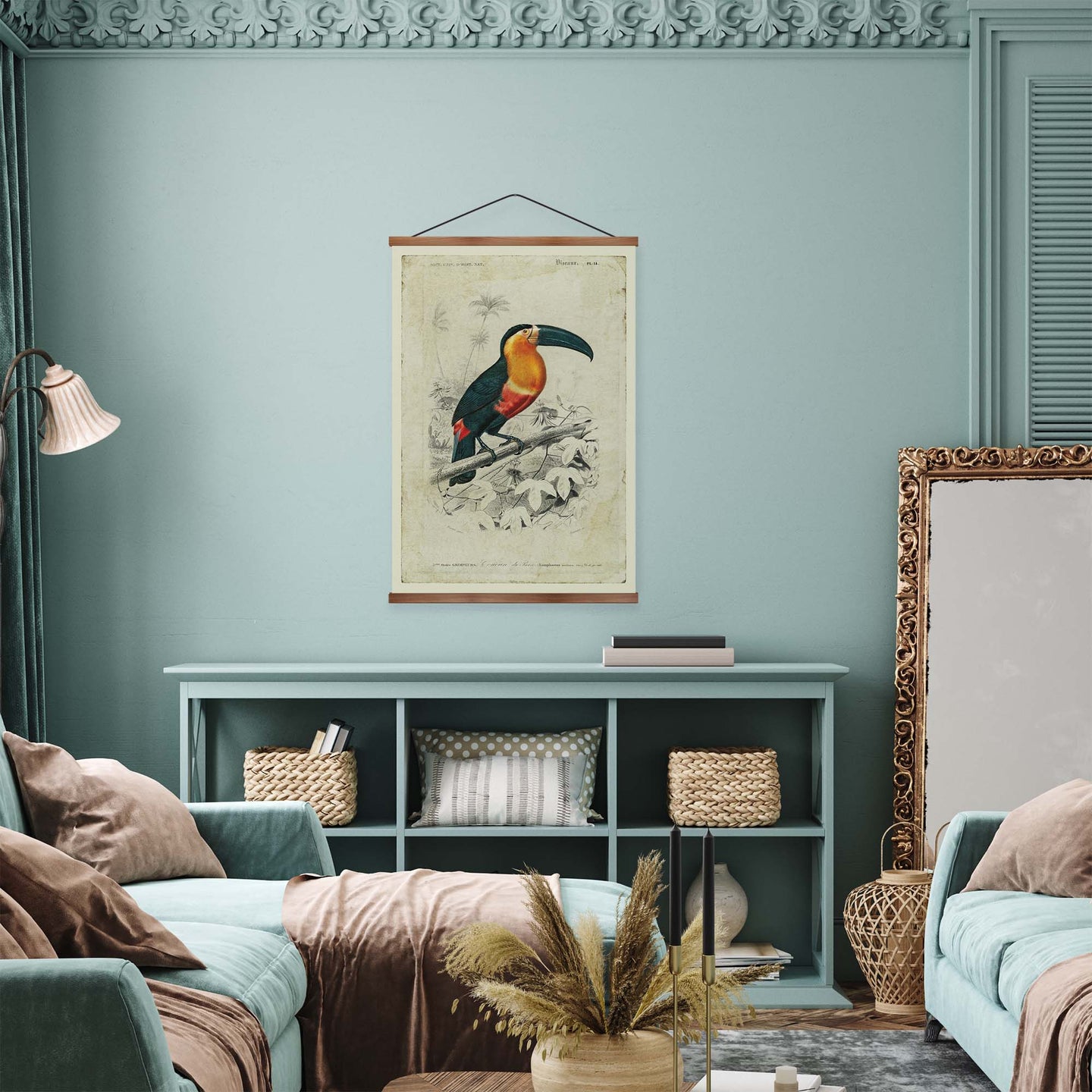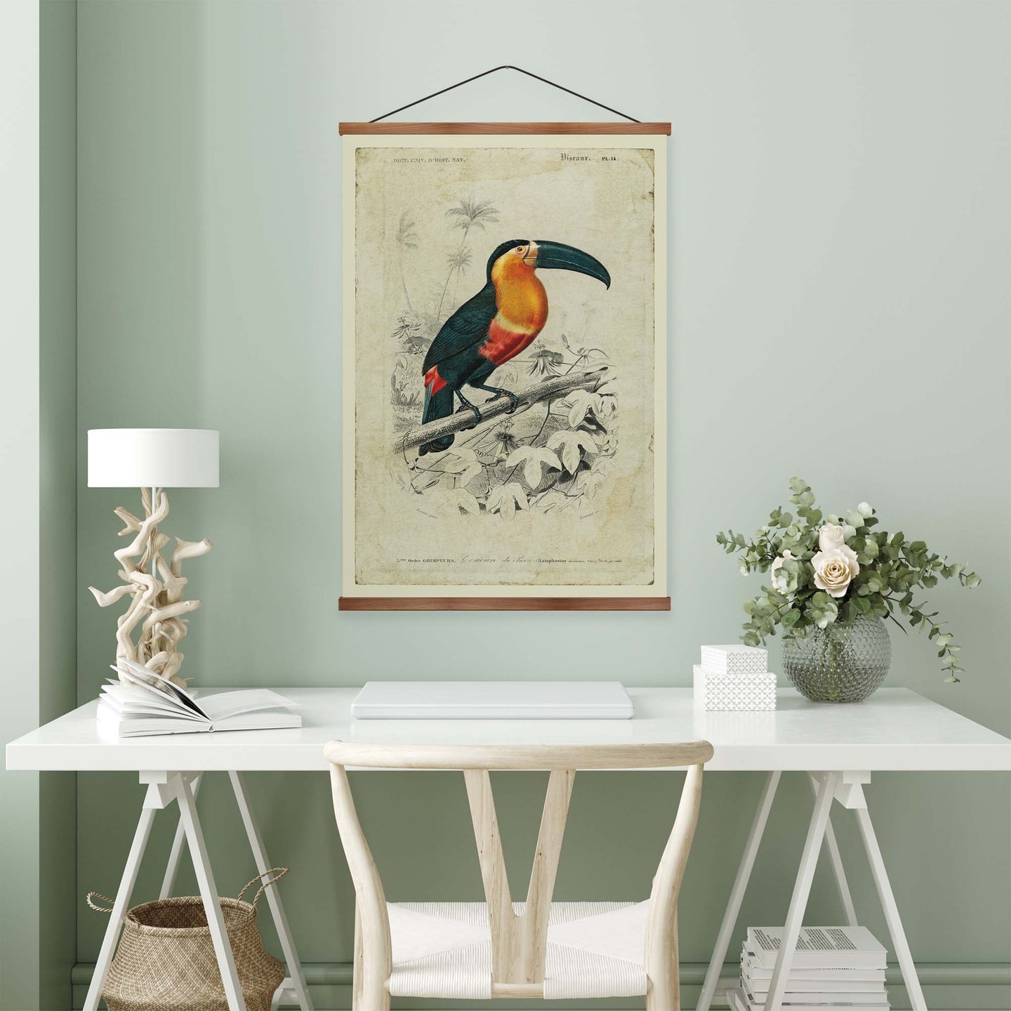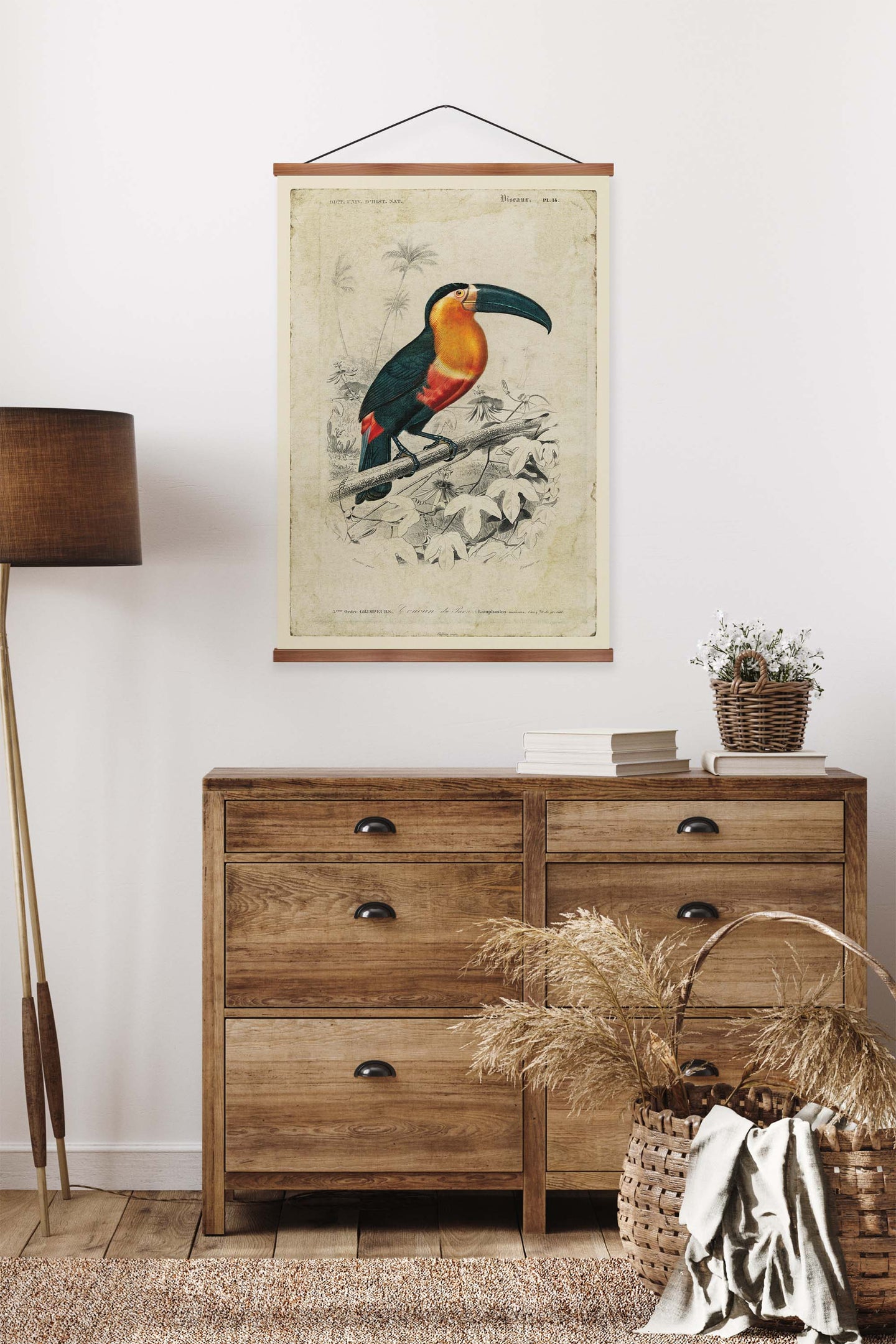 Create an instant room transformation, with the canvas tapestry print: 'Toucan Vintage Print'. Printed on luxury 260g canvas, Tapestro canvas tapestries hang from magnetic wooden holders, in either teak or black wood. Supplied with a teak hanger. This print measures: 60cm x 90cm (24in x 36in). For each item sold, one tree is planted. This helps to offset carbon released during production and shipping, and to create a net positive contribution over the tree's lifetime. Transform your home, and our planet.
