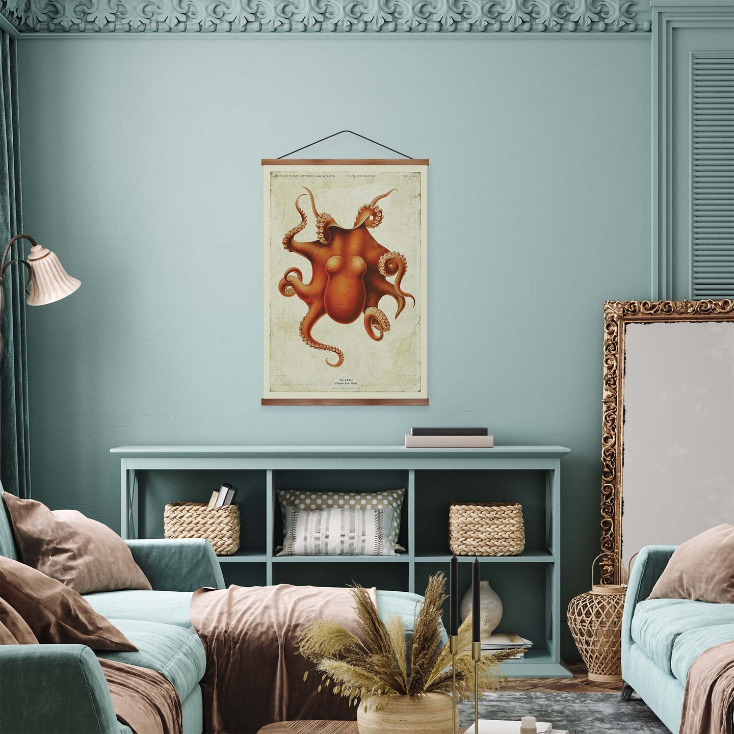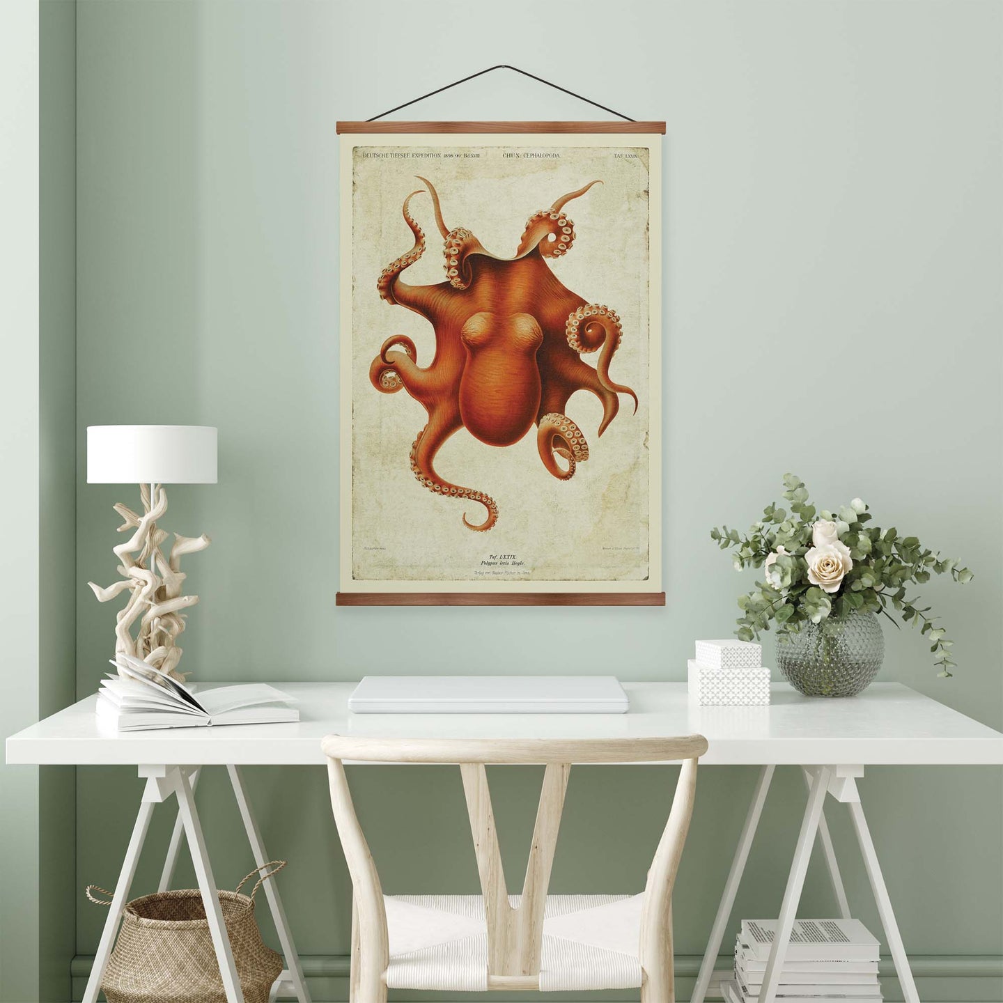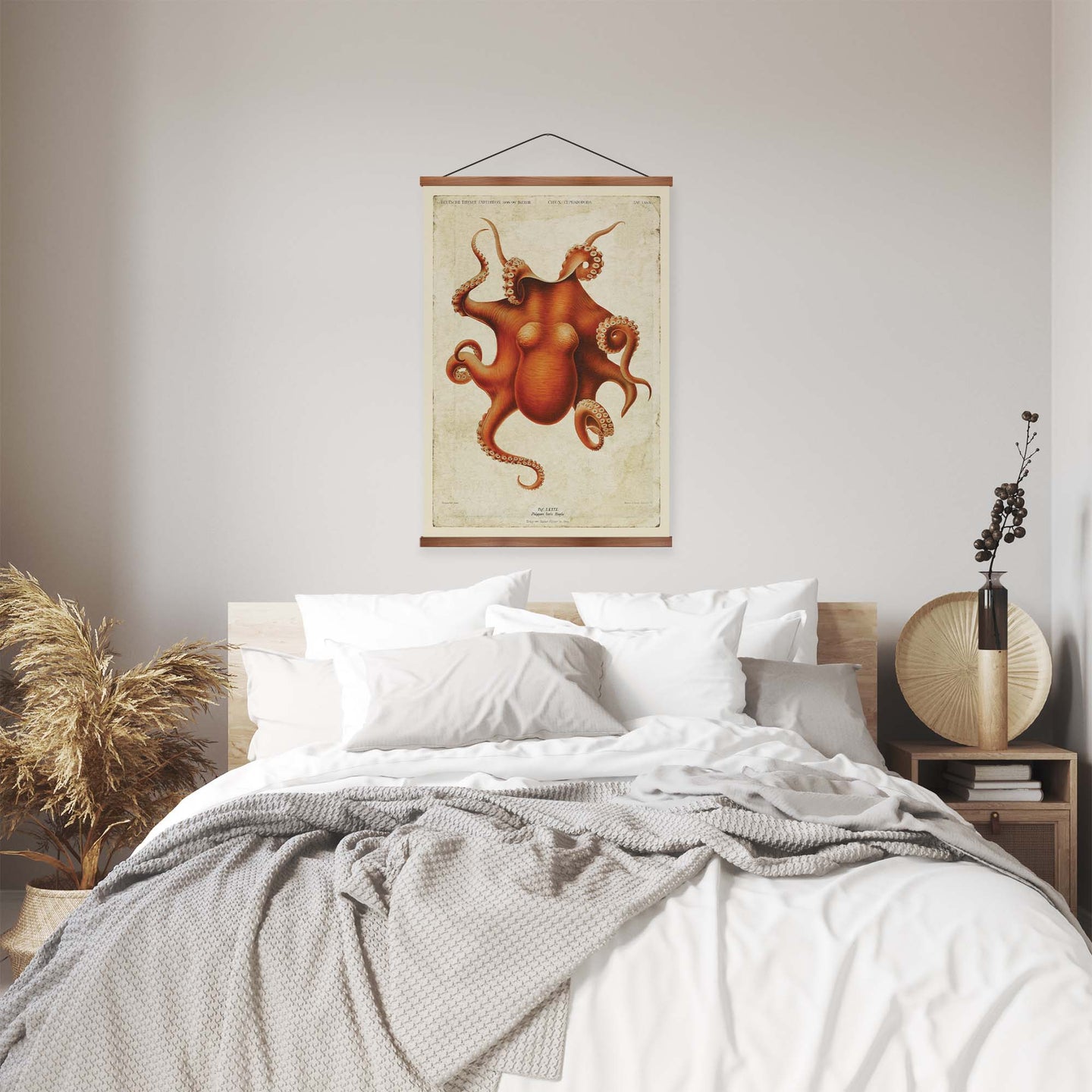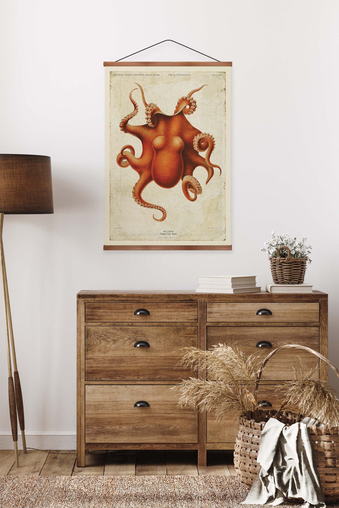 Create an instant room transformation, with the canvas tapestry print: 'Octopus Vintage Print'. Printed on luxury 260g canvas, Tapestro canvas tapestries hang from magnetic wooden holders, in either teak or black wood. Supplied with a teak hanger. This print measures: 60cm x 90cm (24in x 36in). For each item sold, one tree is planted. This helps to offset carbon released during production and shipping, and to create a net positive contribution over the tree's lifetime. Transform your home, and our planet.