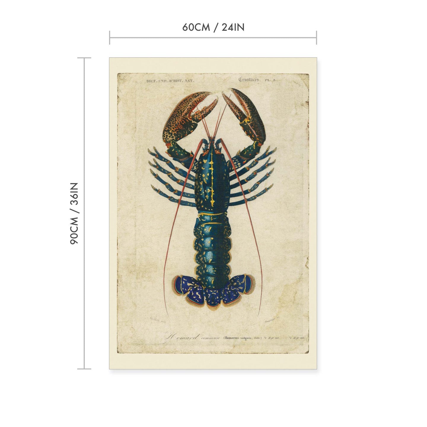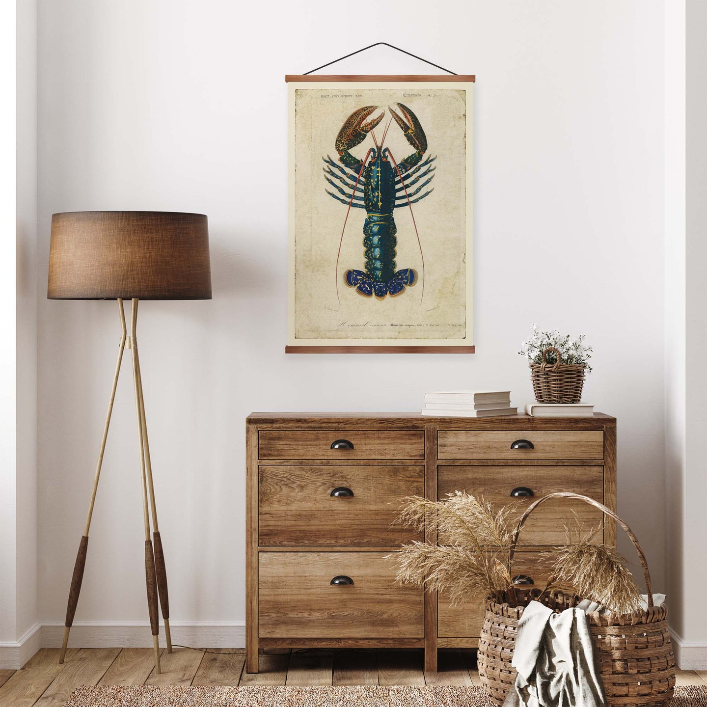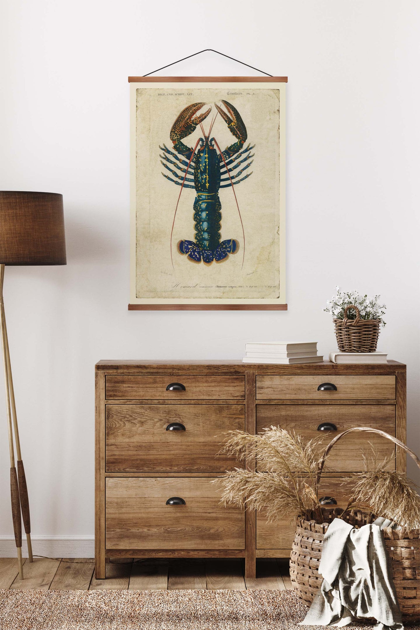 Create an instant room transformation, with the canvas tapestry print: 'Blue Lobster Vintage Print'. Printed on luxury 260g canvas, Tapestro canvas tapestries hang from magnetic wooden holders, in either teak or black wood. Supplied with a teak hanger. This print measures: 60cm x 90cm (24in x 36in). For each item sold, one tree is planted. This helps to offset carbon released during production and shipping, and to create a net positive contribution over the tree's lifetime. Transform your home, and our planet.