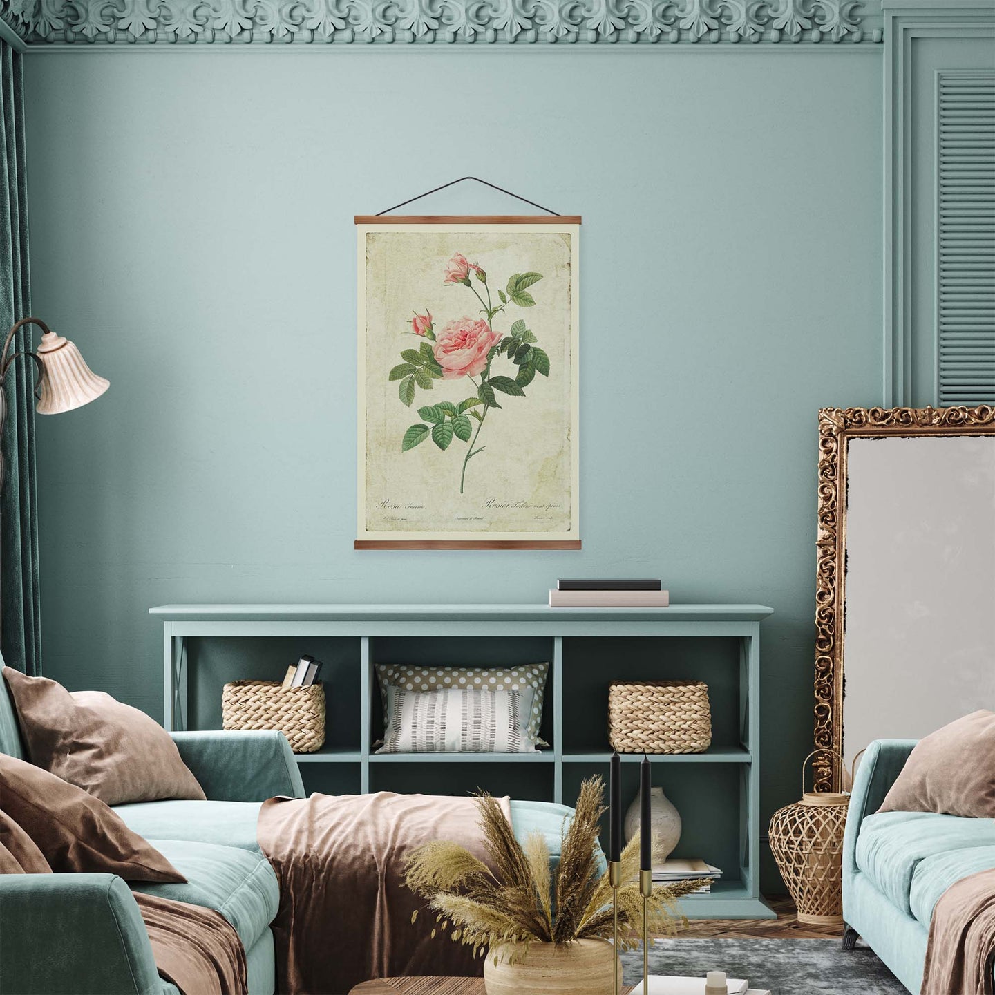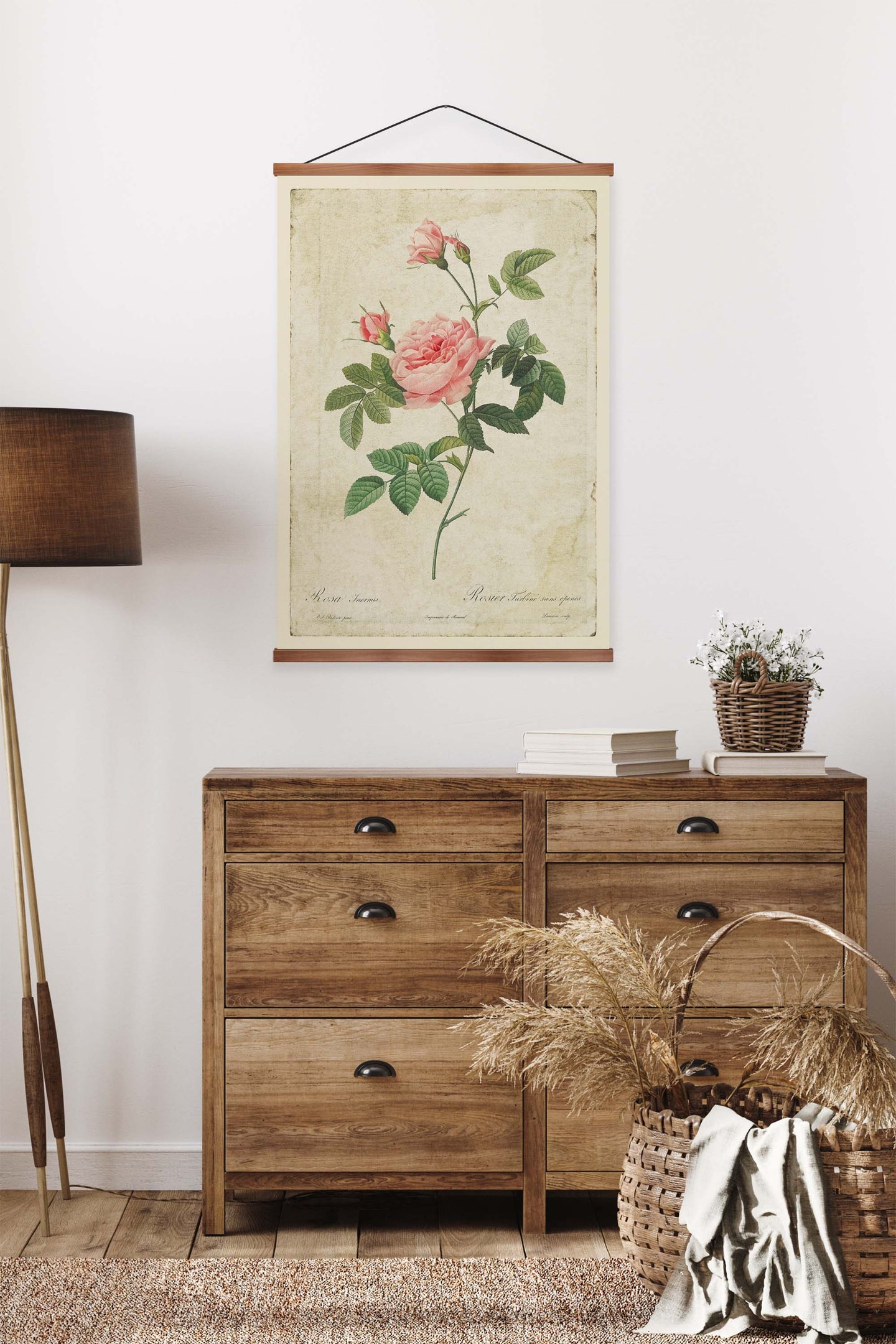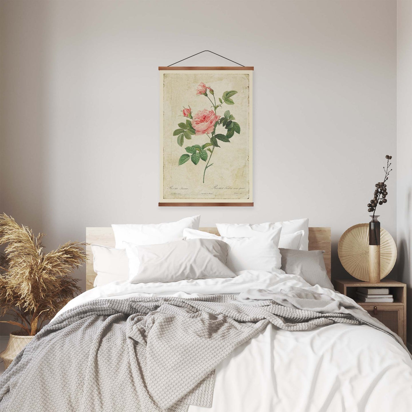 Create an instant room transformation, with the canvas tapestry print: 'Boursault Rose Vintage Print'. Printed on luxury 260g canvas, Tapestro canvas tapestries hang from magnetic wooden holders, in either teak or black wood. Supplied with a teak hanger. This print measures: 60cm x 90cm (24in x 36in). For each item sold, one tree is planted. This helps to offset carbon released during production and shipping, and to create a net positive contribution over the tree's lifetime. Transform your home, and our planet.