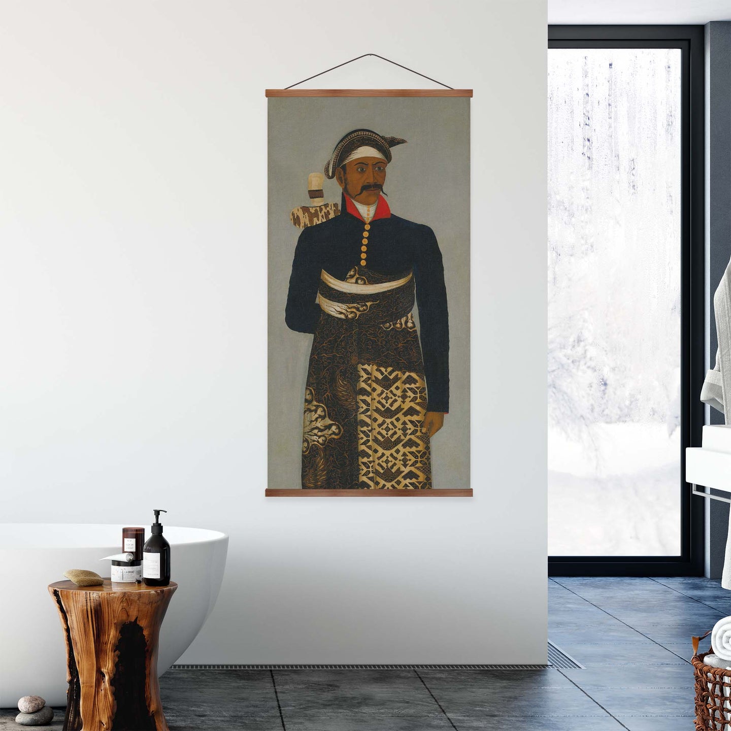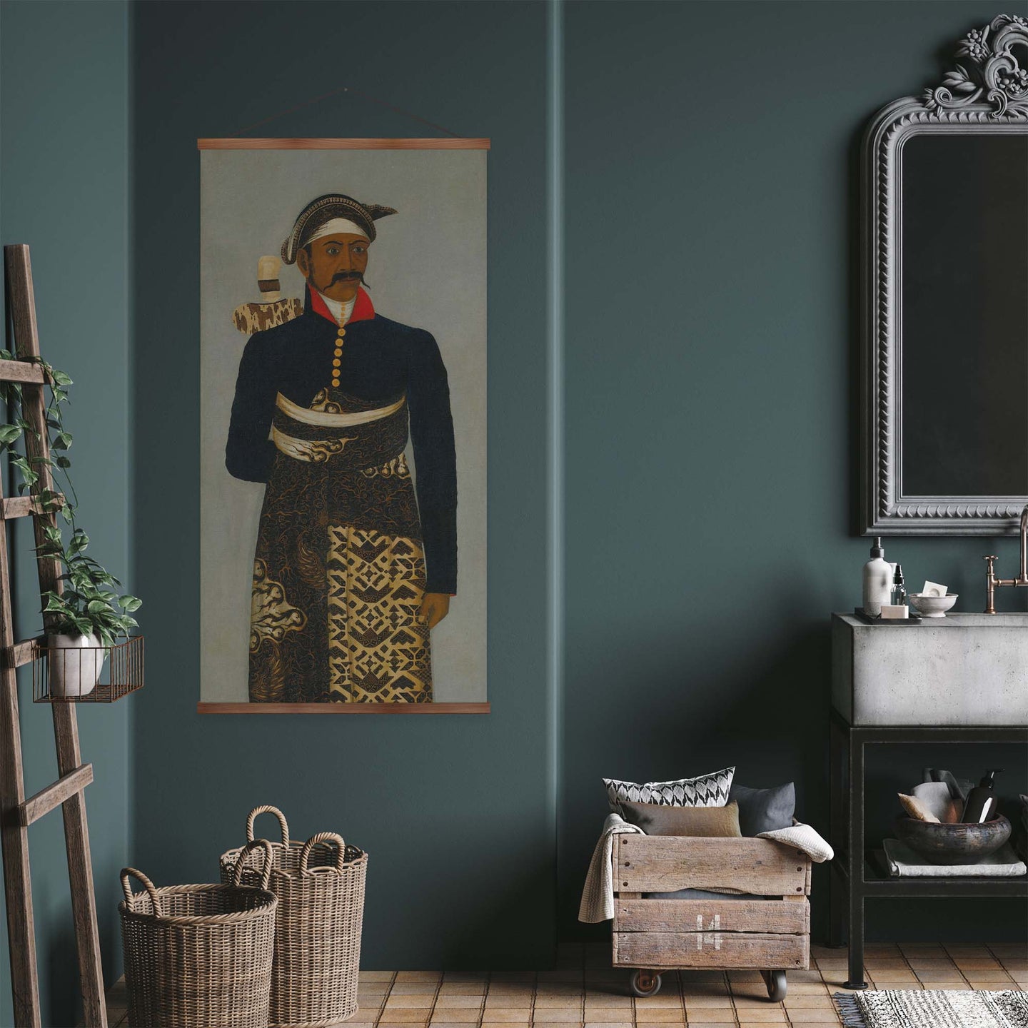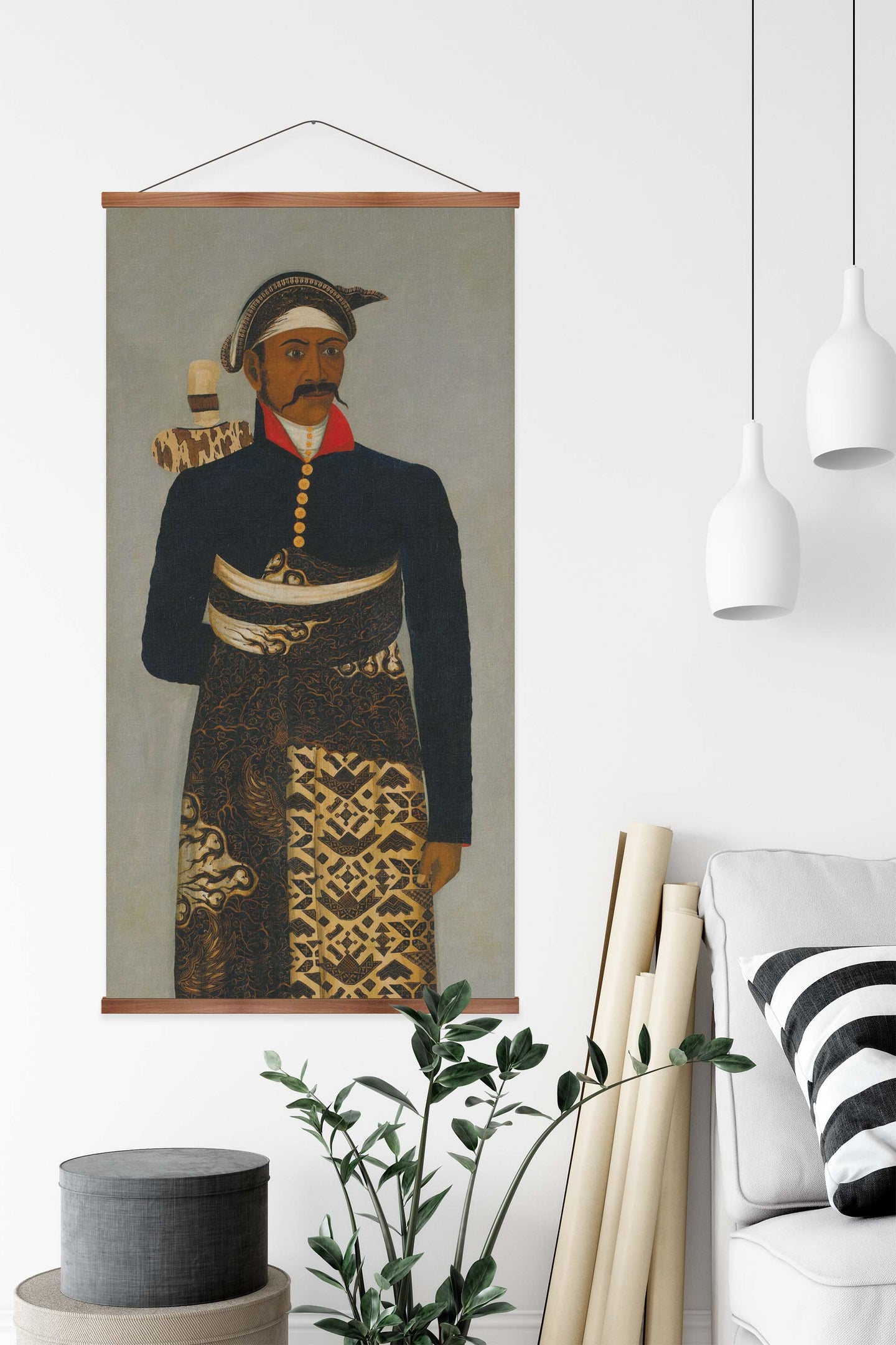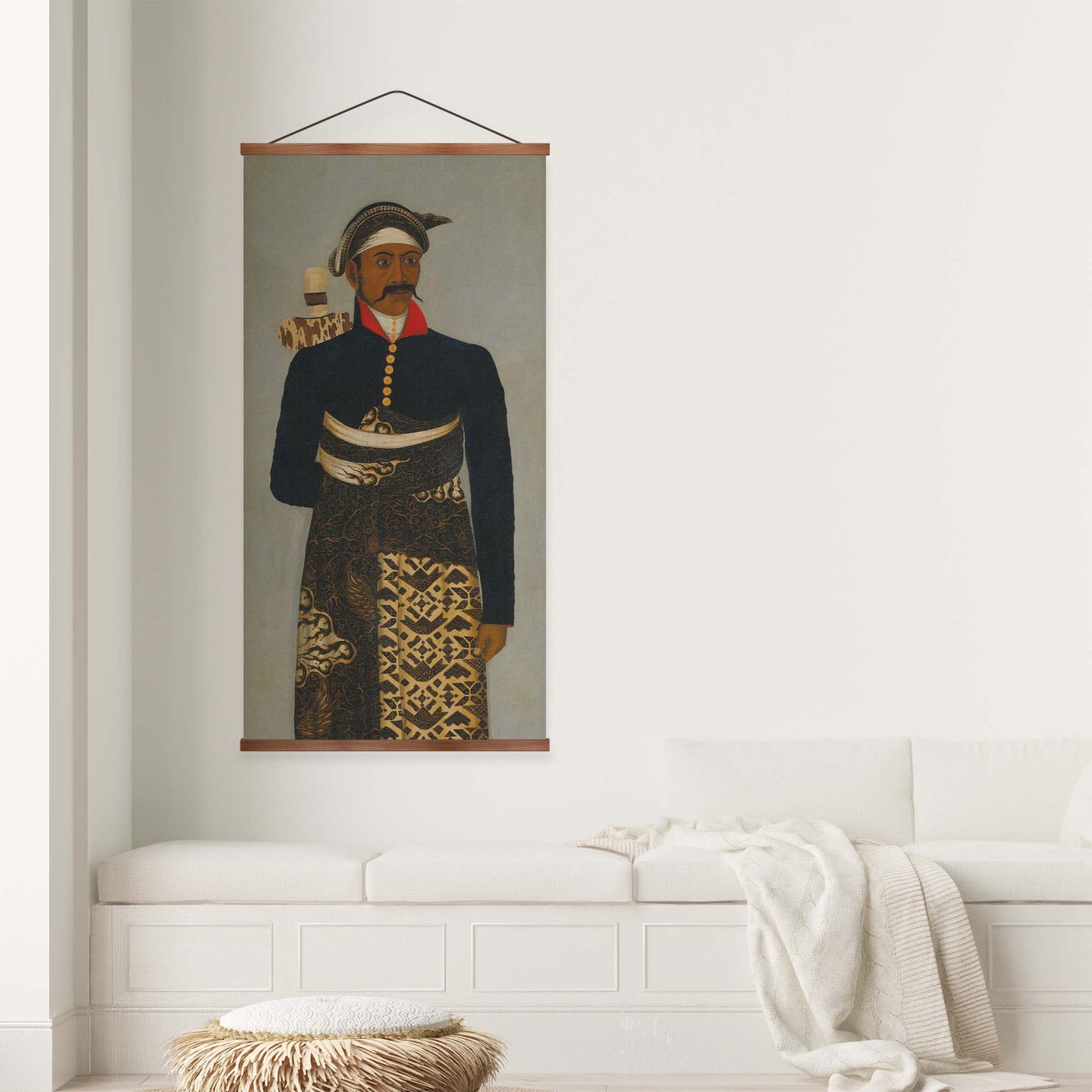 Create an instant room transformation, with the canvas tapestry print: 'Men of the Javanese Court II'. Printed on luxury 260g canvas, Tapestro canvas tapestries hang from magnetic wooden holders, in either teak or black wood. Supplied with a teak hanger. This print measures: 60cm x 120cm (24in x 47in). For each item sold, one tree is planted. This helps to offset carbon released during production and shipping, and to create a net positive contribution over the tree's lifetime. Transform your home, and our planet.