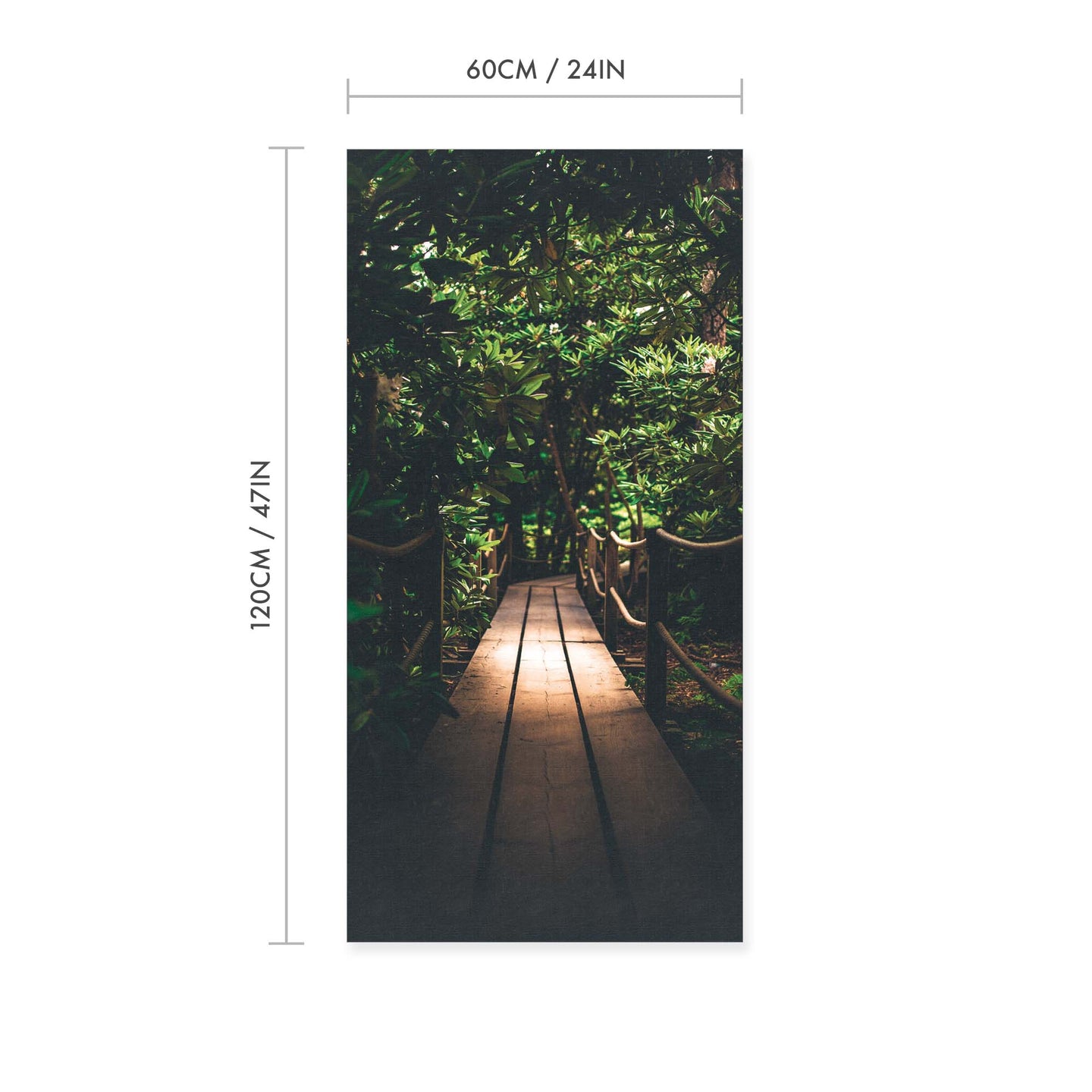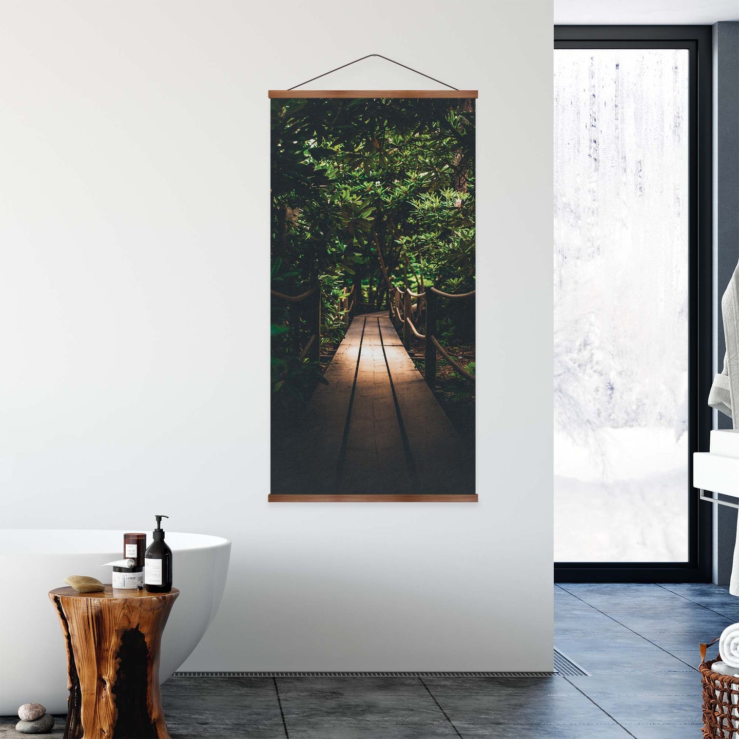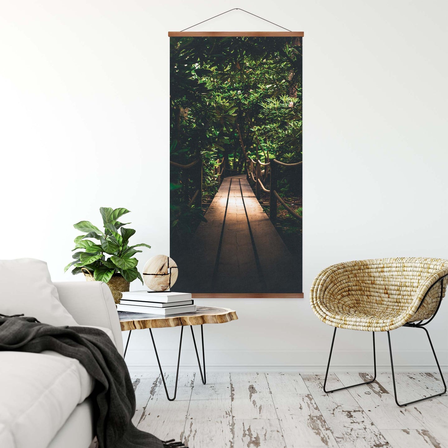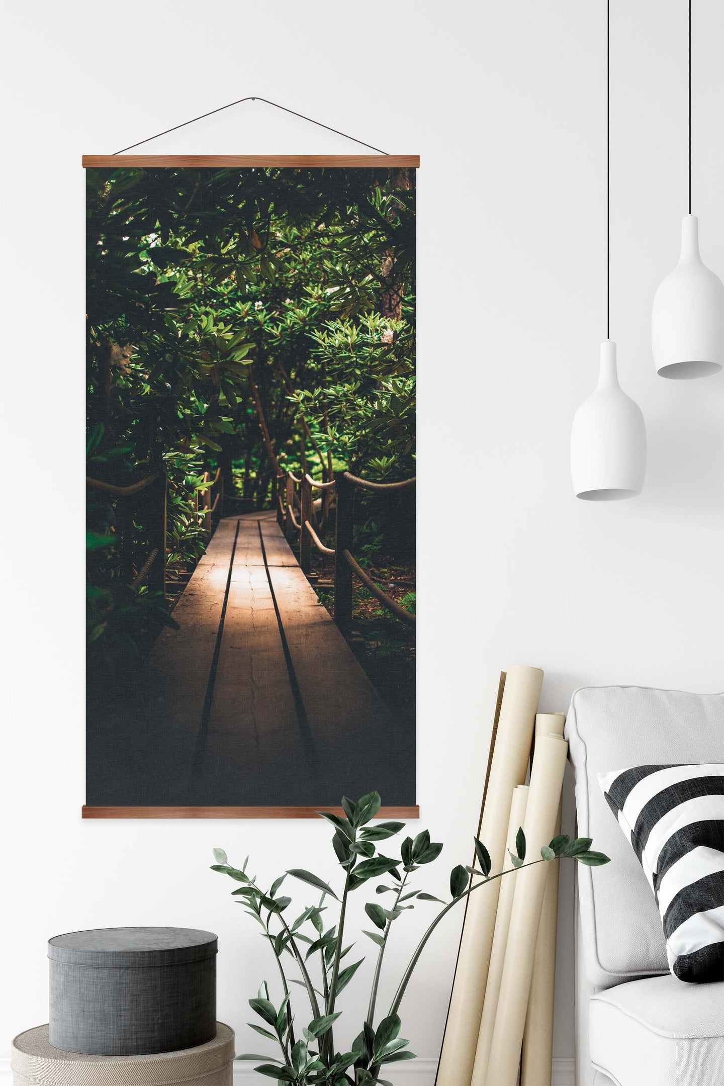 Create an instant room transformation, with the canvas tapestry print: 'Jardin Walk'. Printed on luxury 260g canvas, Tapestro canvas tapestries hang from magnetic wooden holders, in either teak or black wood. Supplied with a teak hanger. This print measures: 60cm x 120cm (24in x 47in). For each item sold, one tree is planted. This helps to offset carbon released during production and shipping, and to create a net positive contribution over the tree's lifetime. Transform your home, and our planet.