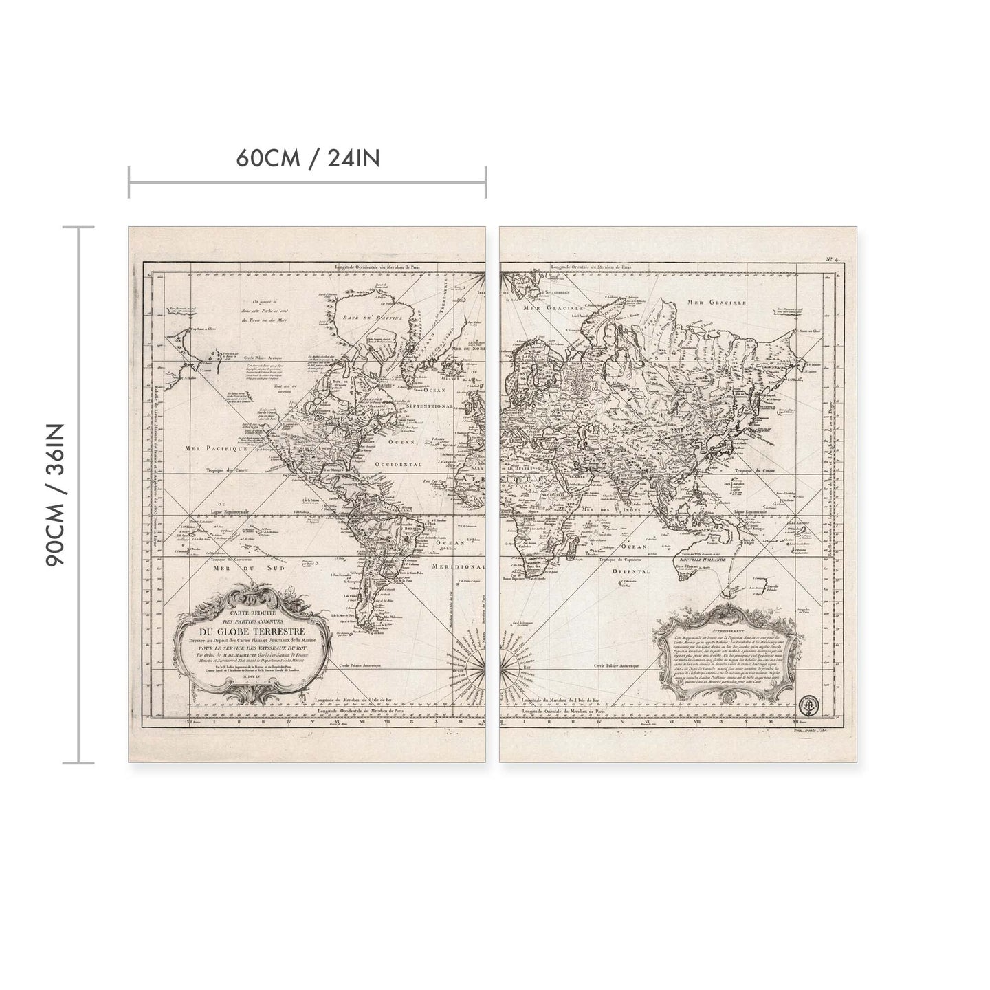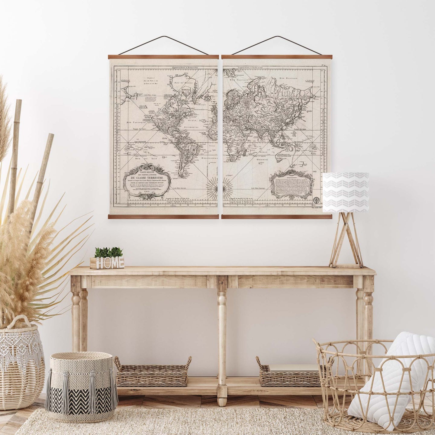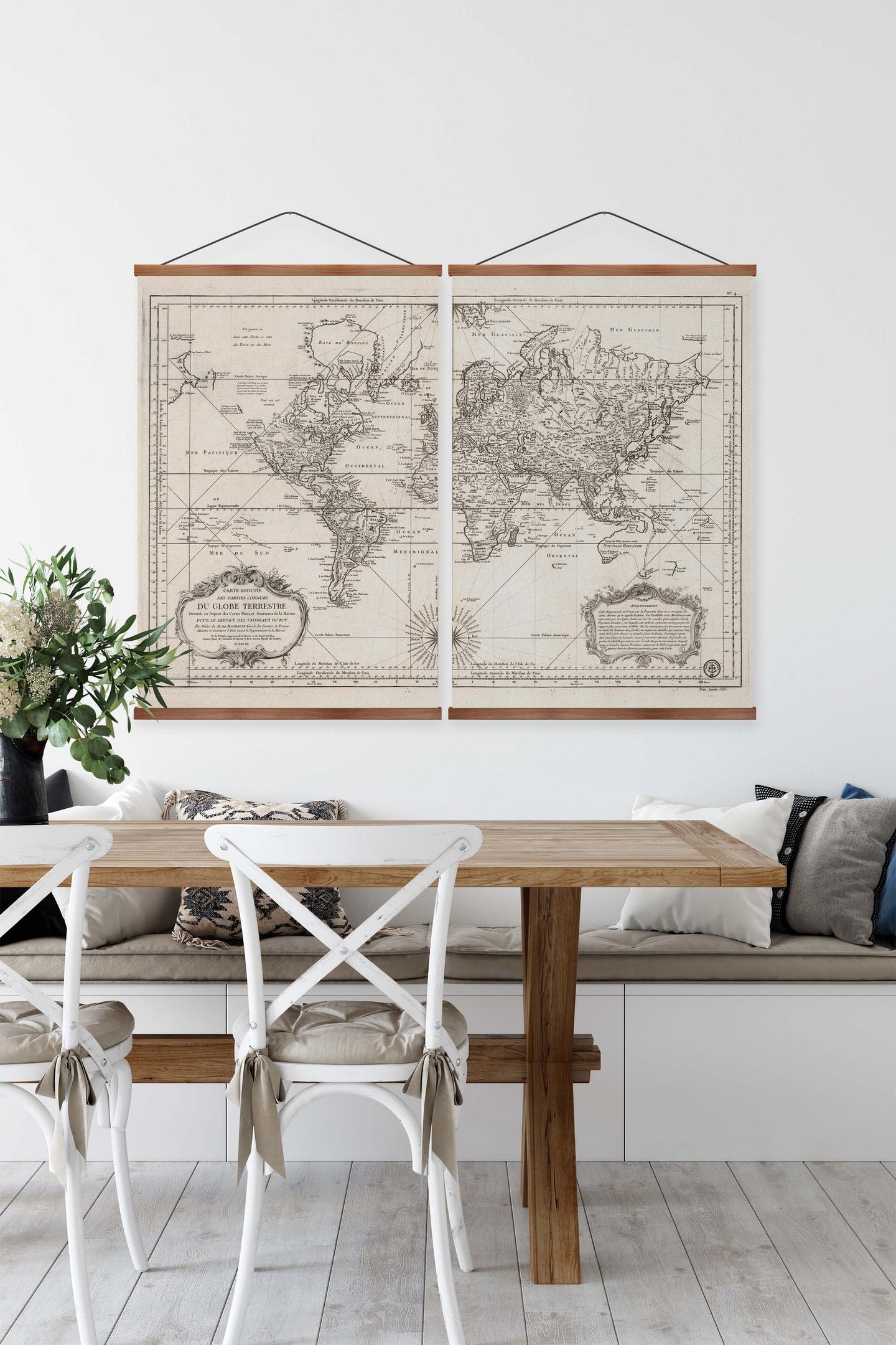 Create an instant room transformation, with the canvas tapestry print: 'Du Globe Terrestre Vintage Map'. Printed on luxury 260g canvas, Tapestro canvas tapestries hang from magnetic wooden holders, in either teak or black wood. Supplied with a teak hanger. This print measures: 120cm x 90cm (47in x 36in). Supplied in: 2 Panels. For each item sold, one tree is planted. This helps to offset carbon released during production and shipping, and to create a net positive contribution over the tree's lifetime. Transform your home, and our planet.