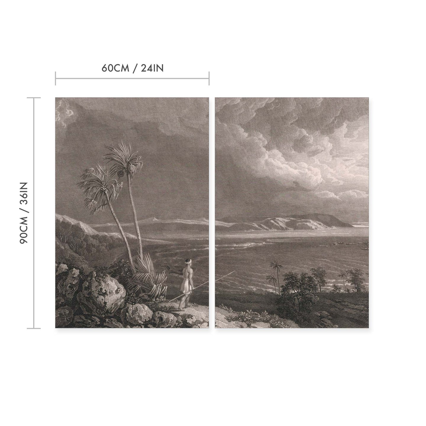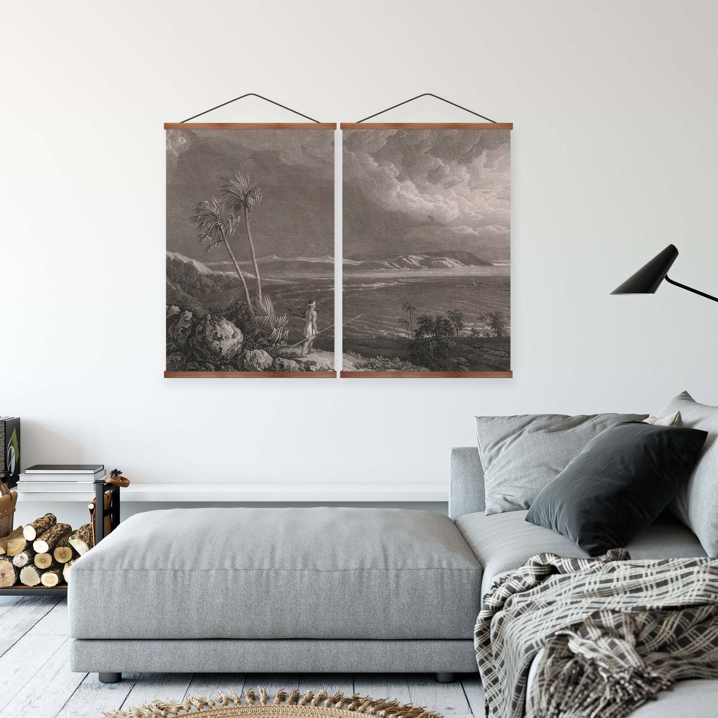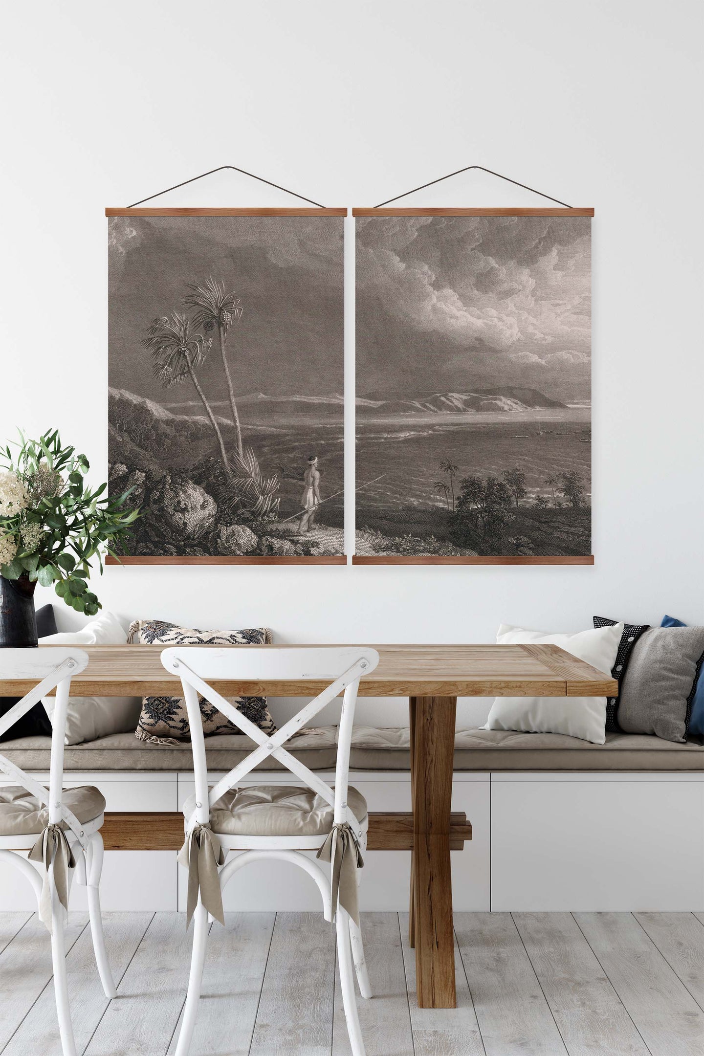 Create an instant room transformation, with the canvas tapestry print: 'Pobassoo's Island Vintage Gravure'. Printed on luxury 260g canvas, Tapestro canvas tapestries hang from magnetic wooden holders, in either teak or black wood. Supplied with a teak hanger. This print measures: 120cm x 90cm (47in x 36in). Supplied in: 2 Panels. For each item sold, one tree is planted. This helps to offset carbon released during production and shipping, and to create a net positive contribution over the tree's lifetime. Transform your home, and our planet.