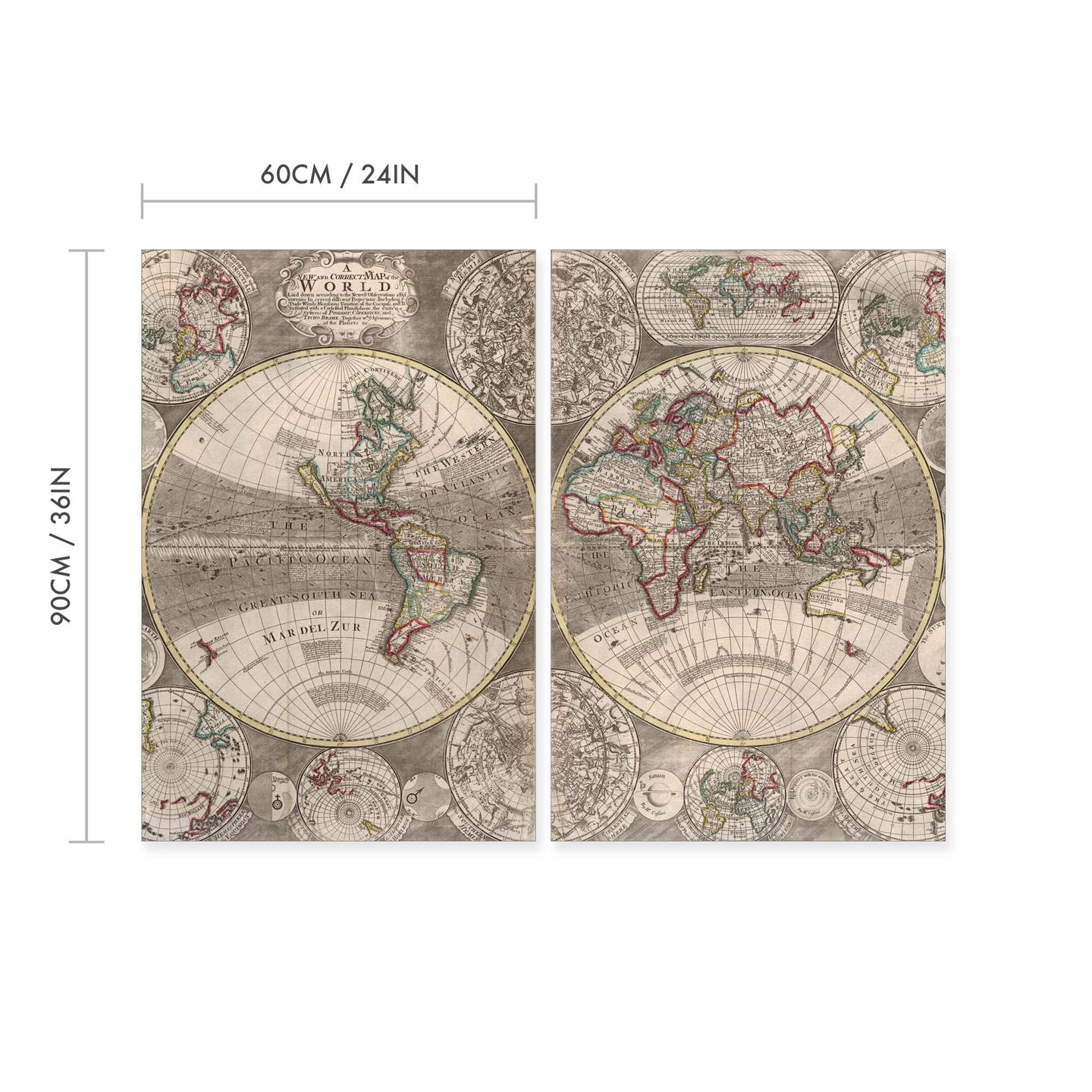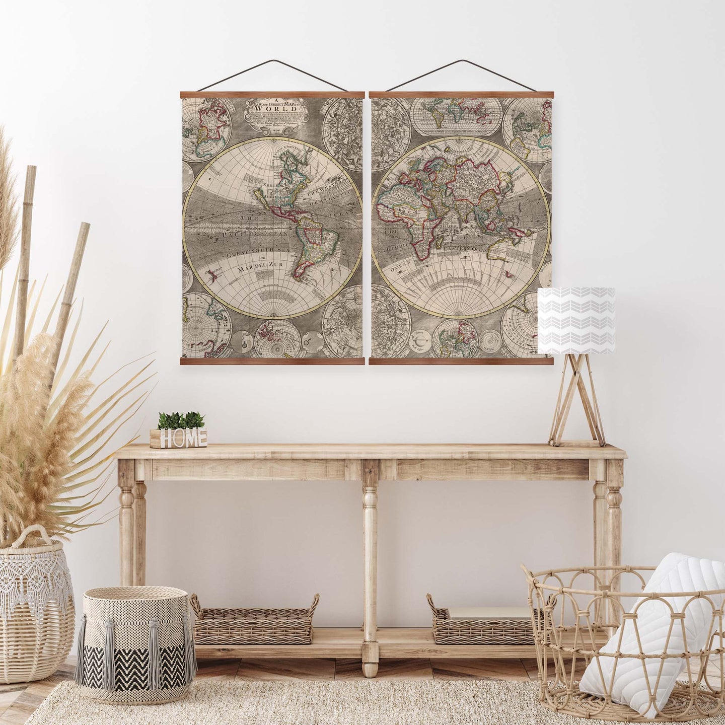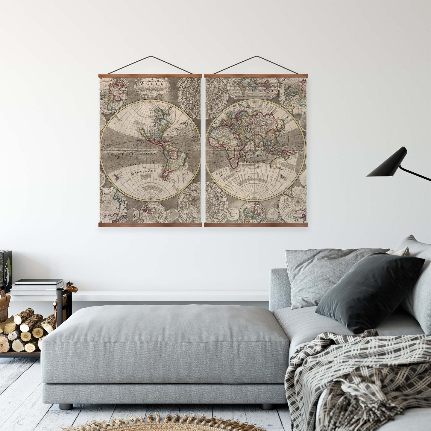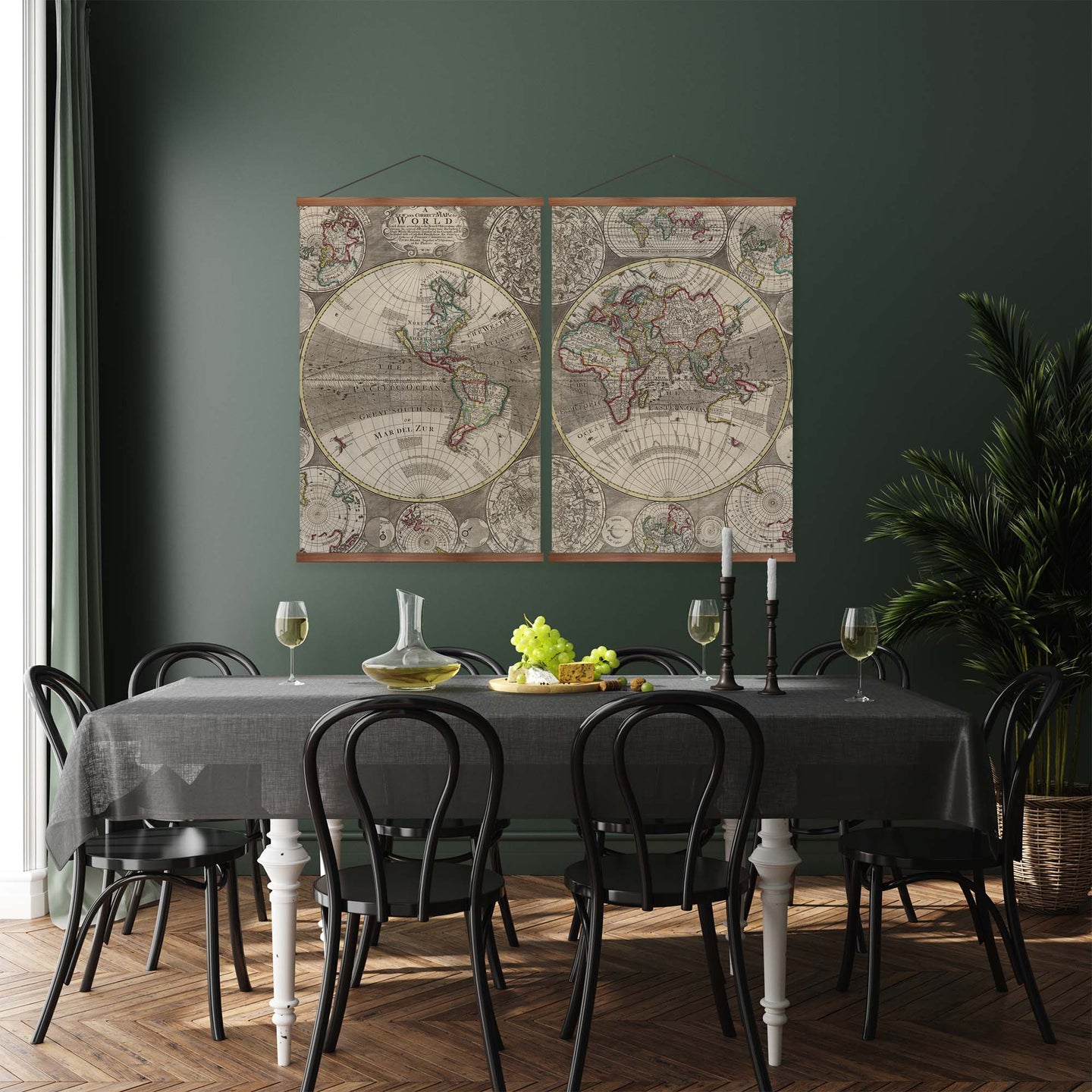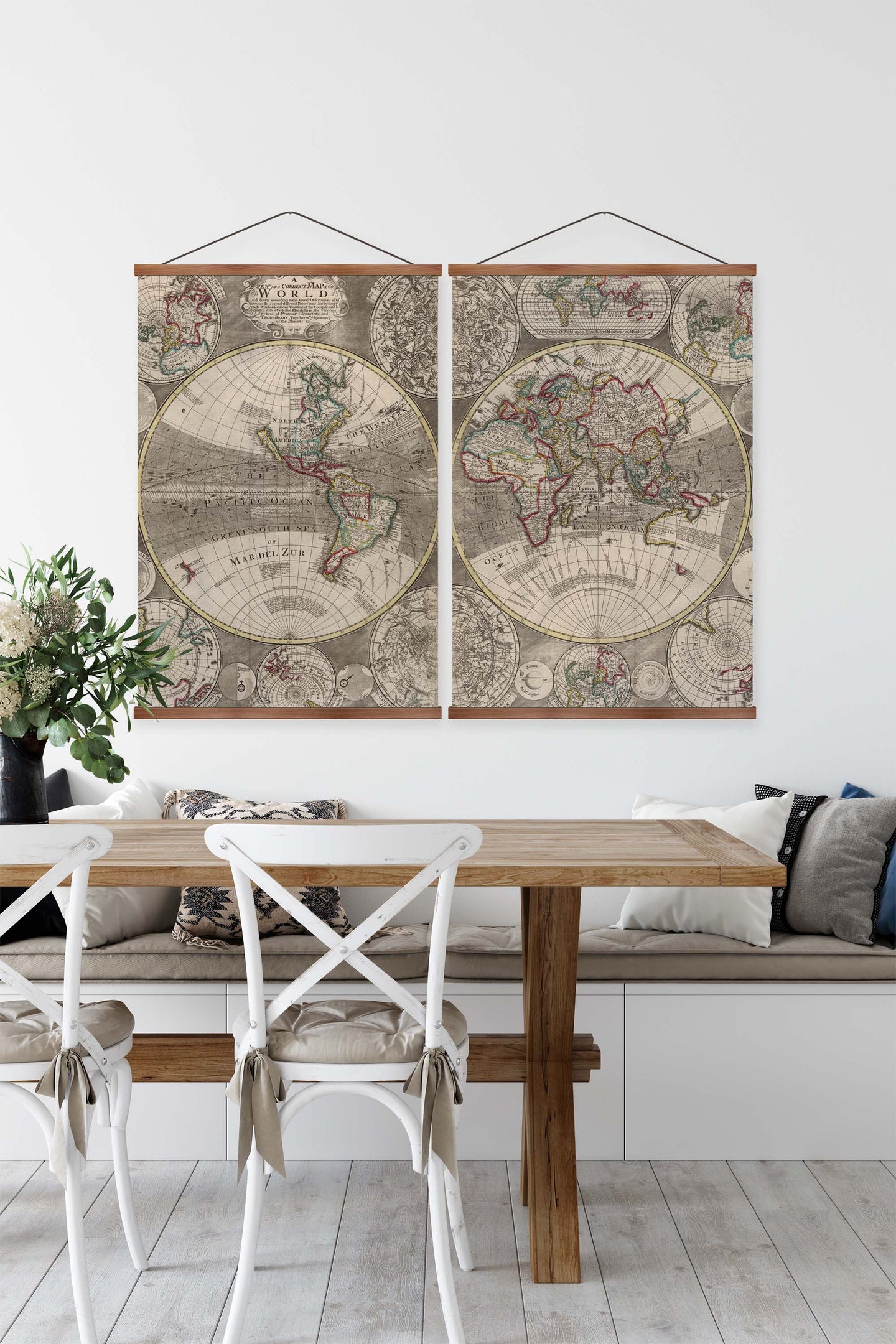 Create an instant room transformation, with the canvas tapestry print: 'Globus Vintage Map'. Printed on luxury 260g canvas, Tapestro canvas tapestries hang from magnetic wooden holders, in either teak or black wood. Supplied with a teak hanger. This print measures: 120cm x 90cm (47in x 36in). Supplied in: 2 Panels. For each item sold, one tree is planted. This helps to offset carbon released during production and shipping, and to create a net positive contribution over the tree's lifetime. Transform your home, and our planet.