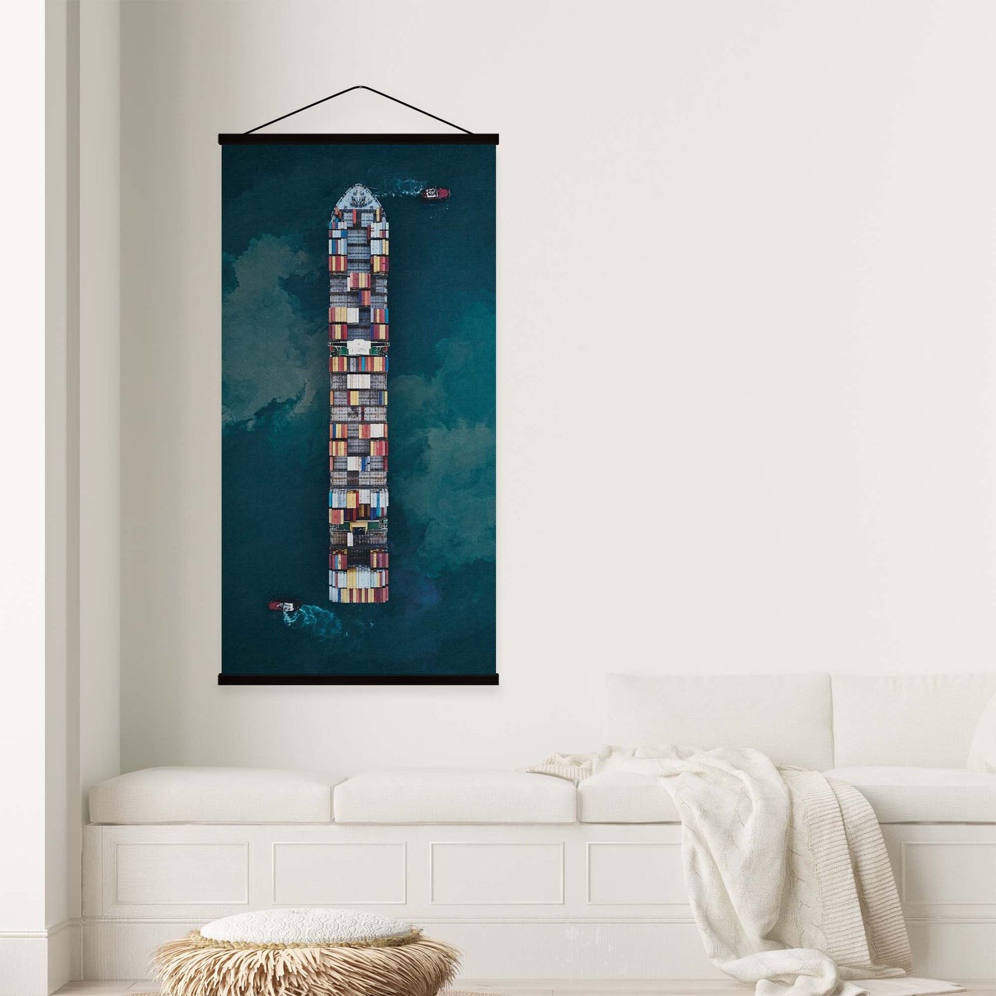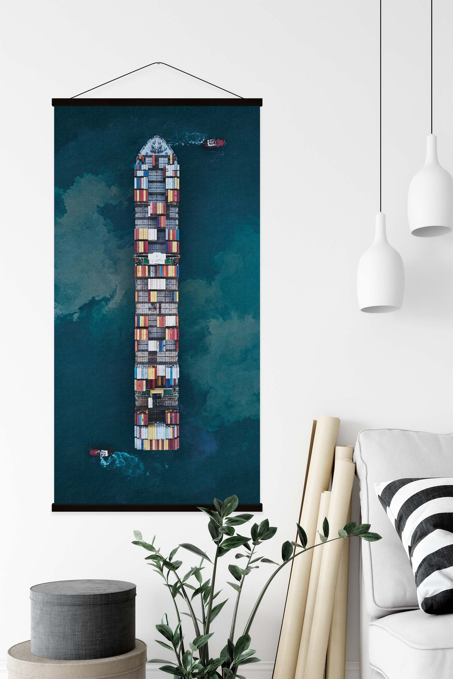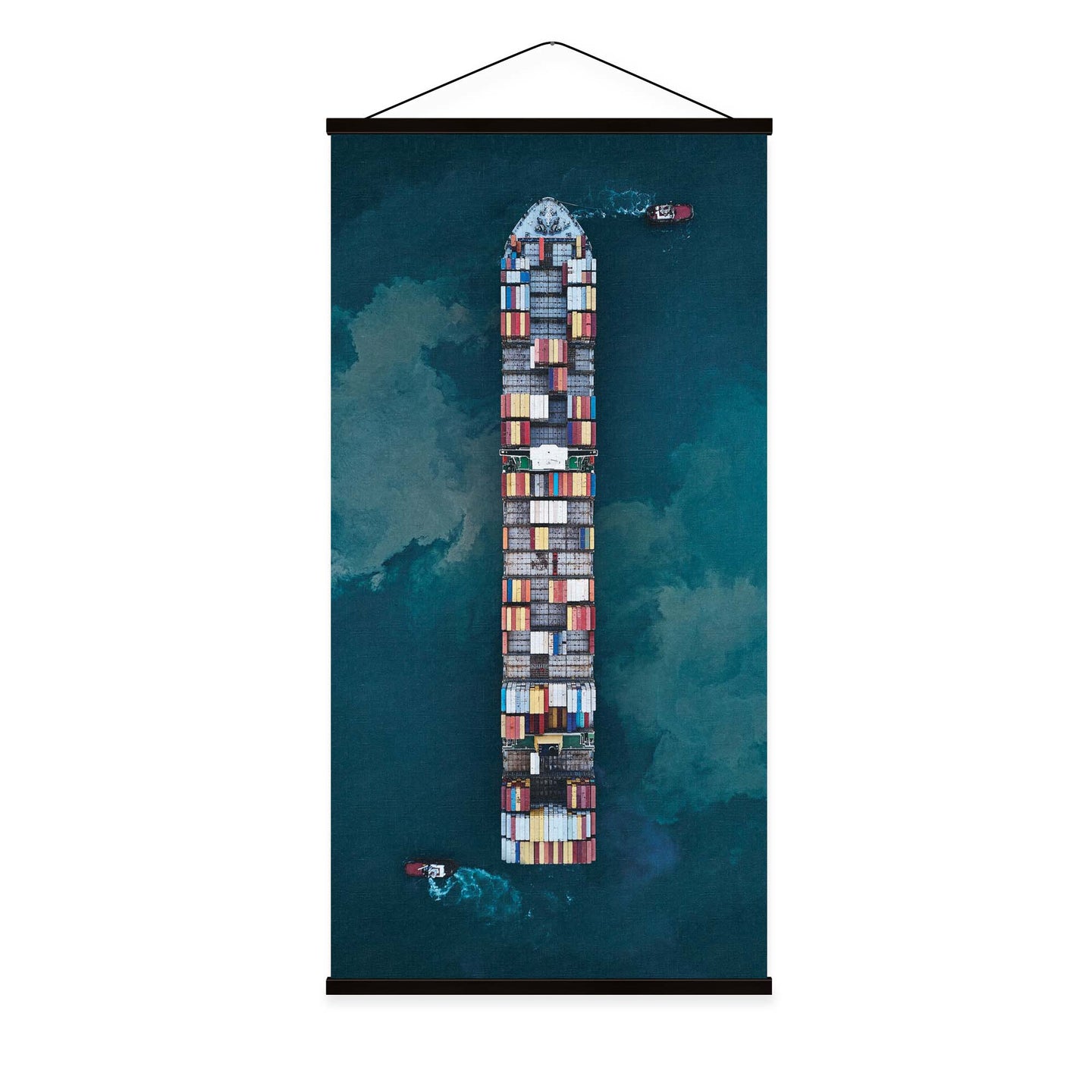 Create an instant room transformation, with the canvas tapestry print: 'Cargo by Davide Lopresti'. Printed on luxury 260g canvas, Tapestro canvas tapestries hang from magnetic wooden holders, in either teak or black wood. Supplied with a black hanger. This print measures: 60cm x 120cm (24in x 47in). For each item sold, one tree is planted. This helps to offset carbon released during production and shipping, and to create a net positive contribution over the tree's lifetime. Transform your home, and our planet.