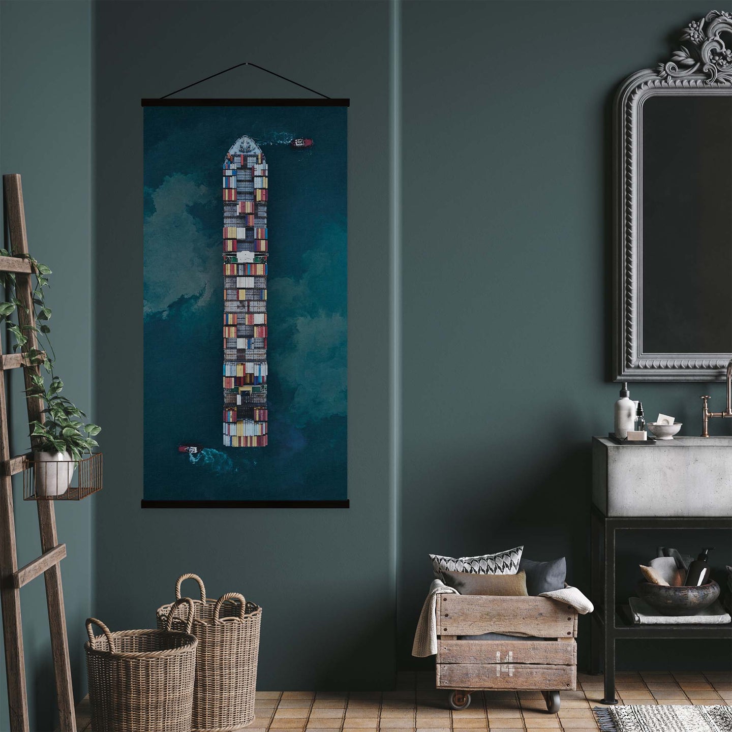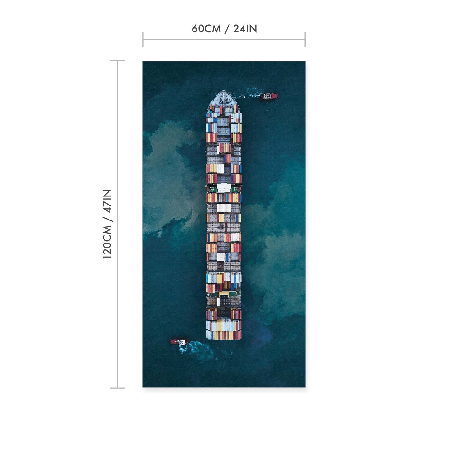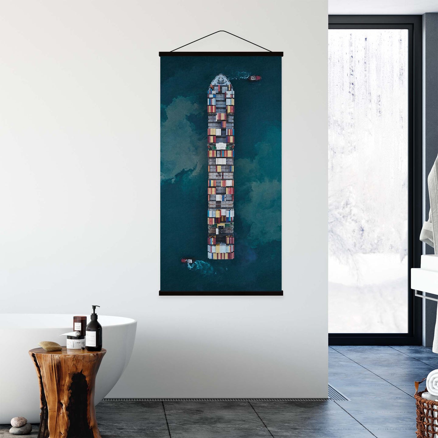 Create an instant room transformation, with the canvas tapestry print: 'Cargo by Davide Lopresti'. Printed on luxury 260g canvas, Tapestro canvas tapestries hang from magnetic wooden holders, in either teak or black wood. Supplied with a black hanger. This print measures: 60cm x 120cm (24in x 47in). For each item sold, one tree is planted. This helps to offset carbon released during production and shipping, and to create a net positive contribution over the tree's lifetime. Transform your home, and our planet.