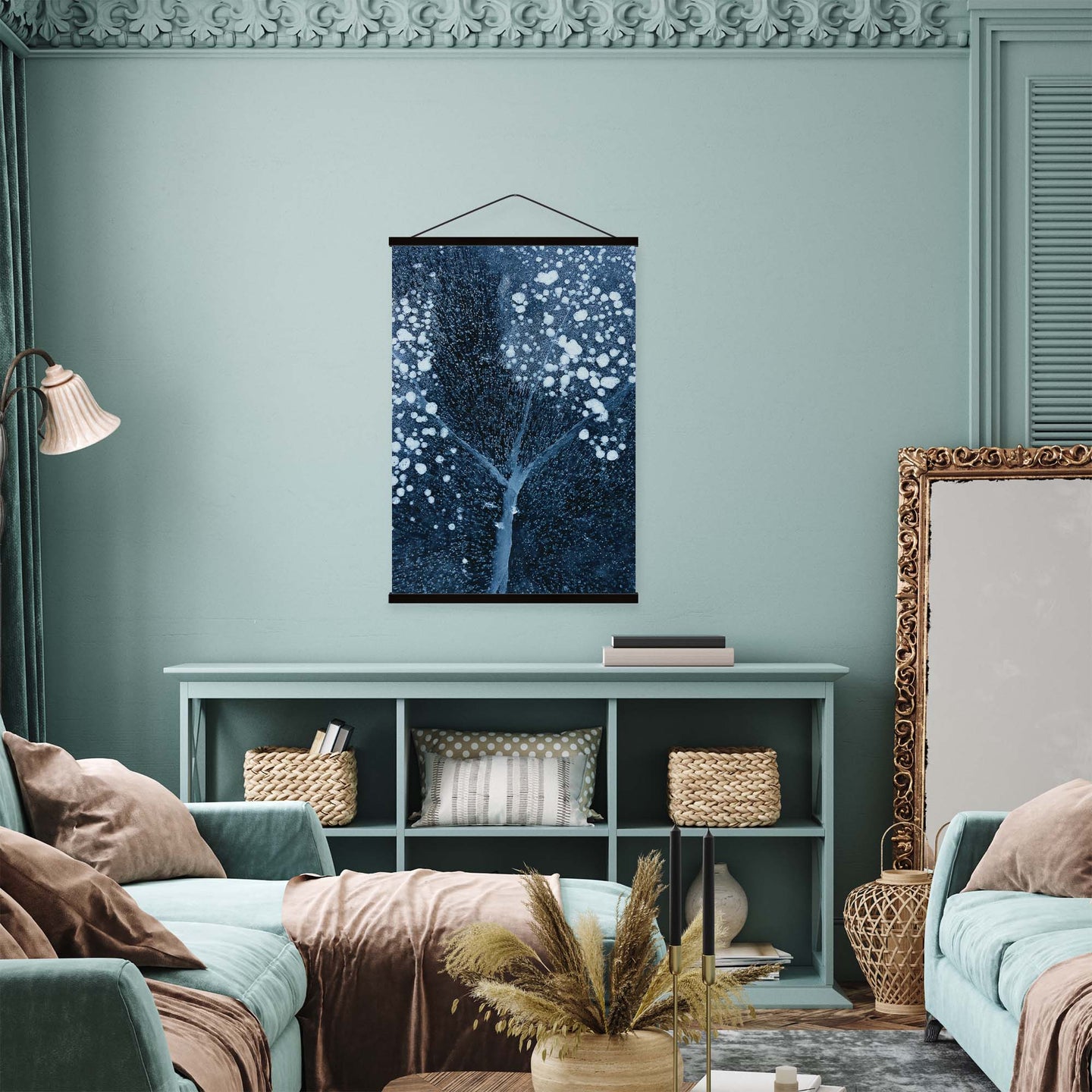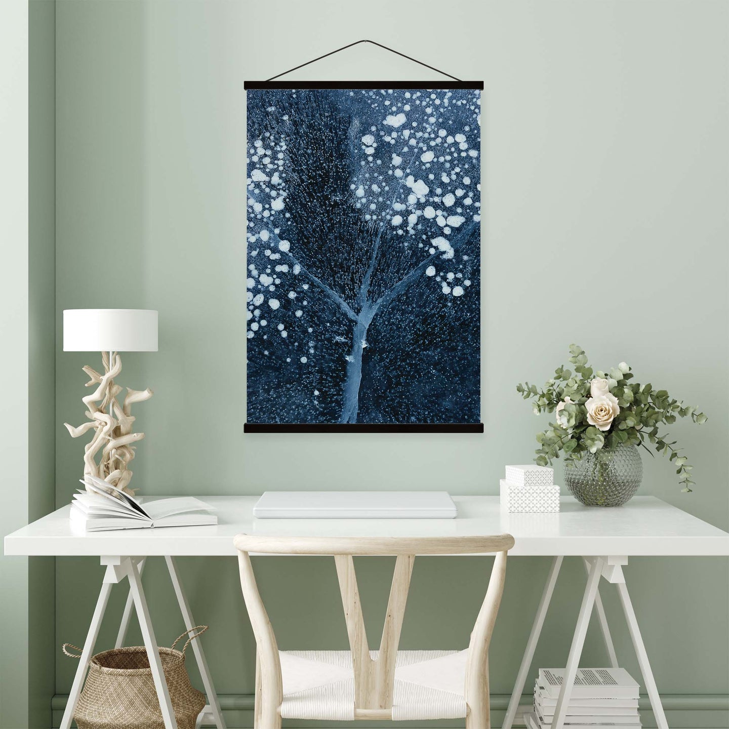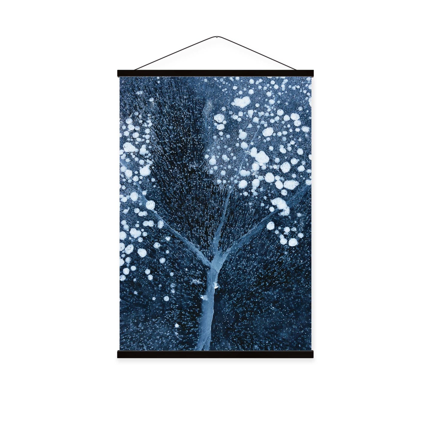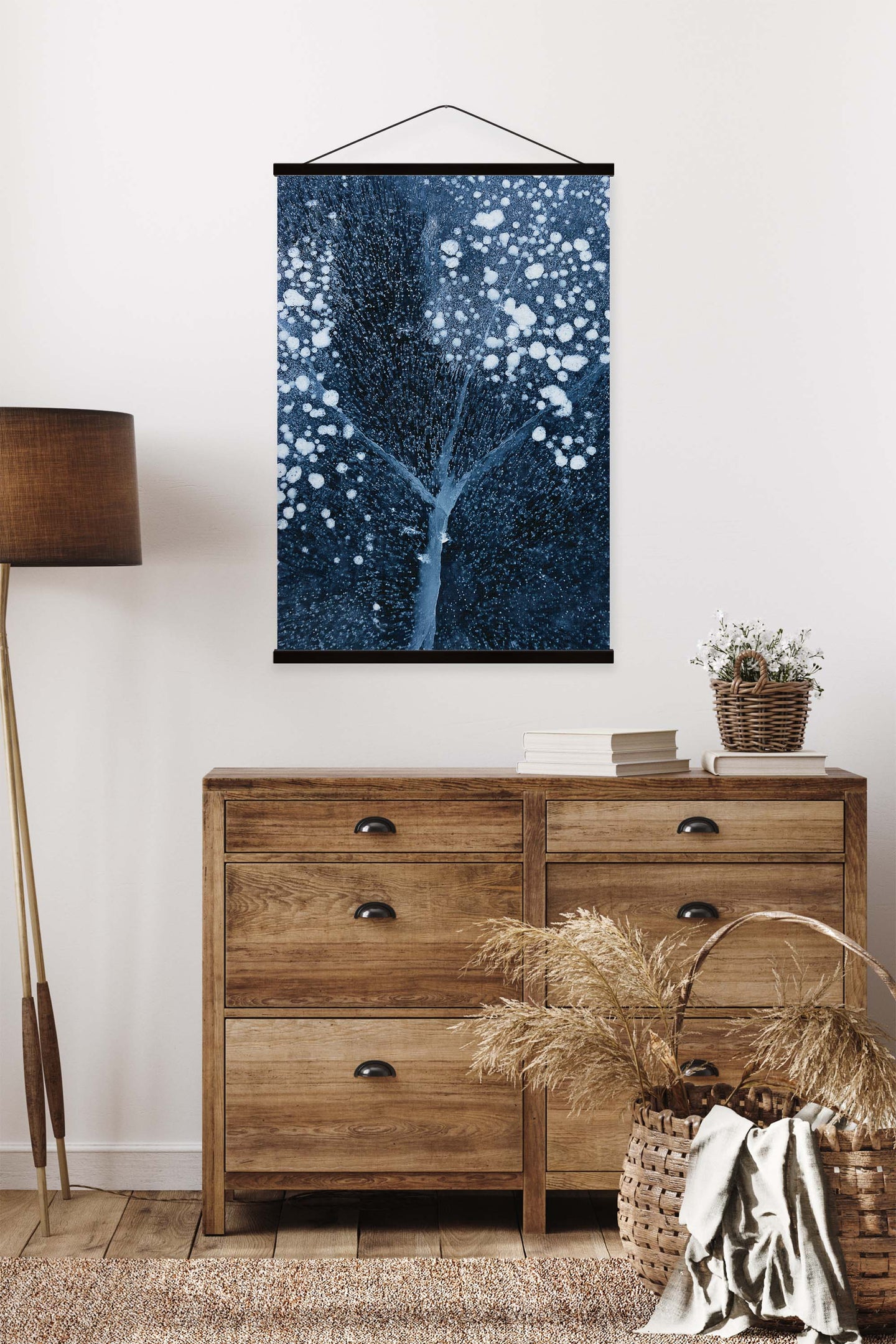 Create an instant room transformation, with the canvas tapestry print: 'Winter Blossom by Mei Xu'. Printed on luxury 260g canvas, Tapestro canvas tapestries hang from magnetic wooden holders, in either teak or black wood. Supplied with a black hanger. This print measures: 60cm x 90cm (24in x 36in). For each item sold, one tree is planted. This helps to offset carbon released during production and shipping, and to create a net positive contribution over the tree's lifetime. Transform your home, and our planet.